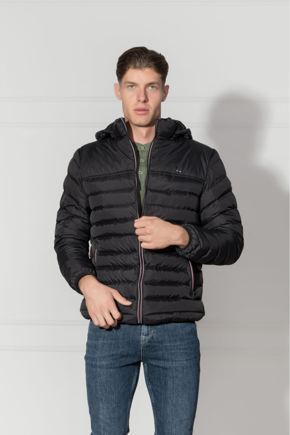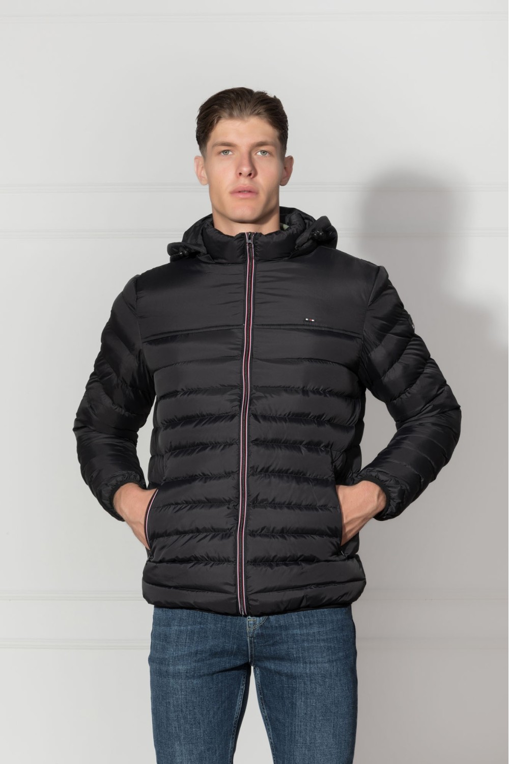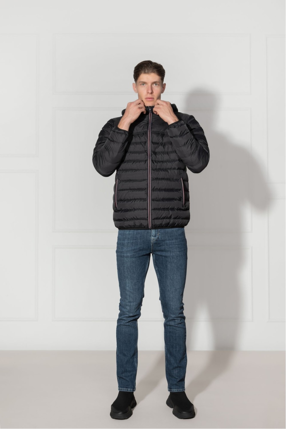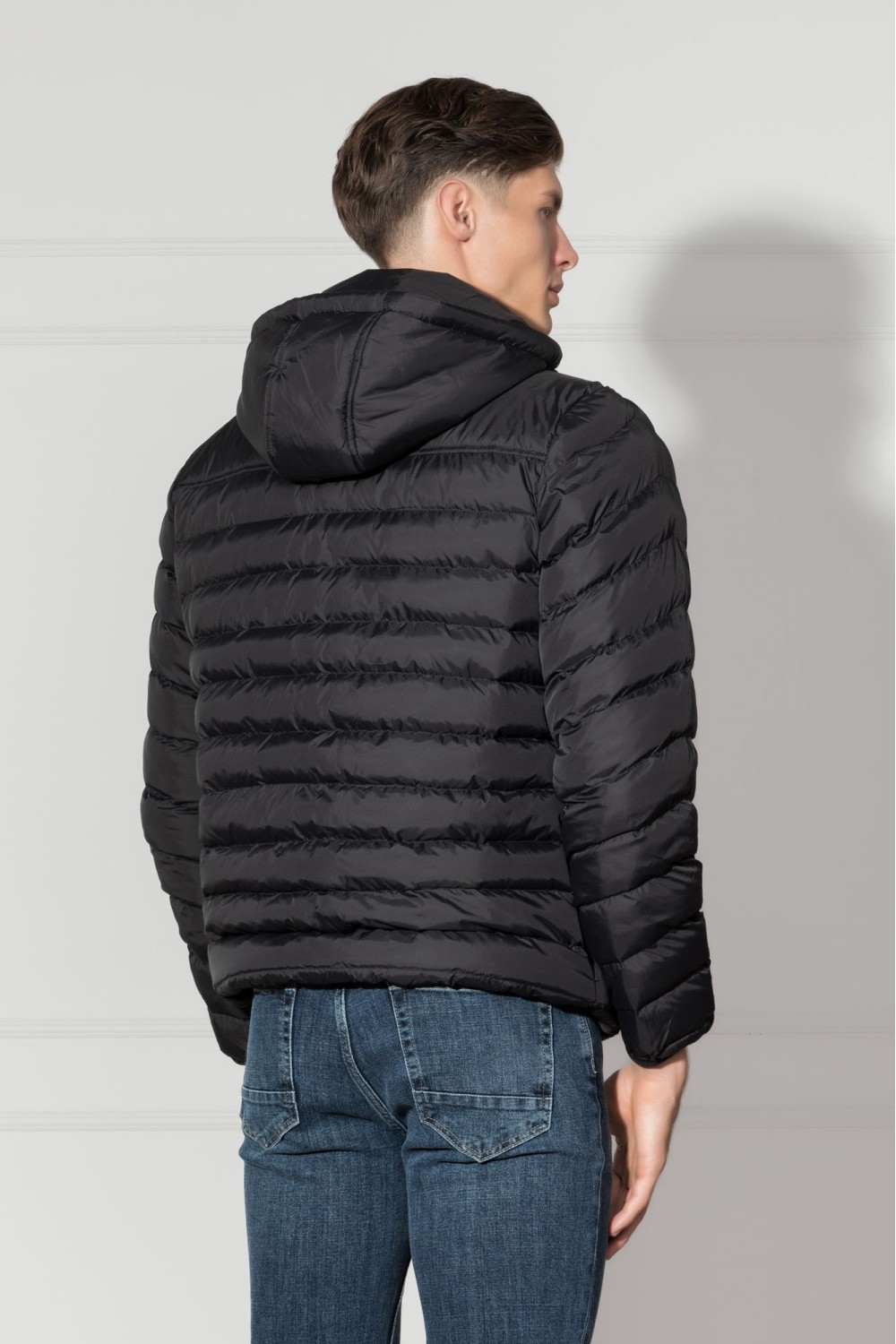 Zimska punjena jakna u crnoj boji, produžene duljine. Sprijeda gornji i donji džepovi. Kopčanje patent zatvaračem s preklopnikom na gumbe. Jakna ima kapuljaču i blago povišeni ovratnik. Deta..