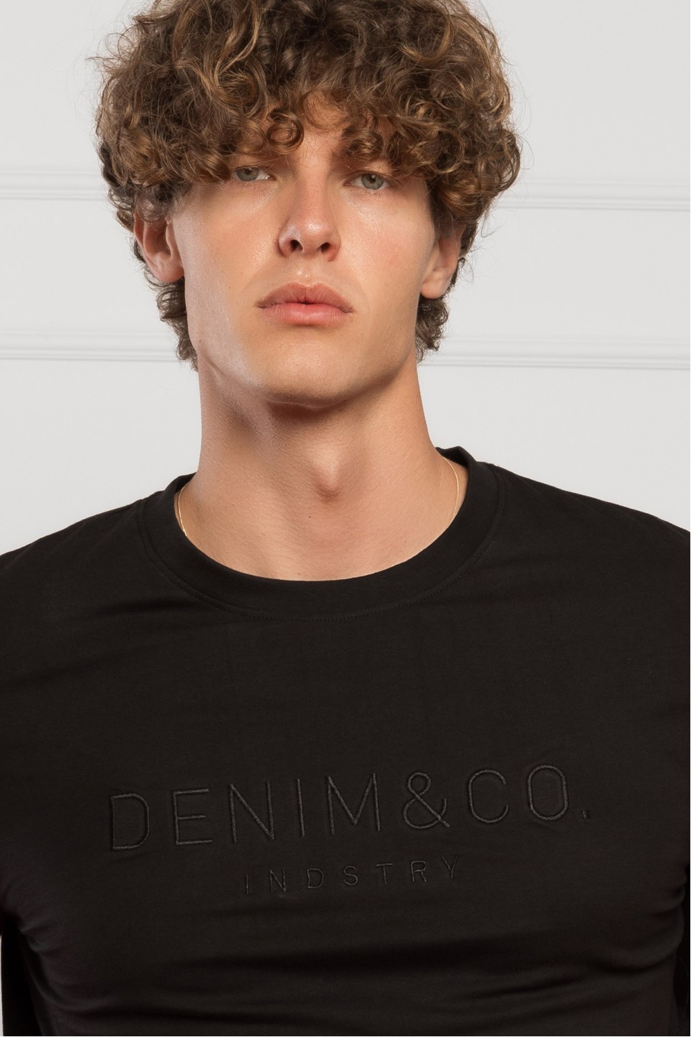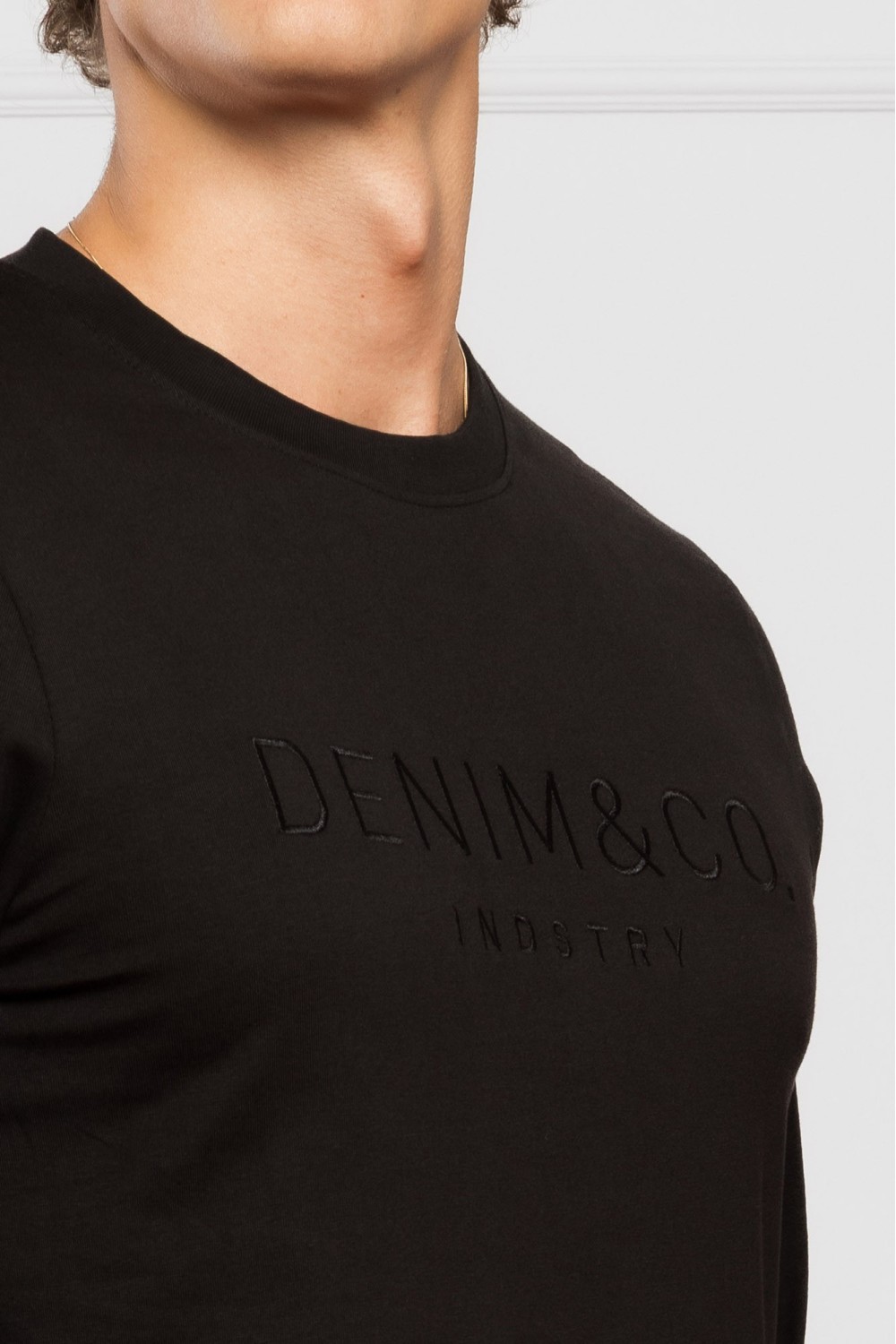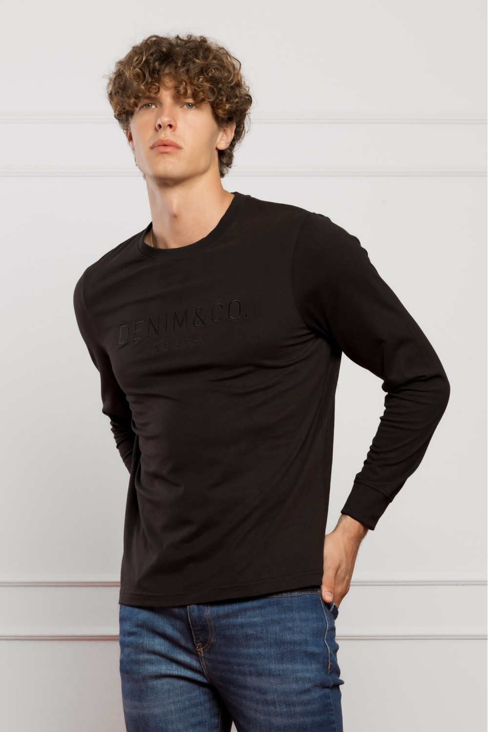 Moderna crna muška majica dugih rukava s unikatnim reljefnim printom na prednjoj strani koji daje 3D efekt. Diskretni detalj u narančastoj boji dodatno naglašava urban i trendovski izgled. Z..