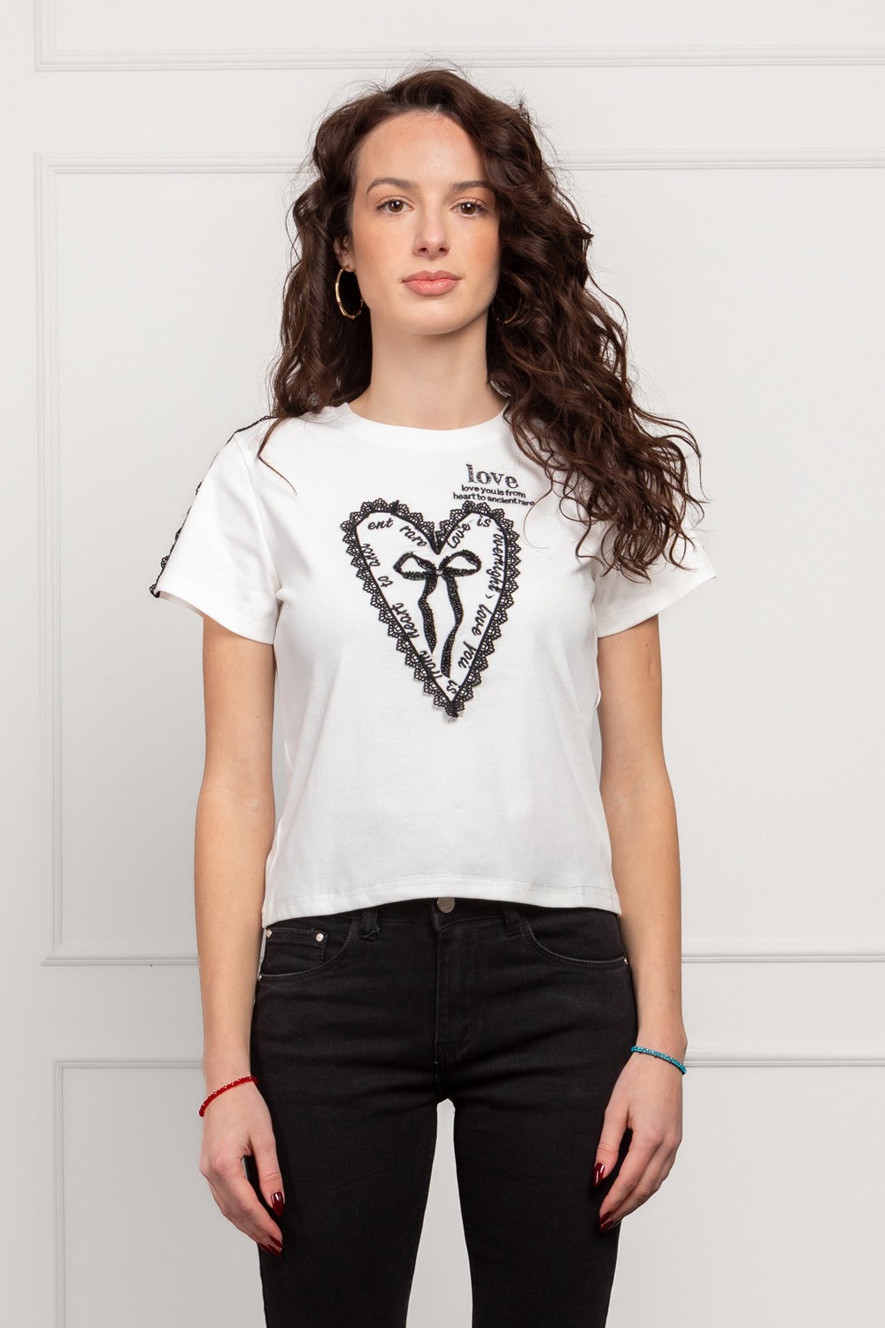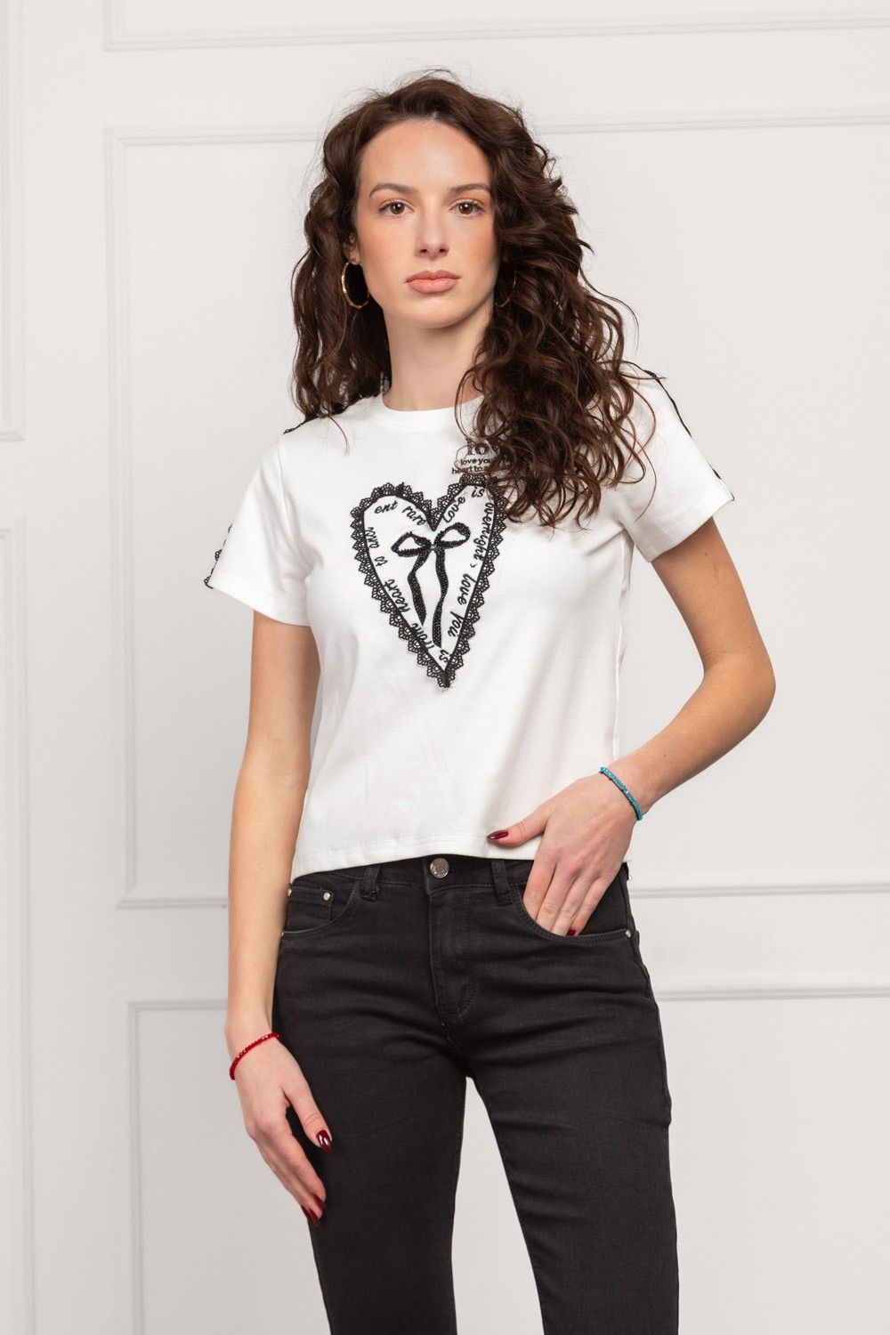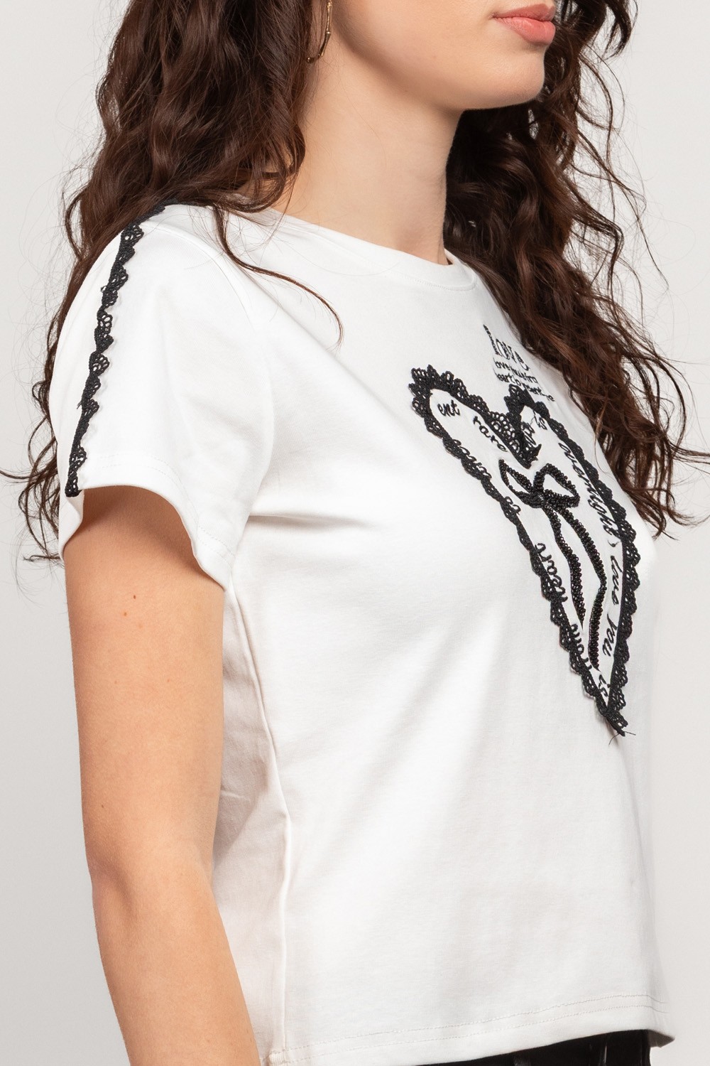 Crna majica kratkih rukava s minimalističkim prednjim vezom i sitnim motivom djeteline u obliku srca. Na stražnjoj strani krije se pravi wow detalj - velika okrugla čipkasta aplikacija inspi..