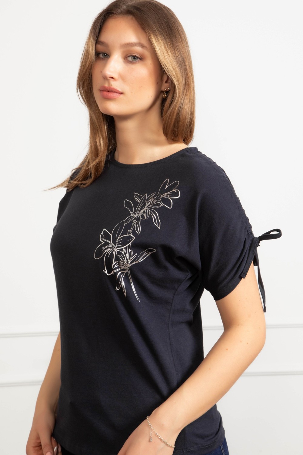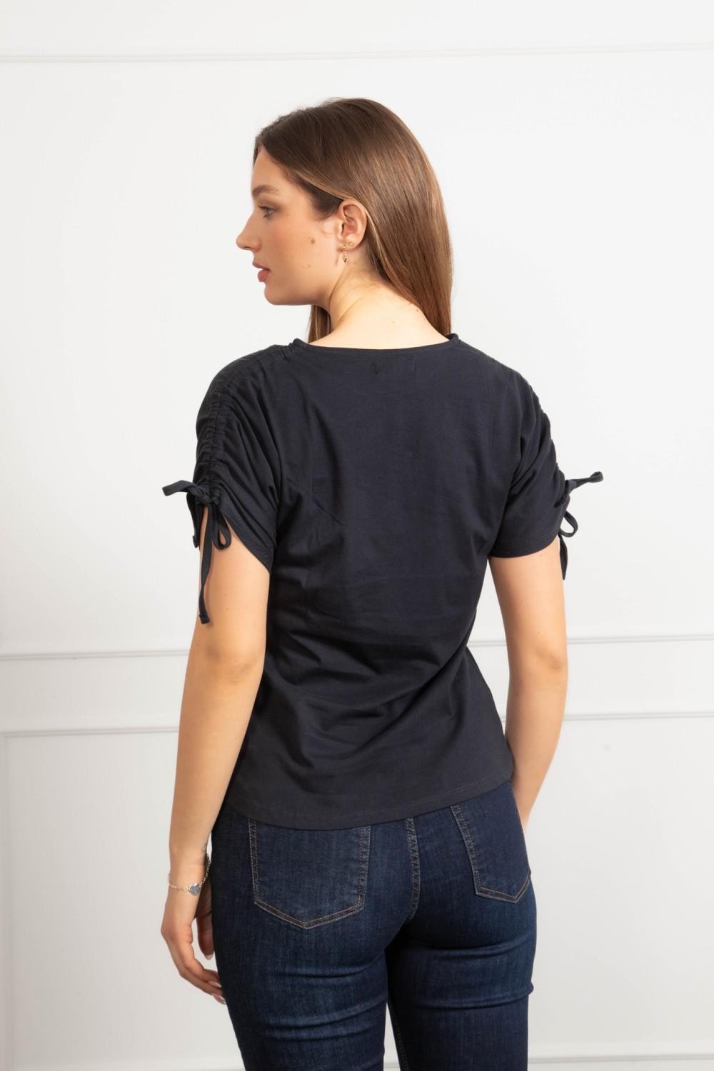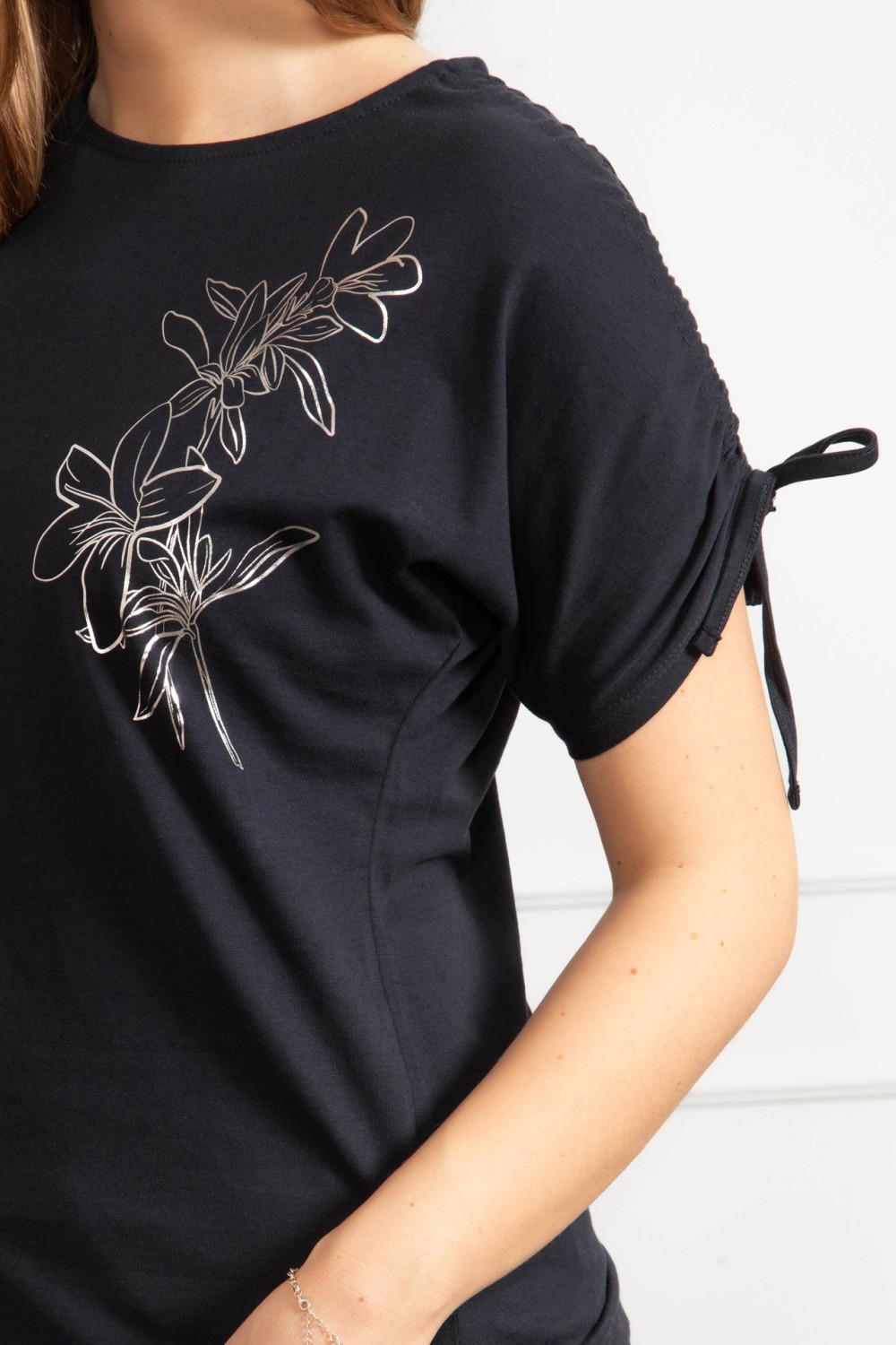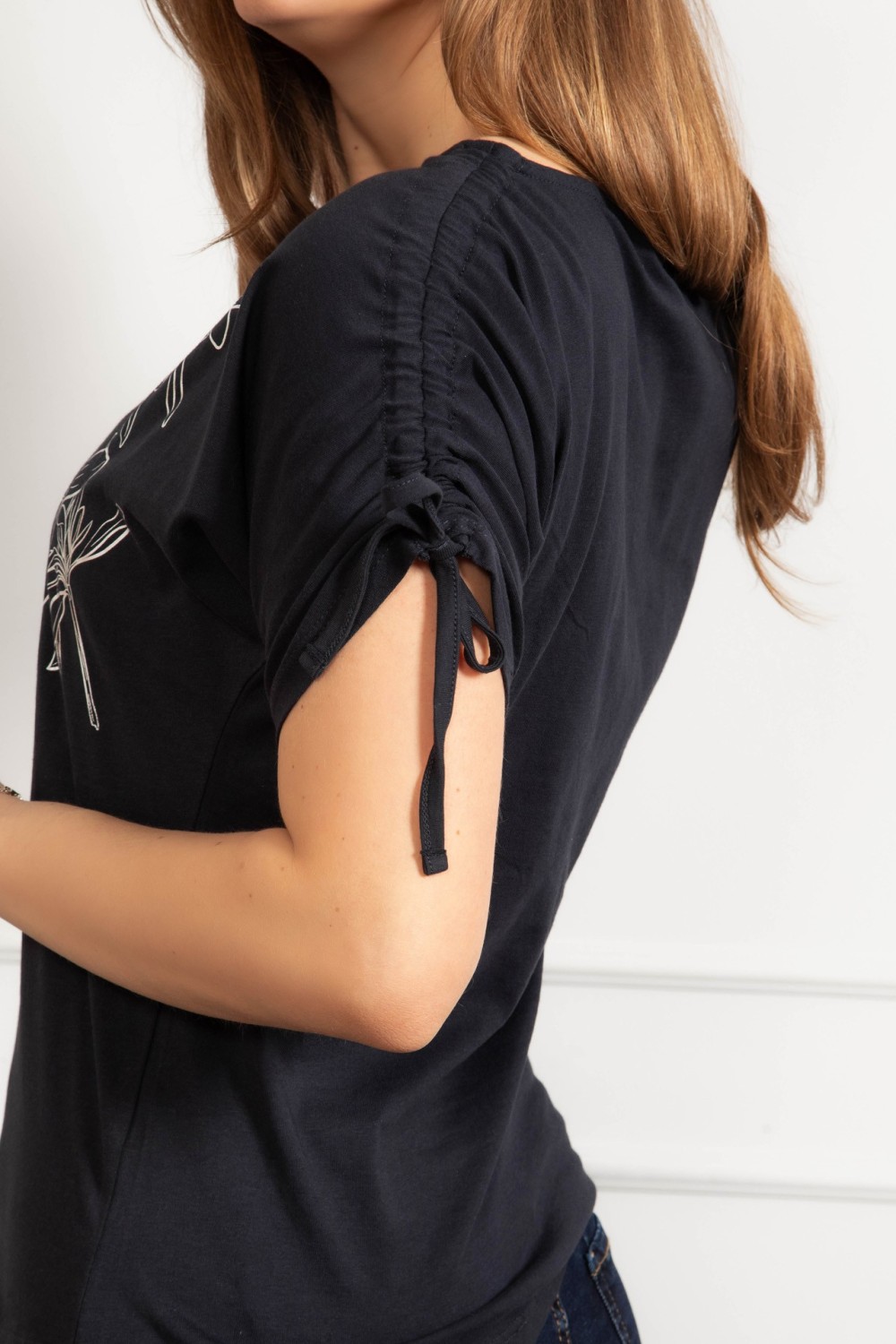 Majica kratkih rukava u tamno plavoj boji s dekorativnim aplikacijama i natpisom koji daje upečatljivu notu. Poseban detalj je vezanje na leđima koje majici daje zanimljiv i ženstven izgled,..