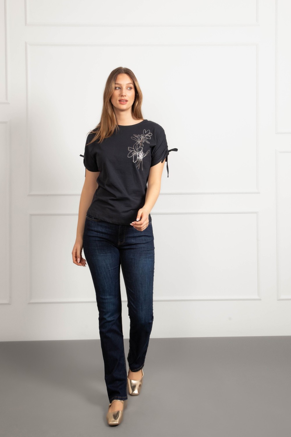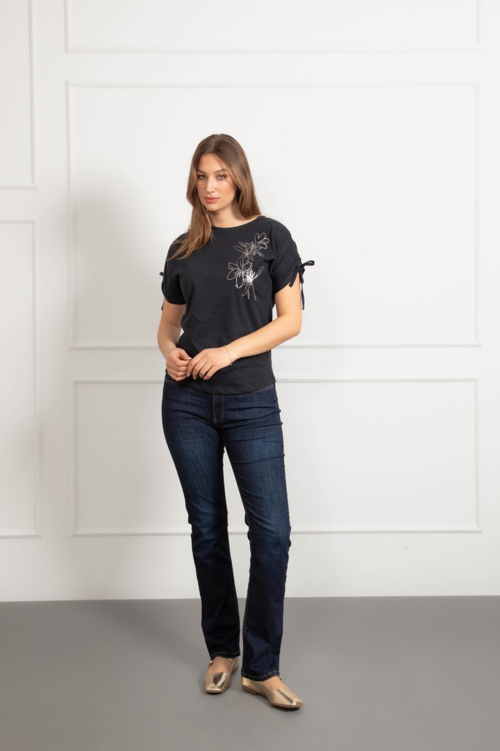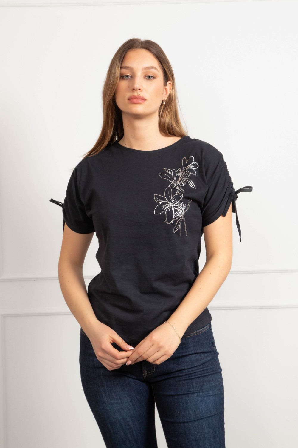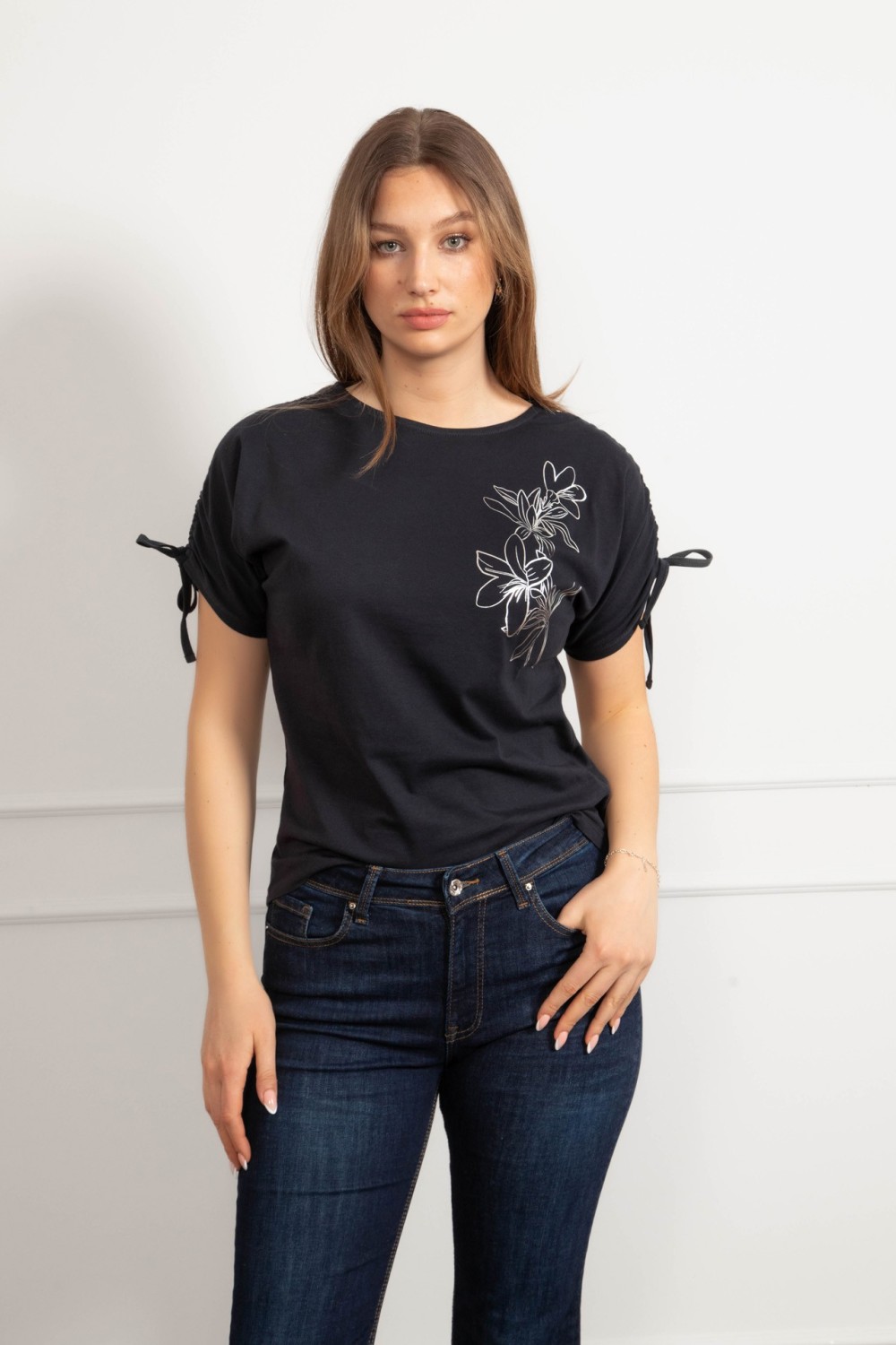 Majica kratkih rukava u tamno plavoj boji s dekorativnim aplikacijama i natpisom koji daje upečatljivu notu. Poseban detalj je vezanje na leđima koje majici daje zanimljiv i ženstven izgled,..
