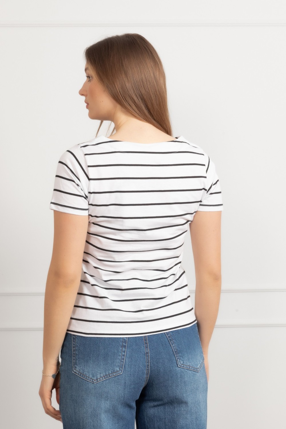 Majica s printom Paris u tipografiji i detaljima u obliku sjajnih dugmadi koji joj daju chic dojam bez previše truda. Posebnost ovog modela su kratki čipkasti rukavi koji majicu čine posebni..