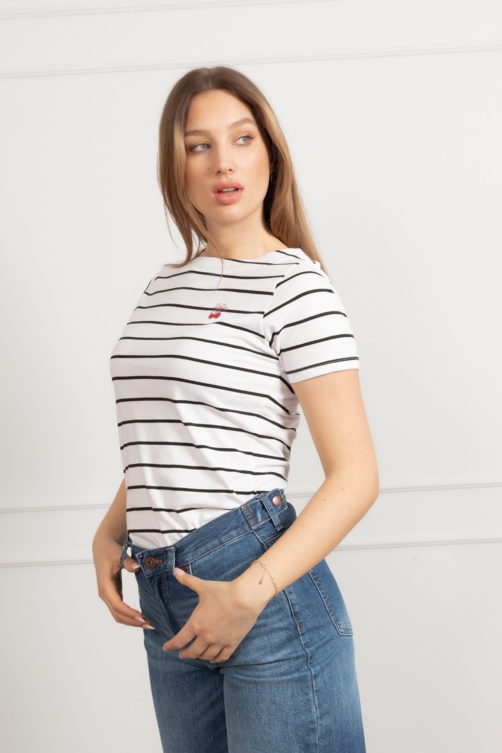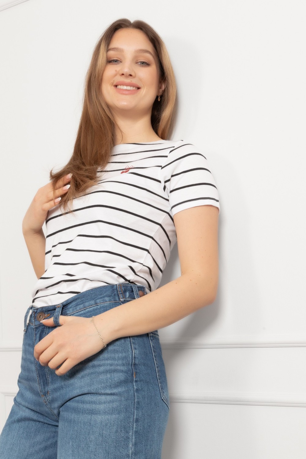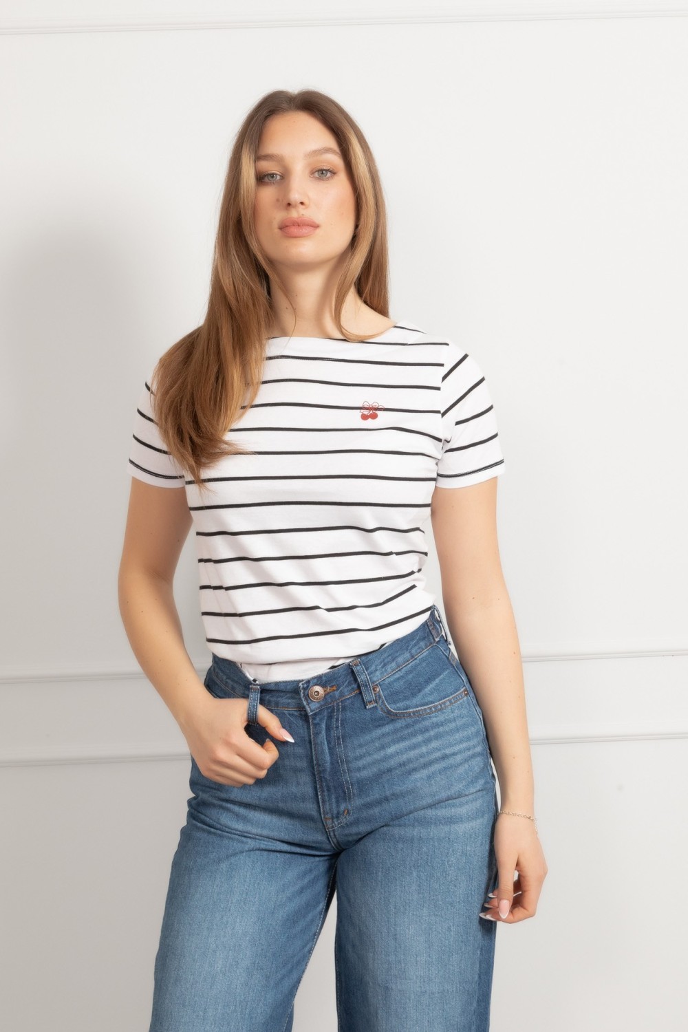 Jednostavna majica u tamno plavoj boji s malim dekorativnim srcem koje daje suptilan i ženstven detalj. Udoban pamučni materijal i klasičan kroj čine je idealnim komadom za svakodnevne kombi..