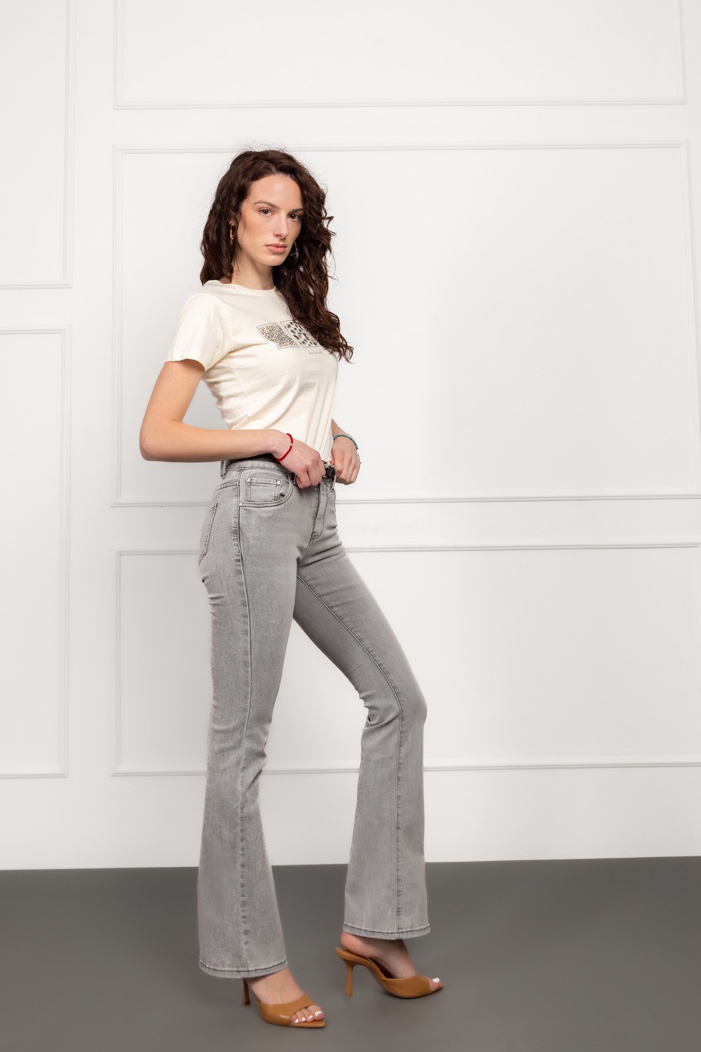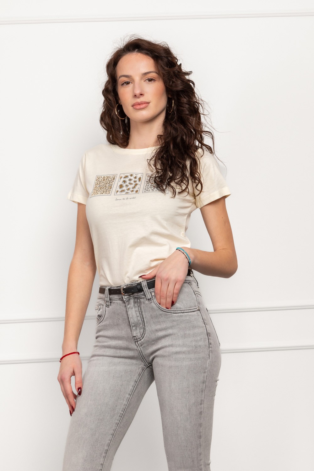 Ženska majica kratkih rukava u bijeloj boji ukrašena ručno-inspiriranim heklanim cvjetovima i suptilnim kamenčićima koji dodaju blagi sjaj. Cvjetni motiv pruža nježan i romantičan dojam, dok..