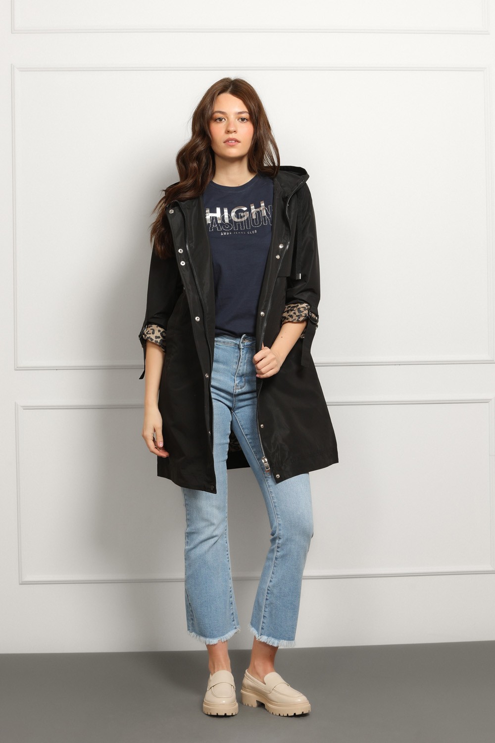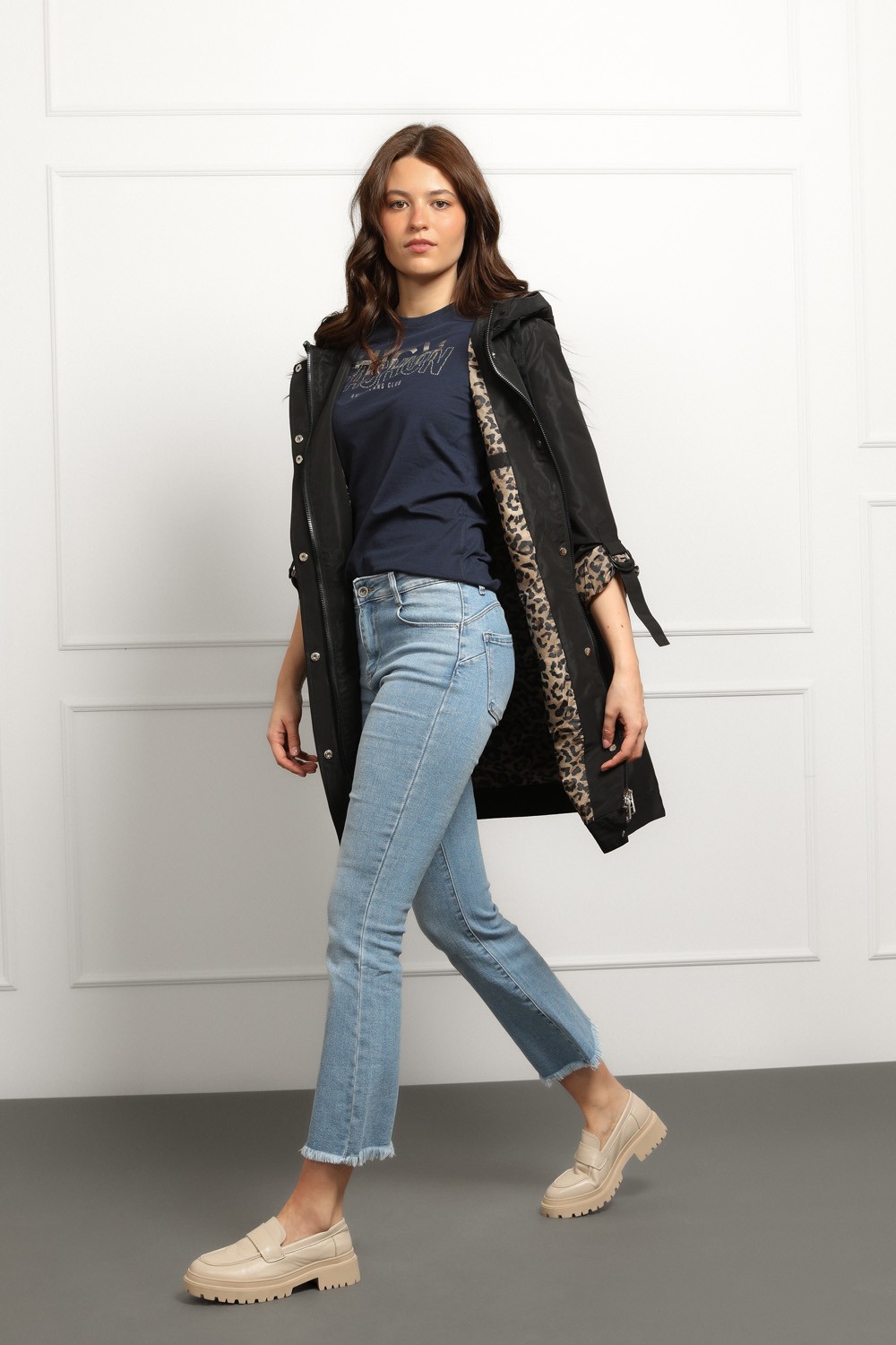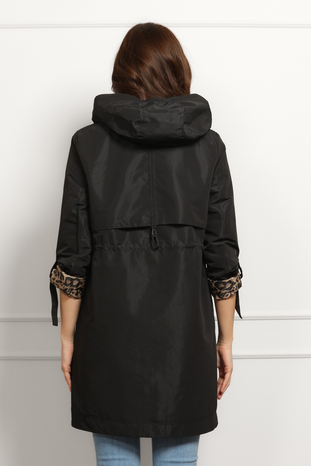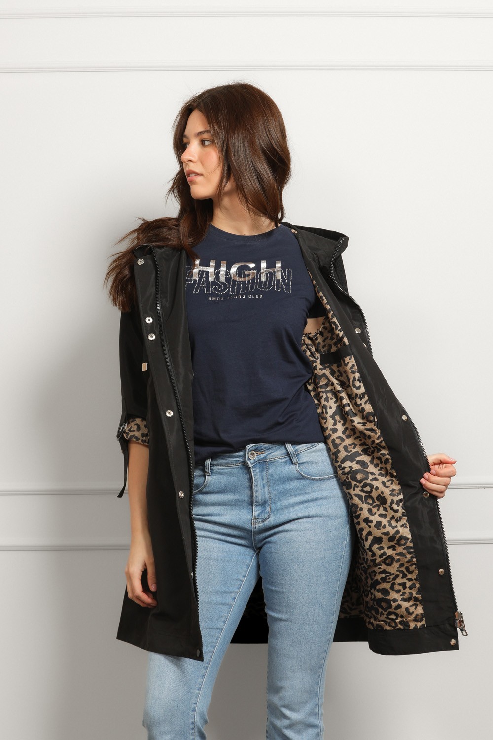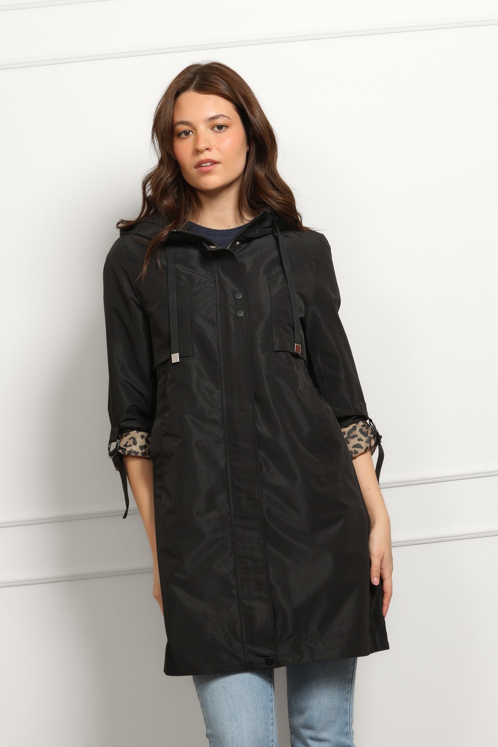 Moderna crna parka s kapuljačom koja spaja funkcionalnost i upečatljiv stil. Vanjski dio je minimalistički i čistog kroja, dok unutrašnjost krije efektan leopard uzorak koji daje wow detalj čim je otvoriš.