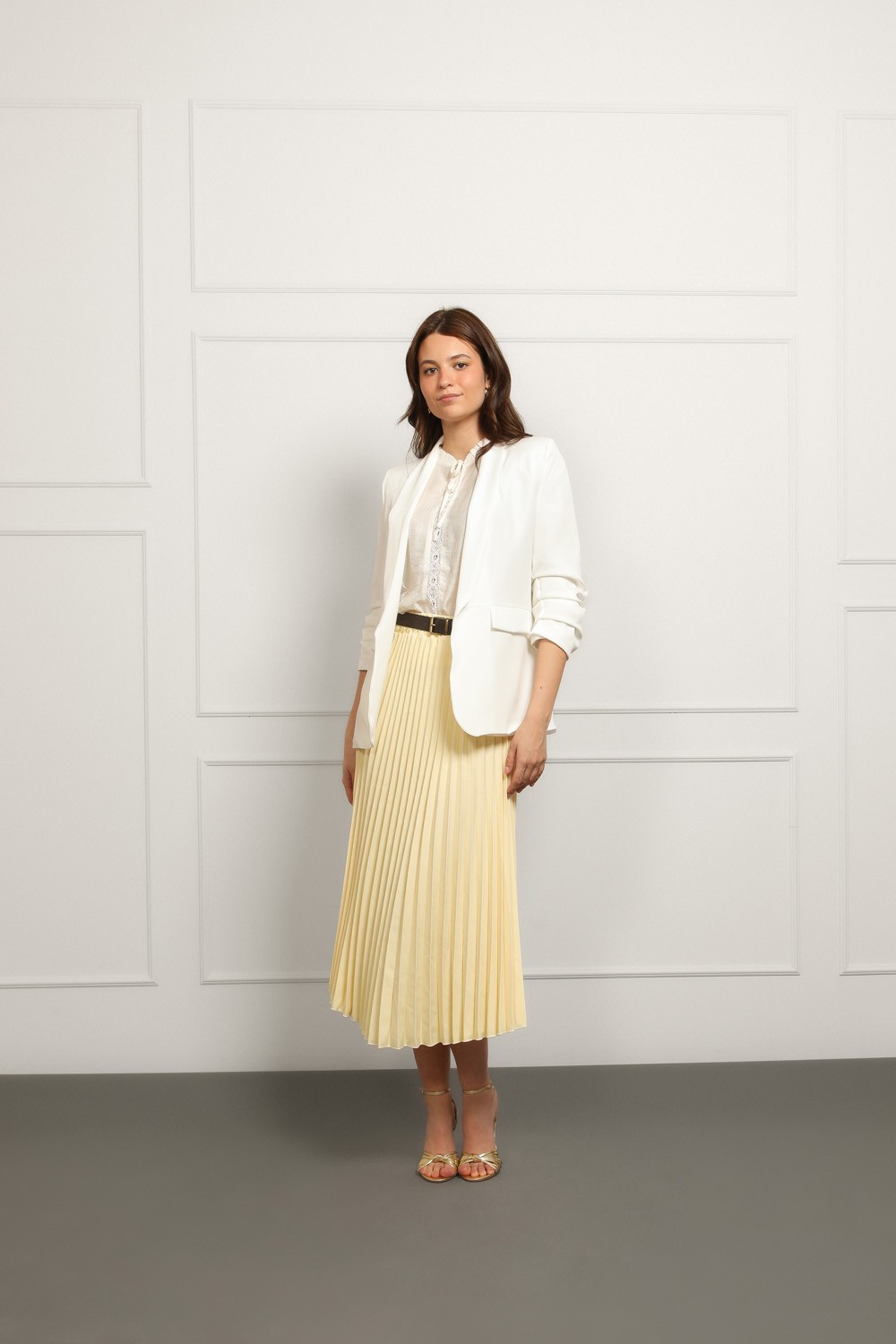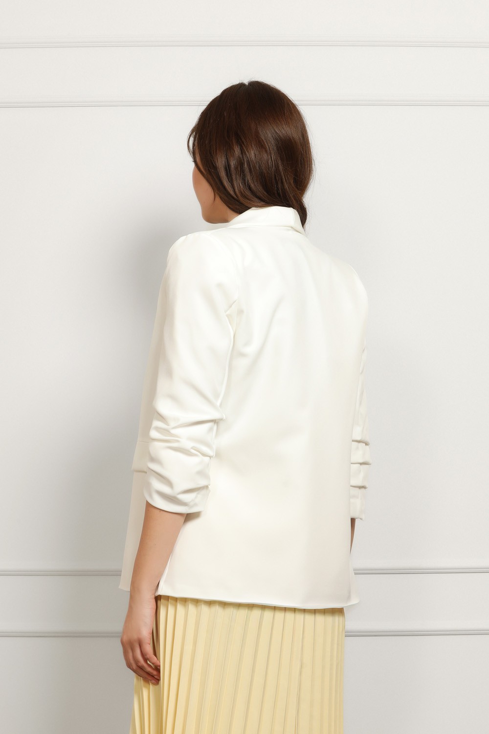 Ženski bijeli sako elegantnog, blago strukiranog kroja savršen je izbor za poslovne i svečanije kombinacije. Dizajniran je s klasičnom rever kragnom i jednorednim kopčanjem koje daje uredan,..