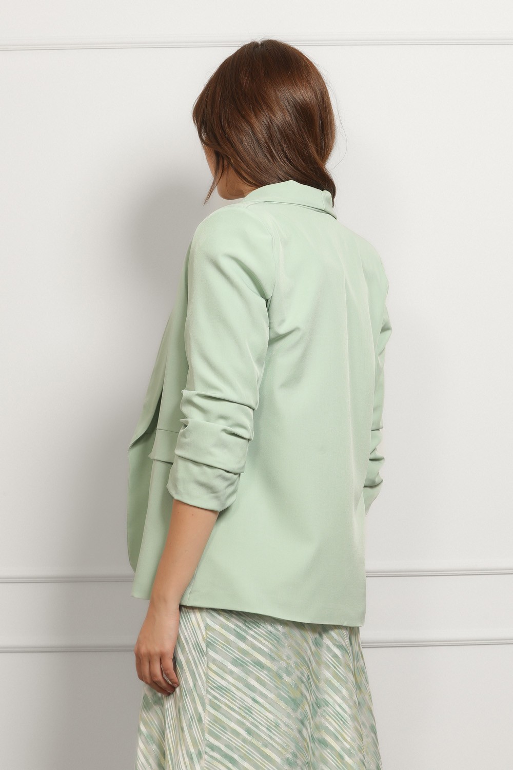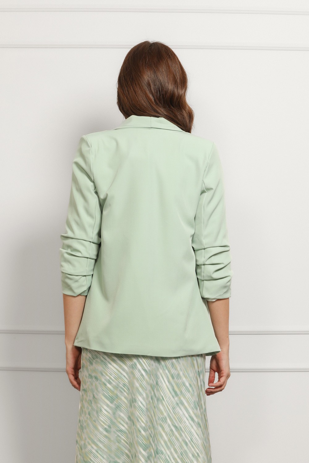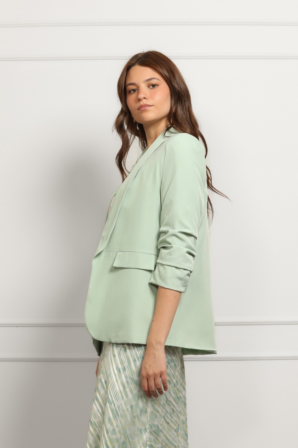 Ženski sako u intenzivnoj zelenoj boji ističe se modernim krojem i elegantnom siluetom. Blago strukirani model lijepo prati liniju tijela i naglašava figuru, dok rever ovratnik i dvoredno ko..
