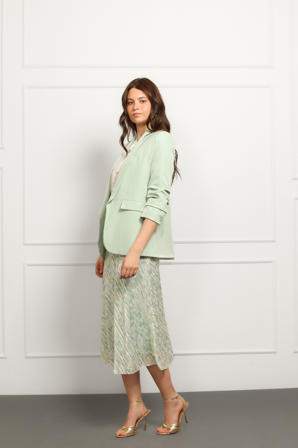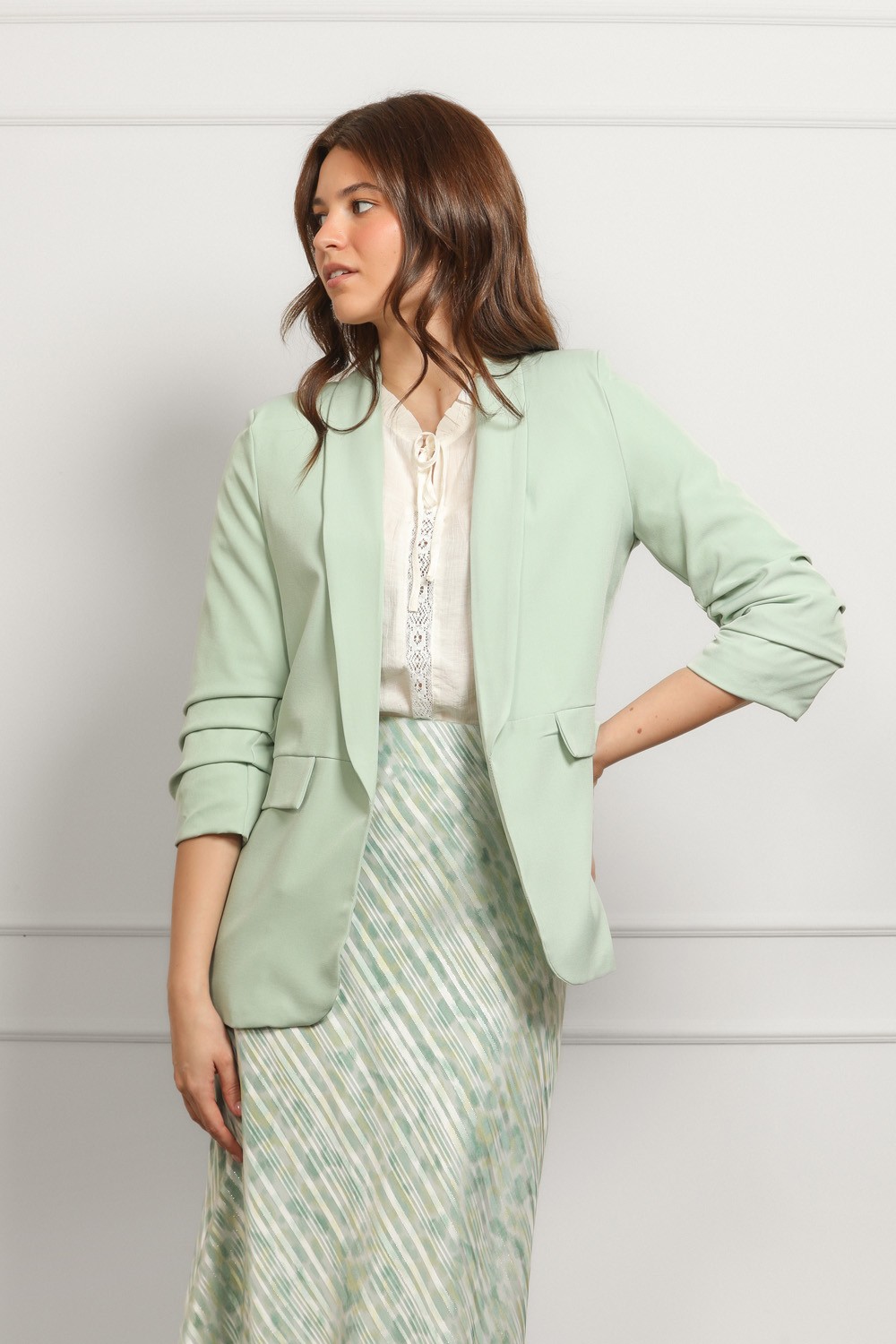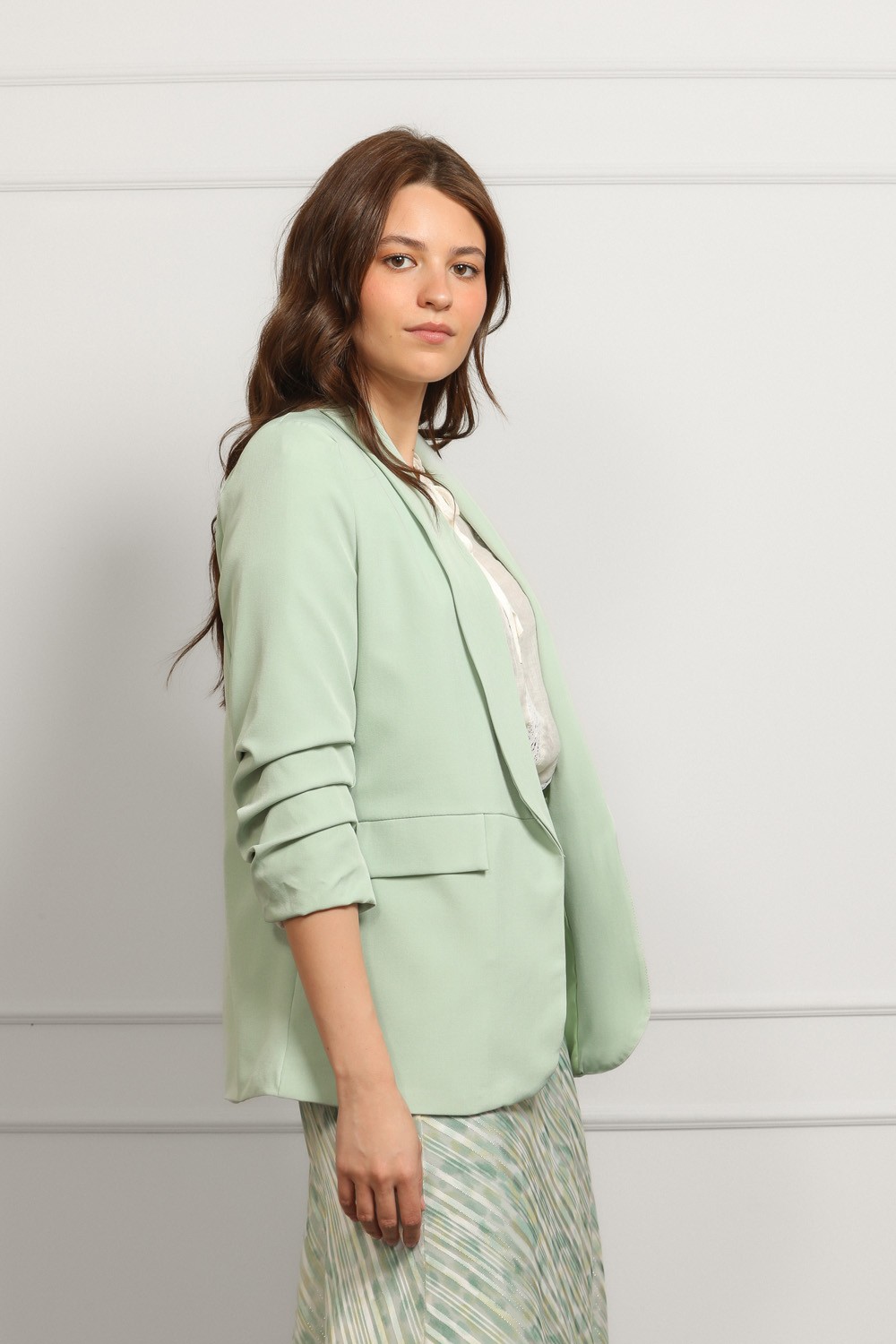 Ženski sako u intenzivnoj zelenoj boji ističe se modernim krojem i elegantnom siluetom. Blago strukirani model lijepo prati liniju tijela i naglašava figuru, dok rever ovratnik i dvoredno ko..