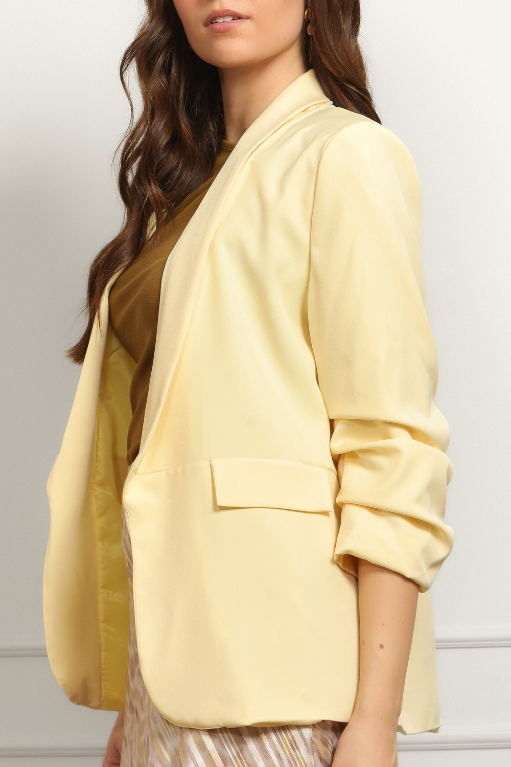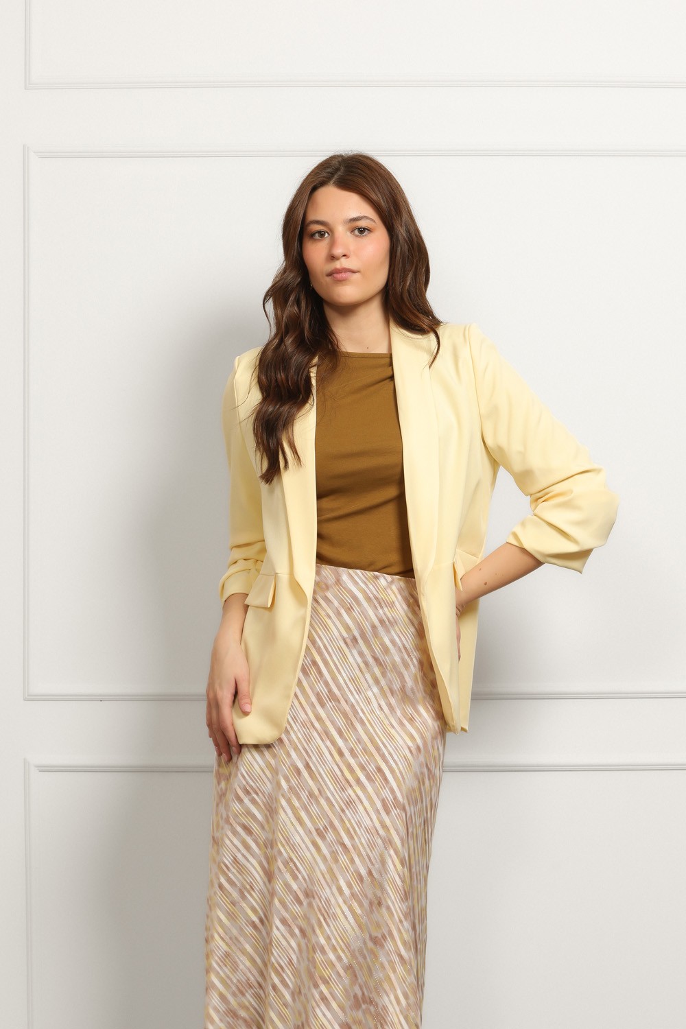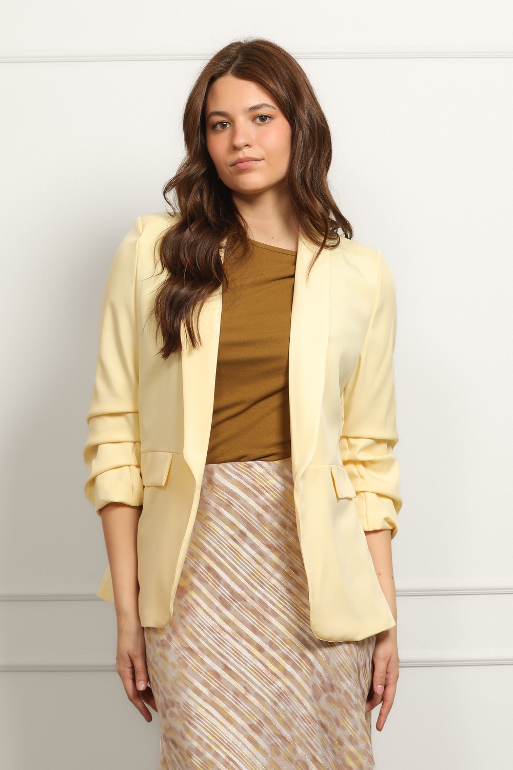 Ženski bež sako klasičnog kroja savršen je izbor za elegantne i poslovne kombinacije. Model je strukiranog kroja koji lijepo prati liniju tijela i naglašava siluetu, dok rever kragna i jedno..