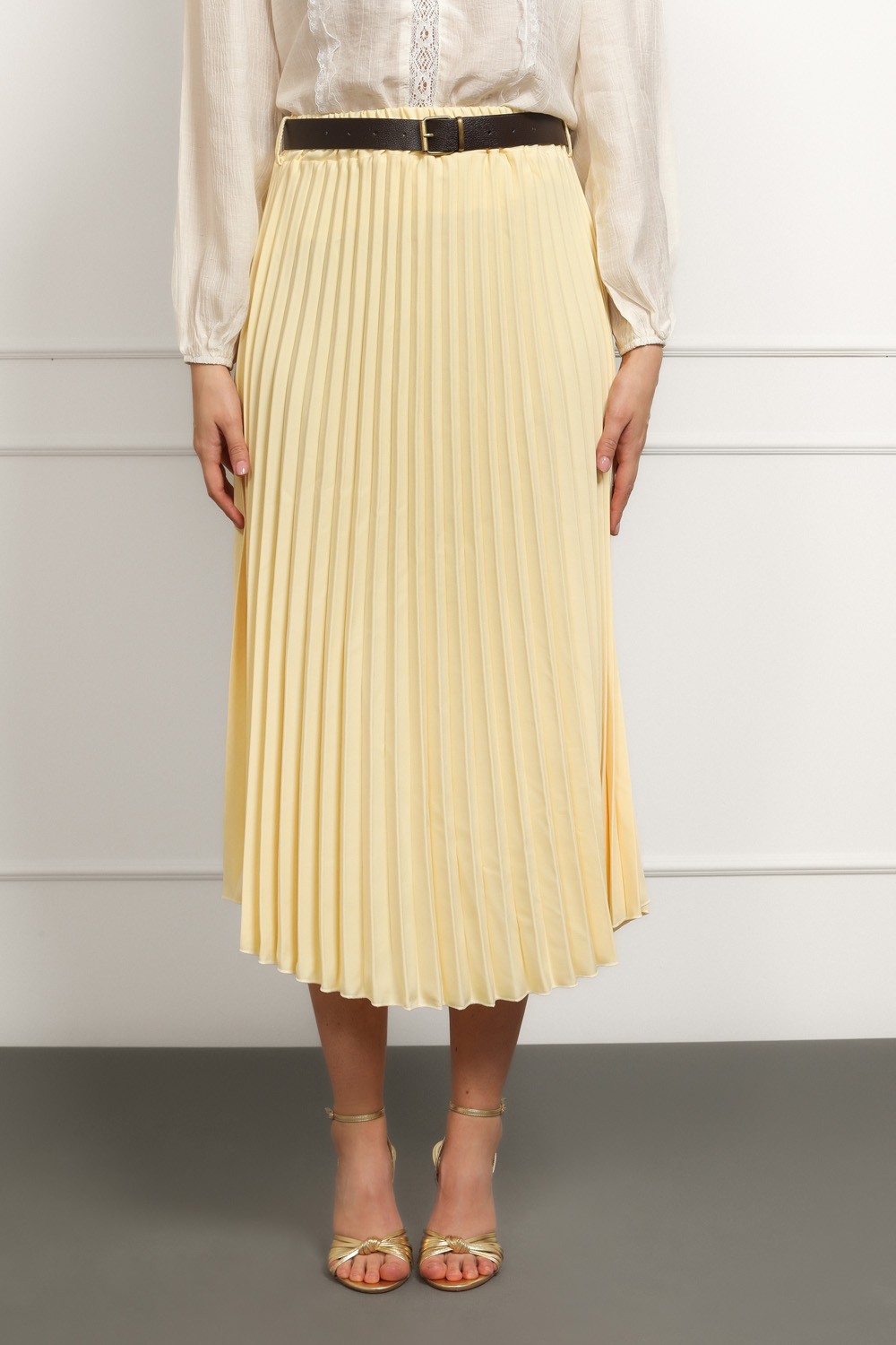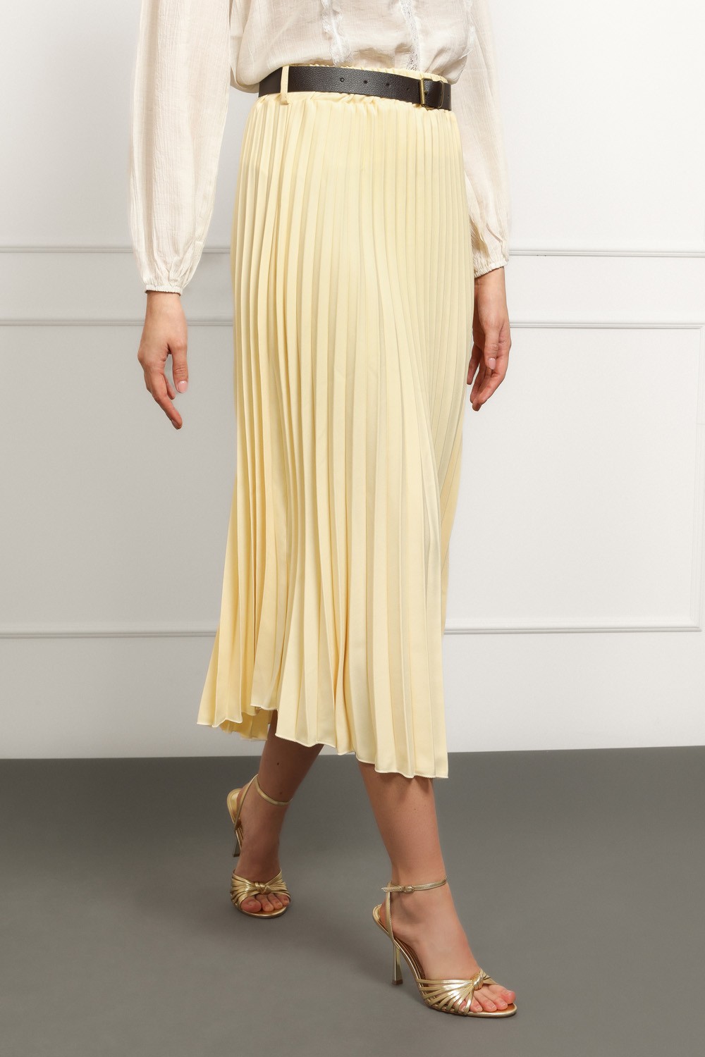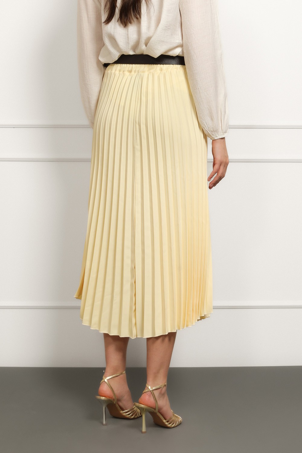 Lepršava maxi suknja u nježnoj žutoj nijansi koja odmah podiže svaku kombinaciju. Plisirani kroj daje joj dozu elegancije i pokreta pri hodu, dok elastični pojas osigurava udobnost i lako prilagođavanje struku.