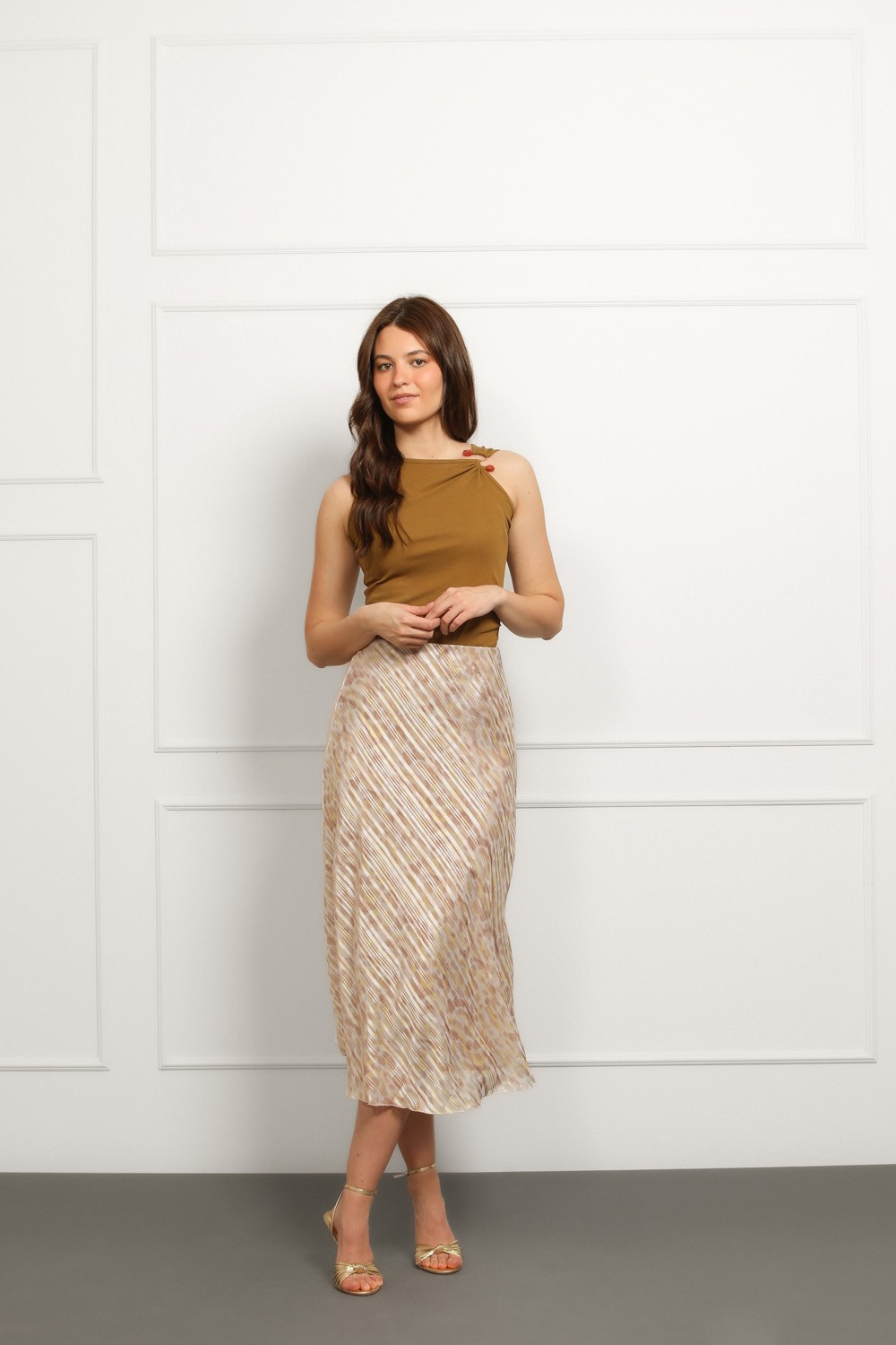 Ženski top u maslinasto zelenoj boji izrađen je od mekanog i elastičnog pamuka koji pruža udobnost tijekom cijelog dana. Model bez rukava s klasičnim okruglim izrezom naglašen je efektnim naborom i dekorativnim detaljem na prednjem dijelu. Zahvaljujući elastičnosti materijala, top se lijepo prilagođava tijelu i omogućuje slobodu pokreta.