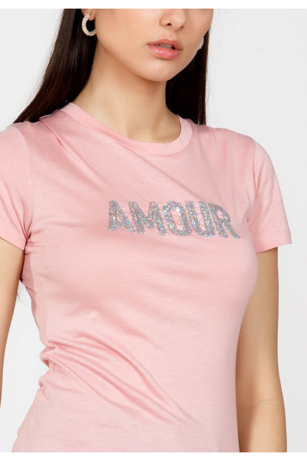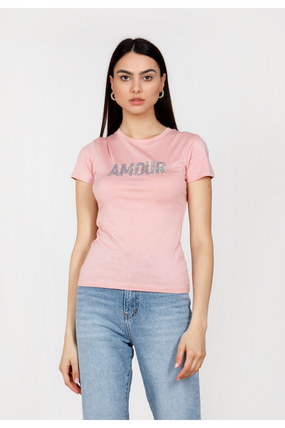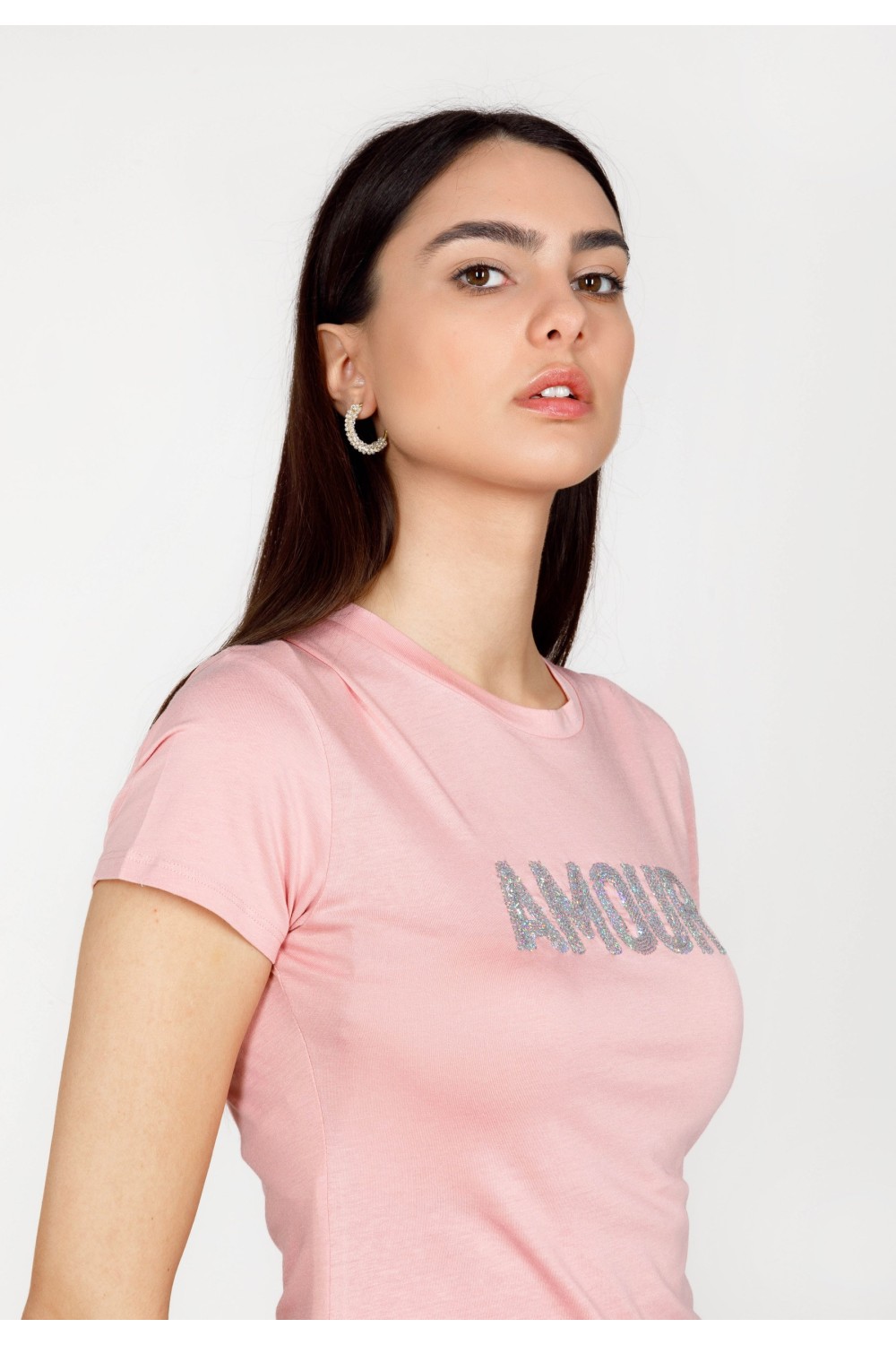 Ženska majica kratkog rukava s aplikacijskom ružičastog cvijeta sa gliterima. -95% PAMUK, 5% ELASTINModel je visok 180 cm i nosi veličinu S/ V36..