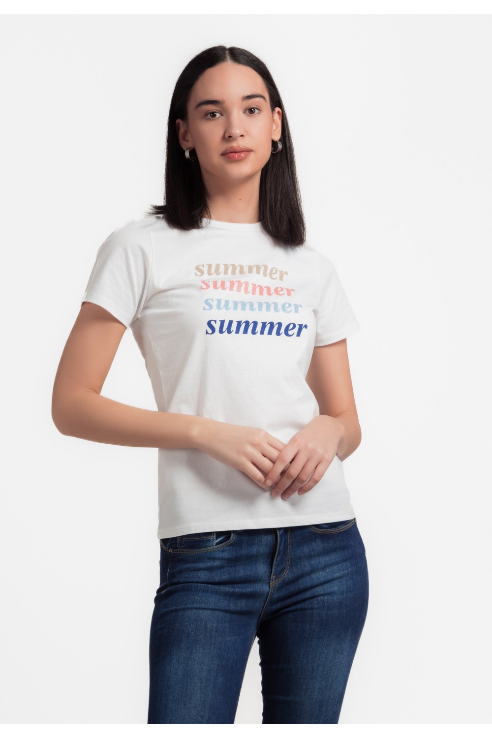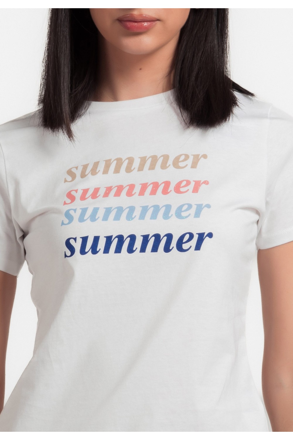 Ženska majica kratkog rukava sa svjetlucavim srebrnim natpisom sprijeda. -95% PAMUK, 5% ELASTINModel je visok 175 cm i nosi veličinu S/ V36..