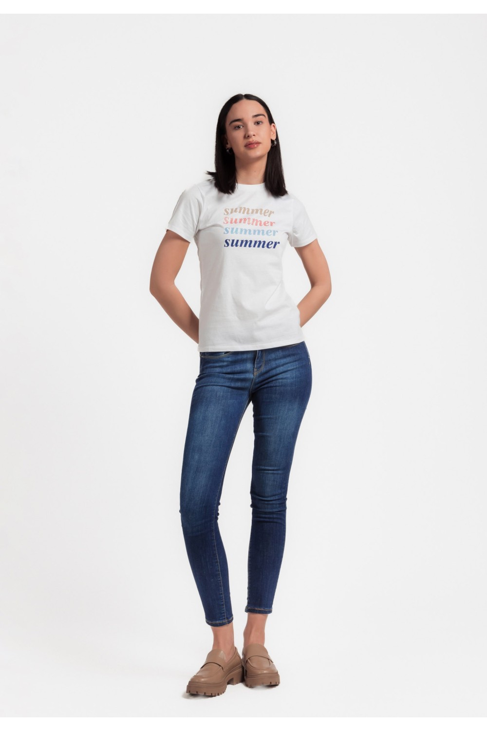 Bijela majica kratkog rukava, sa tiskom sprijeda i detaljima sjajnih šljokica. Okruglog ovratnika.-100% PAMUKModel je visok 175 cm i nosi veličinu S/V36..