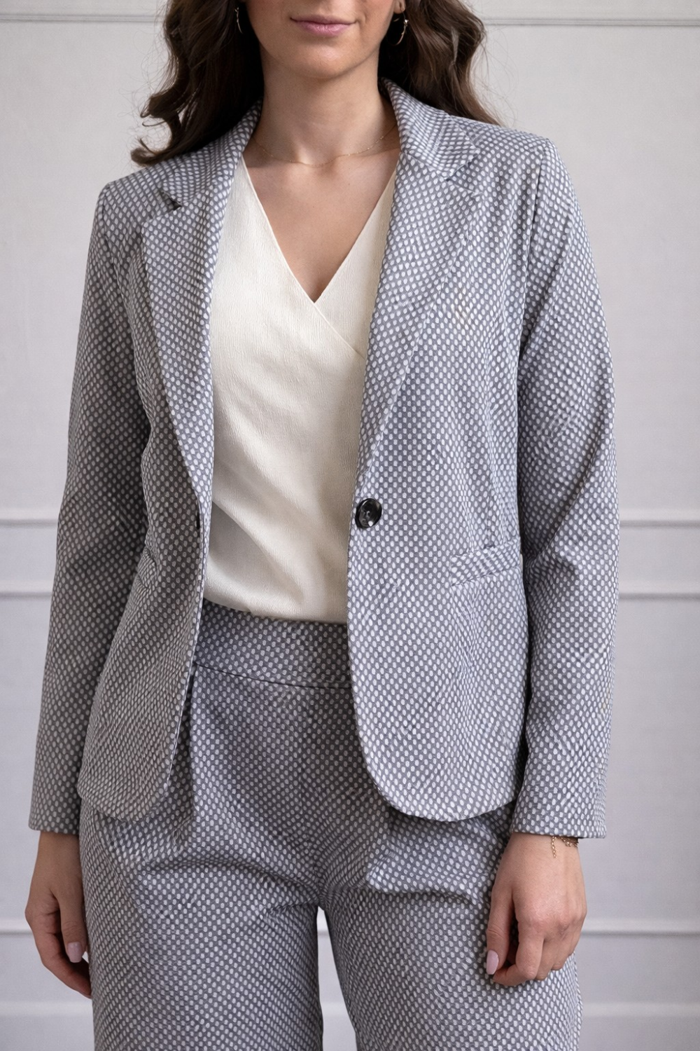 Ženski bijeli sako elegantnog, blago strukiranog kroja savršen je izbor za poslovne i svečanije kombinacije. Dizajniran je s klasičnom rever kragnom i jednorednim kopčanjem koje daje uredan,..