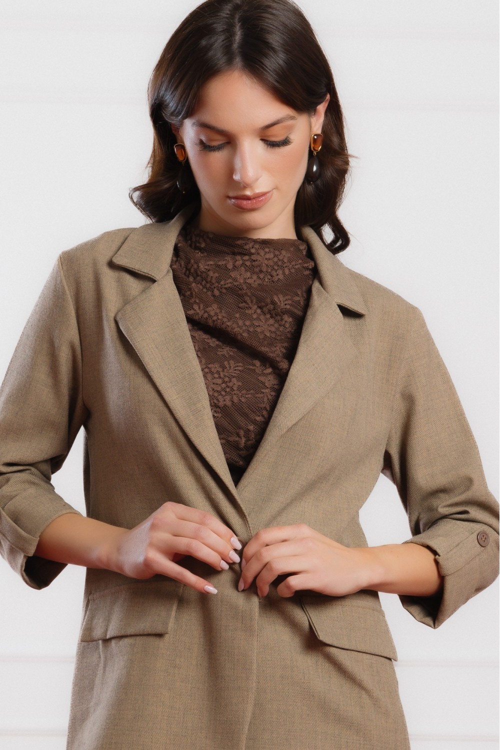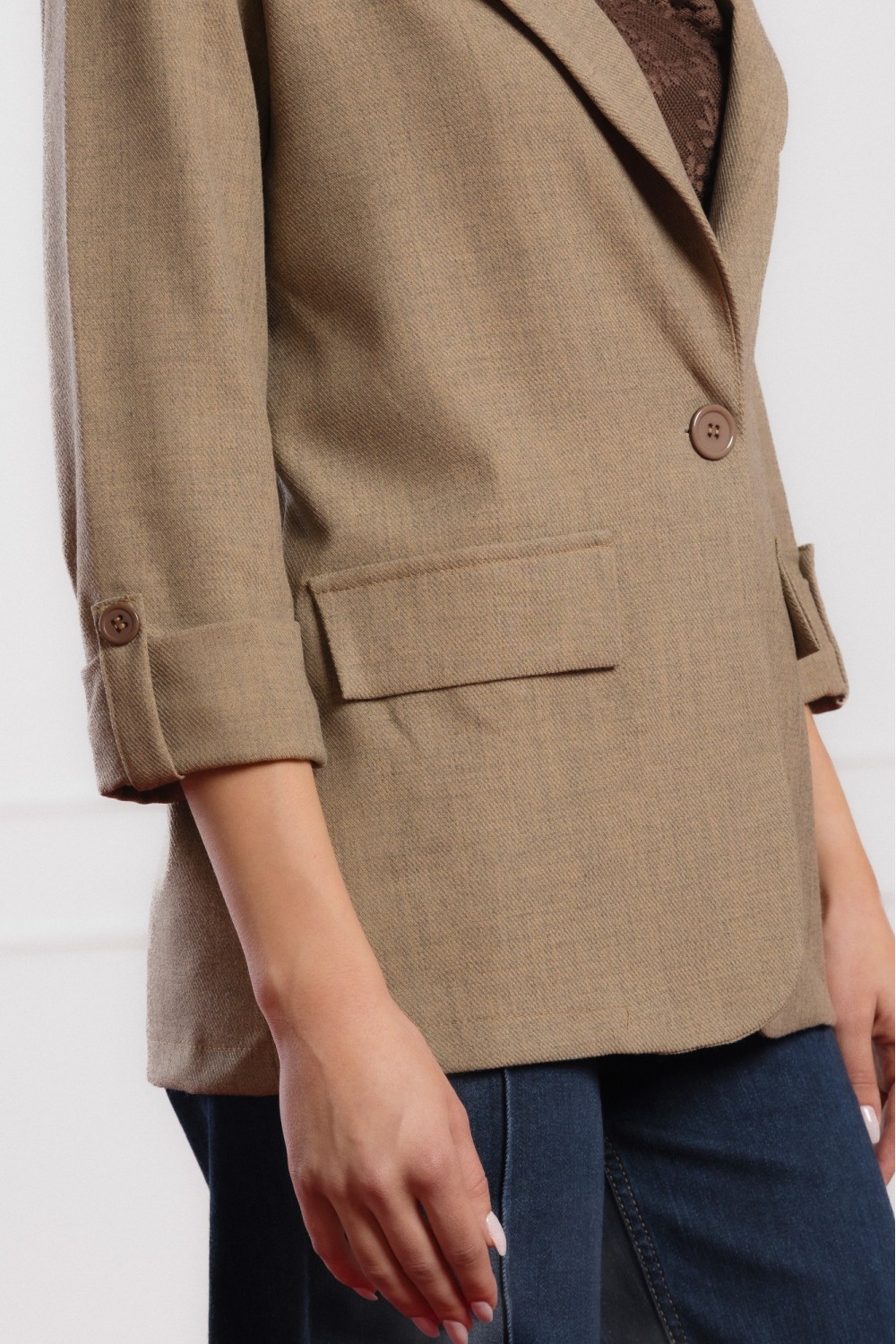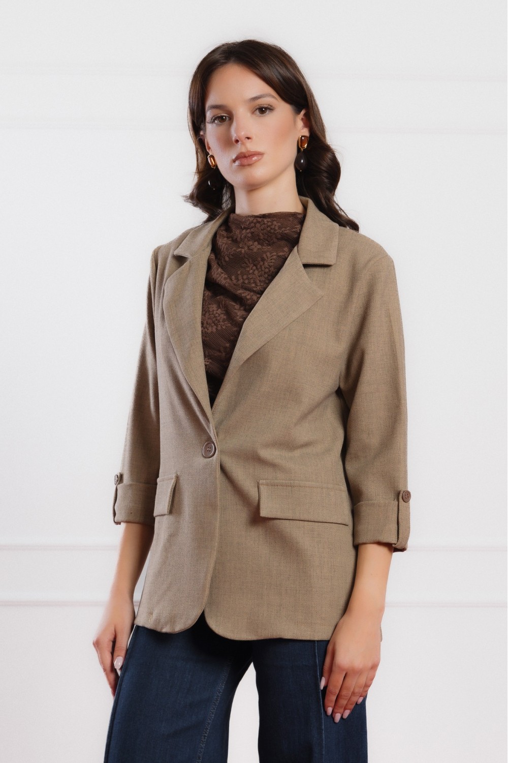 Smeđi sako s 3/4 rukavima savršen je izbor za prijelazne sezone i elegantne svakodnevne kombinacije. Lagano strukirani kroj naglašava siluetu, dok mekani materijal i podstava osiguravaju udo..