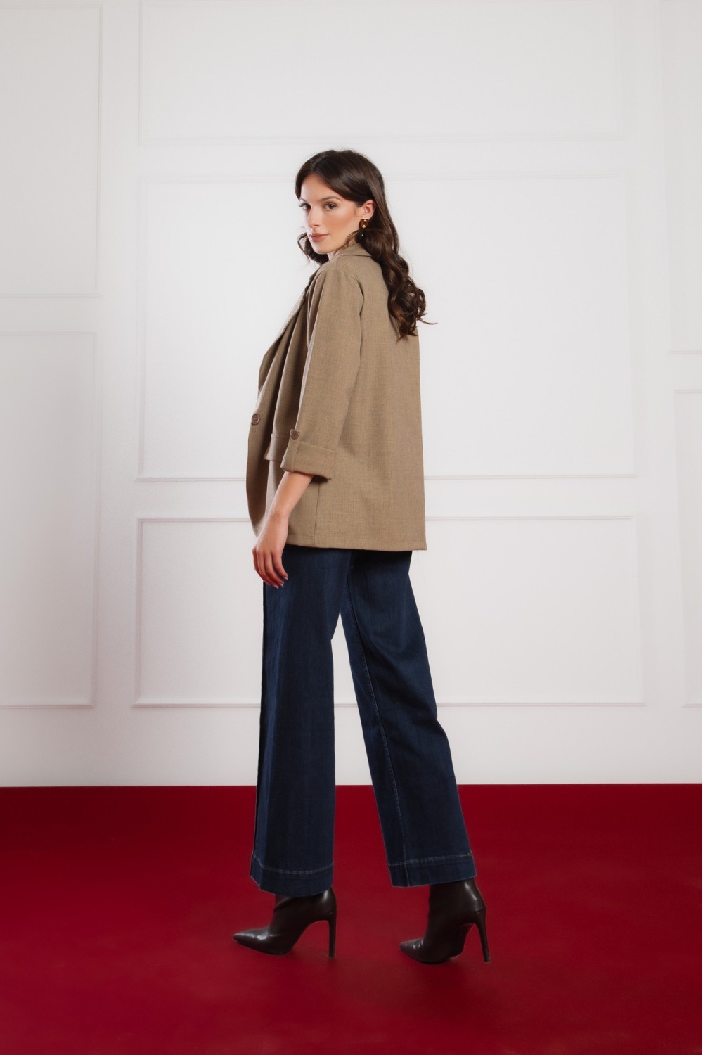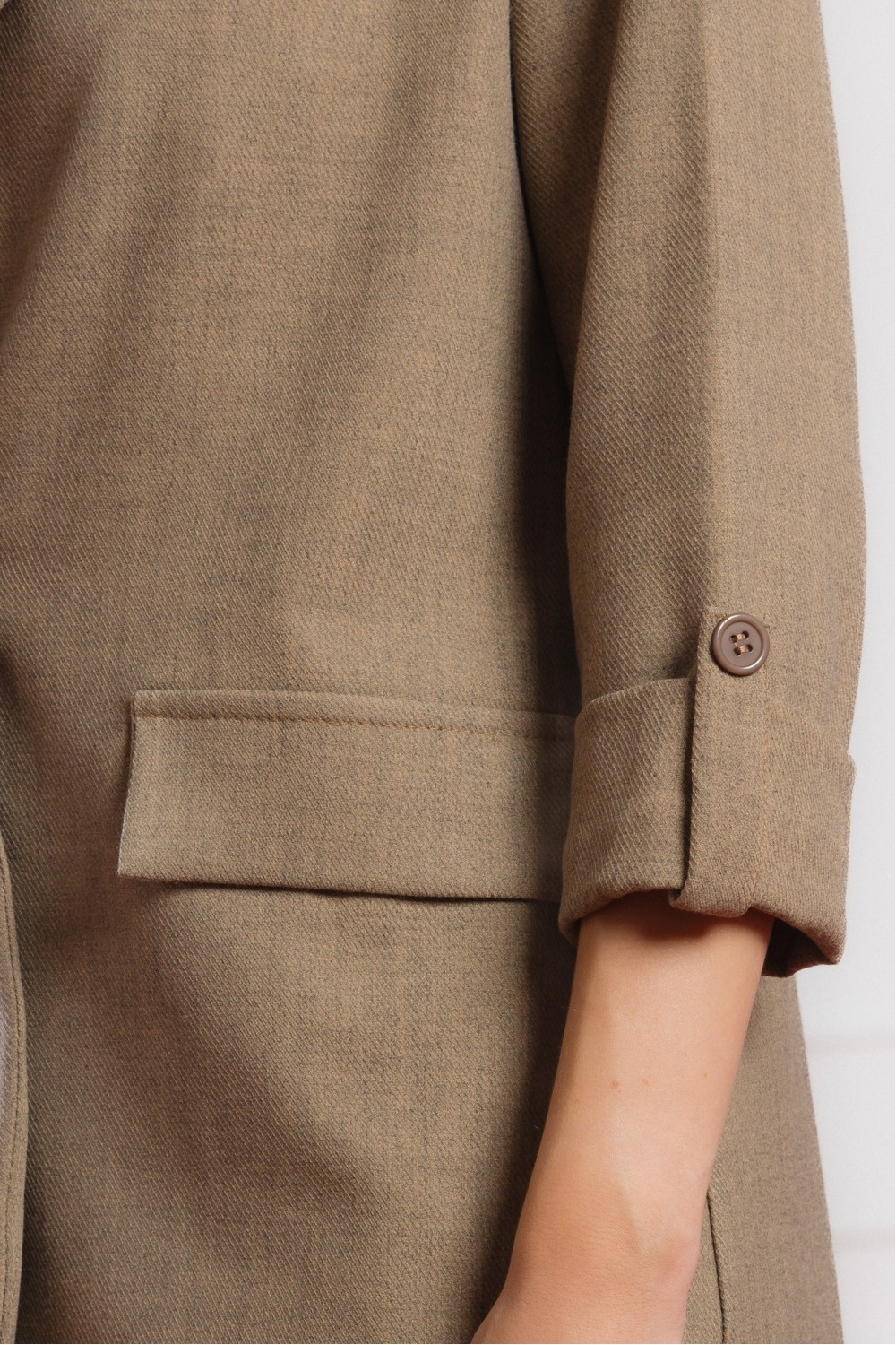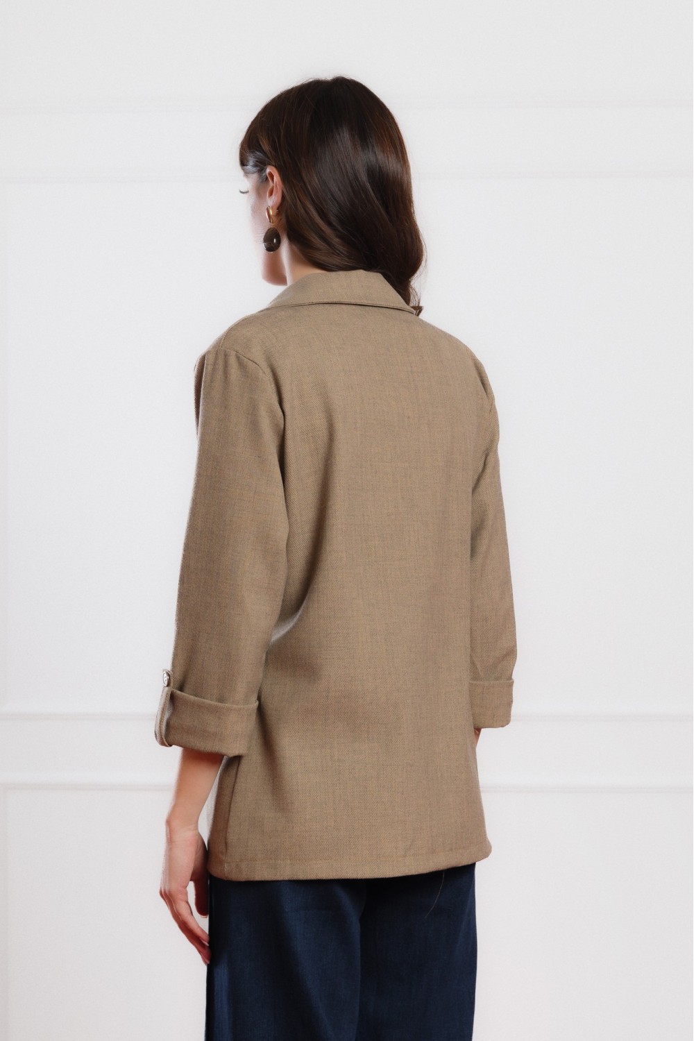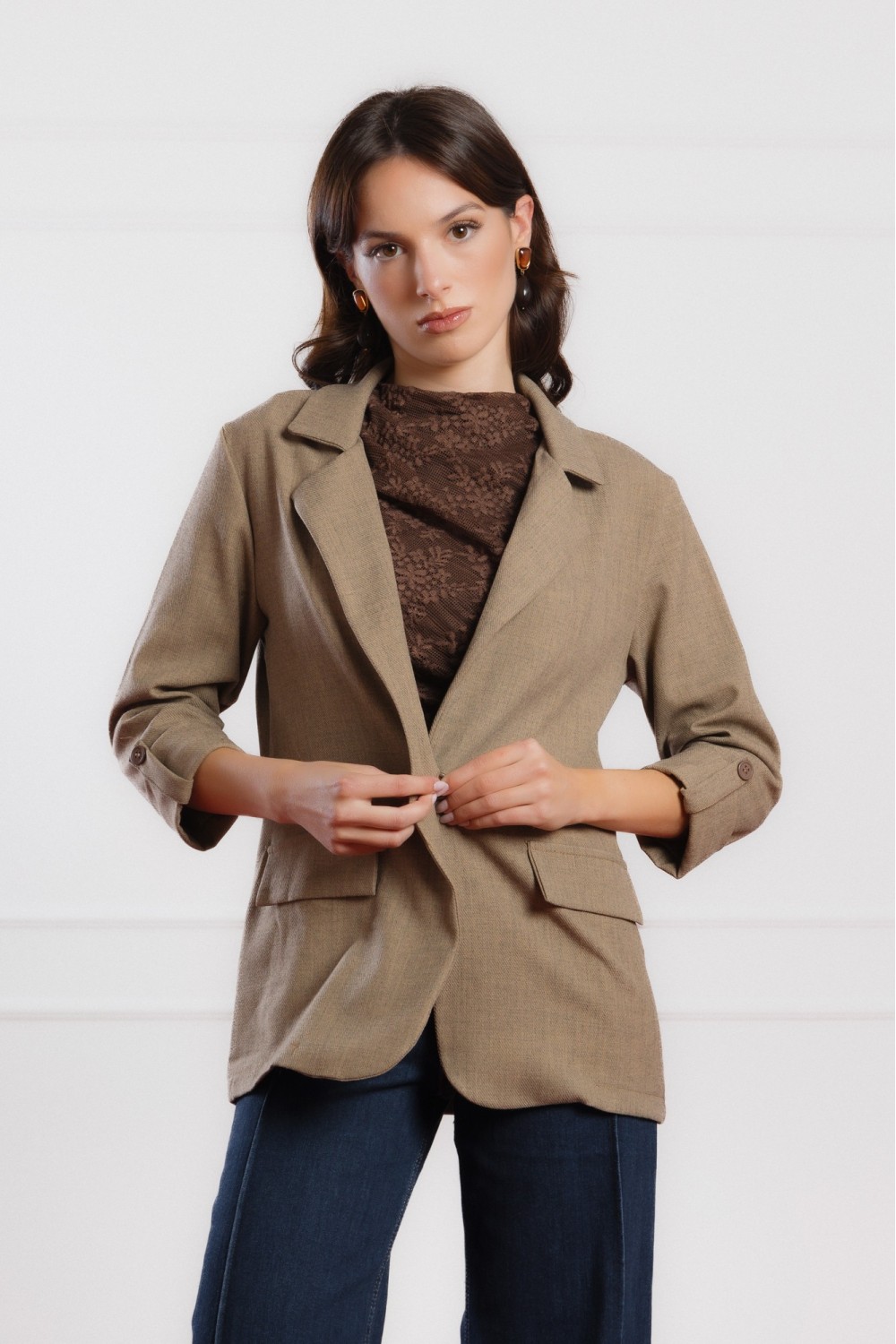 Smeđi sako s 3/4 rukavima savršen je izbor za prijelazne sezone i elegantne svakodnevne kombinacije. Lagano strukirani kroj naglašava siluetu, dok mekani materijal i podstava osiguravaju udo..