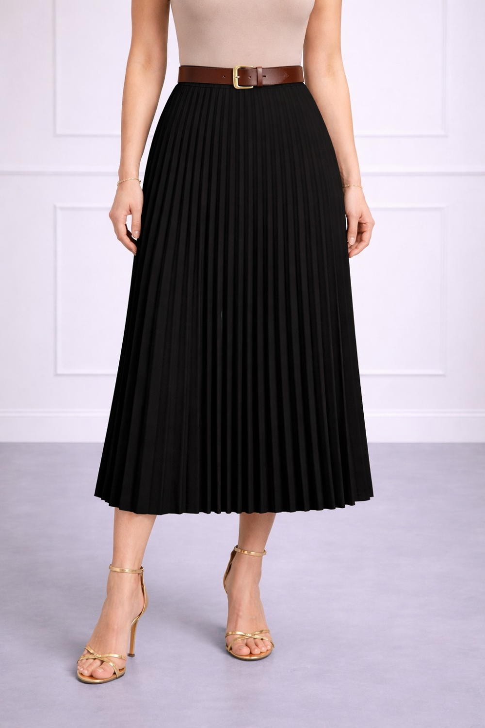 Elegantna midi bež suknja visokog struka savršen je izbor za profinjen i ženstven izgled. Ovaj model ravnog kroja nježno prati liniju tijela te vizualno izdužuje siluetu, dok dekorativni gum..