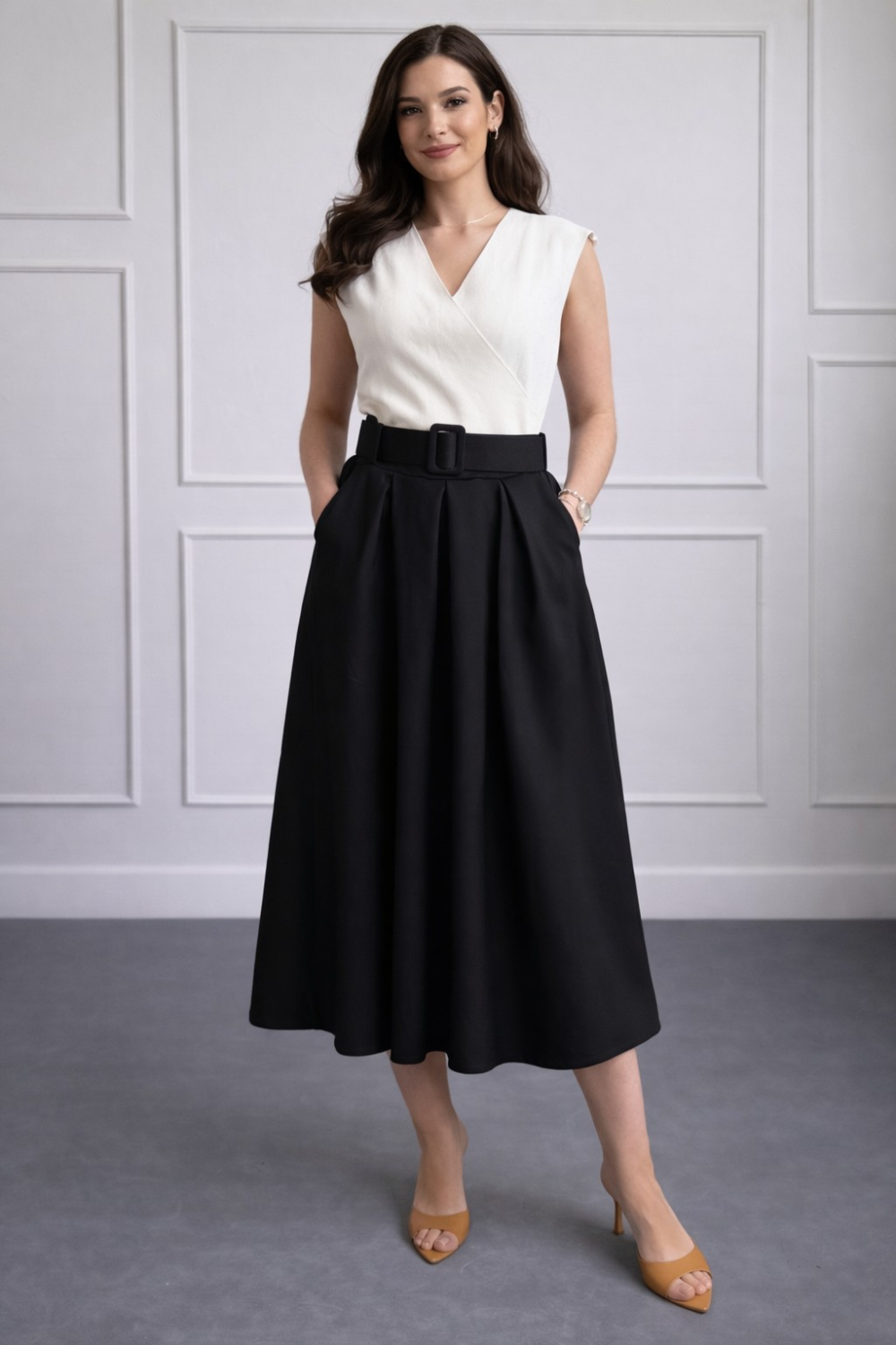 Elegantna midi bež suknja visokog struka savršen je izbor za profinjen i ženstven izgled. Ovaj model ravnog kroja nježno prati liniju tijela te vizualno izdužuje siluetu, dok dekorativni gum..