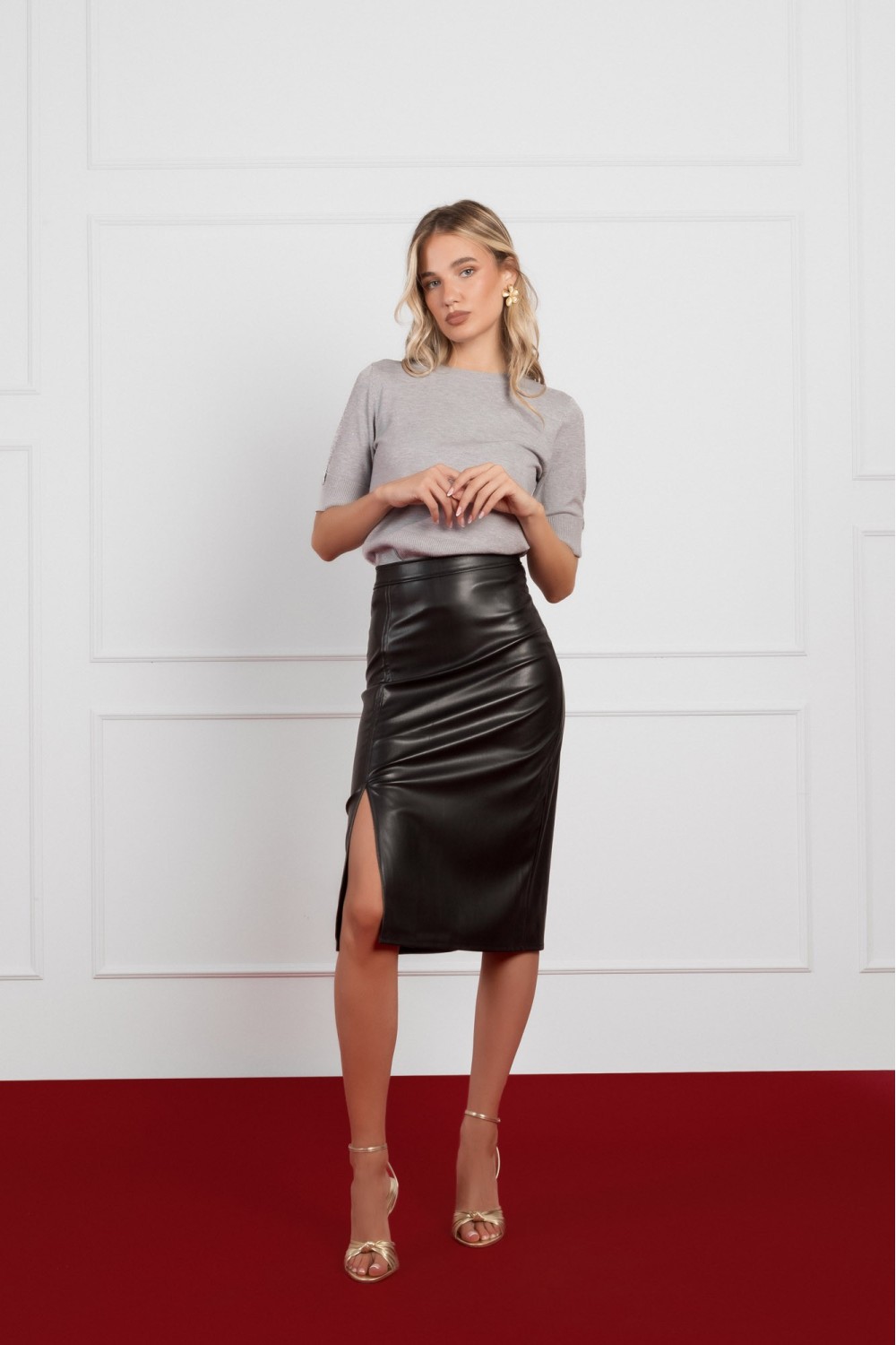 Crna midi suknja od umjetne kože koja istovremeno izgleda elegantno i moderno. Zahvaljujući rastezljivom i udobnom materijalu, lako se prilagođava figuri i idealna je za dnevne i večernje ko..