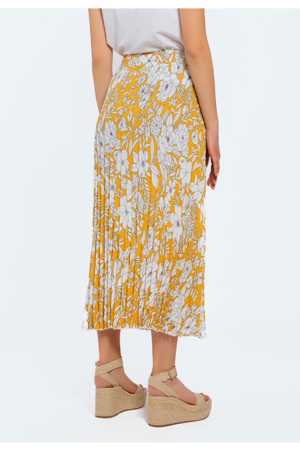 Plisirana bež suknja sa prošivenim detaljima. Elastičnoga struka.95% POLIESTER, 5% ELASTINModel je visok 180 cm i nosi veličinu S/V36..