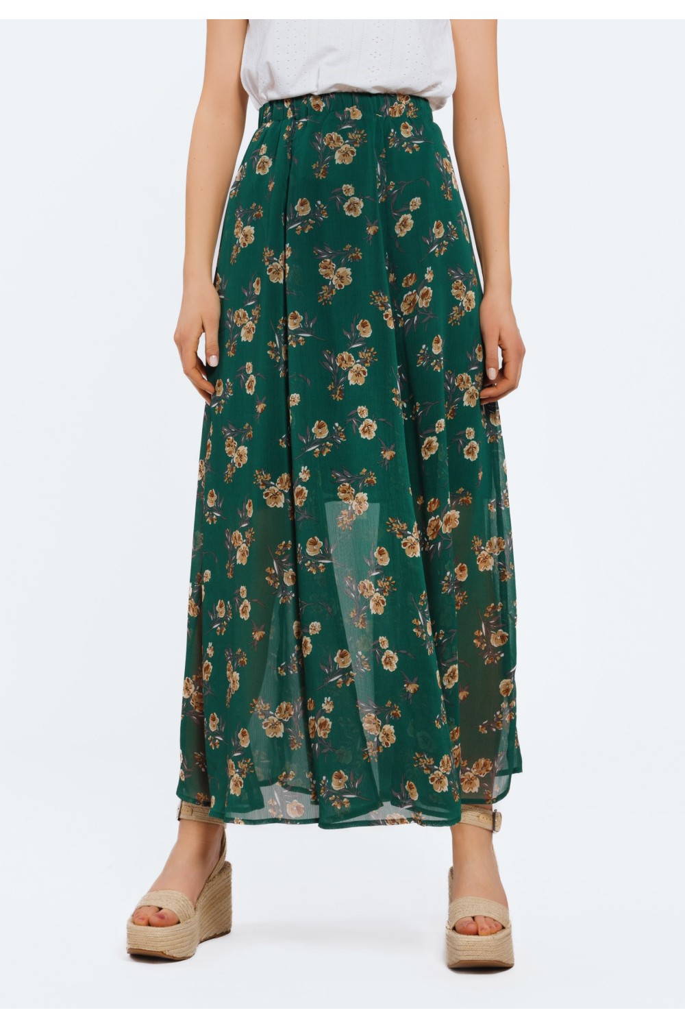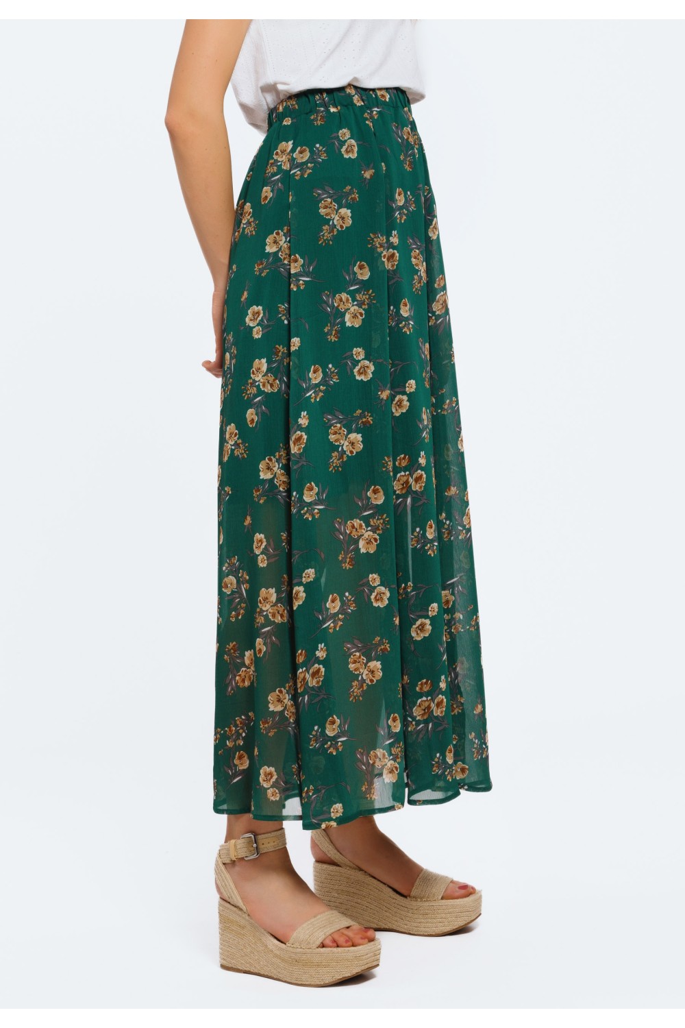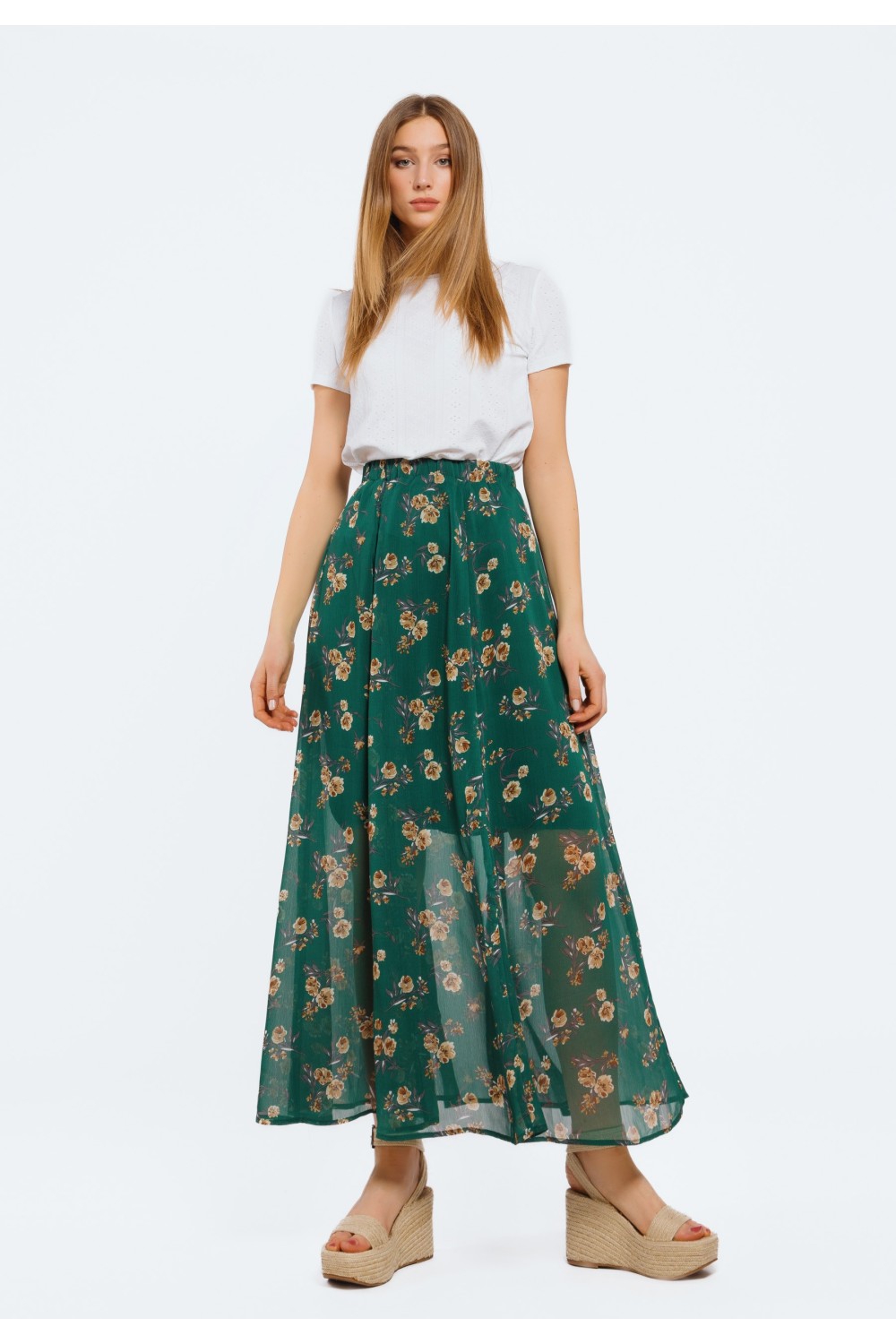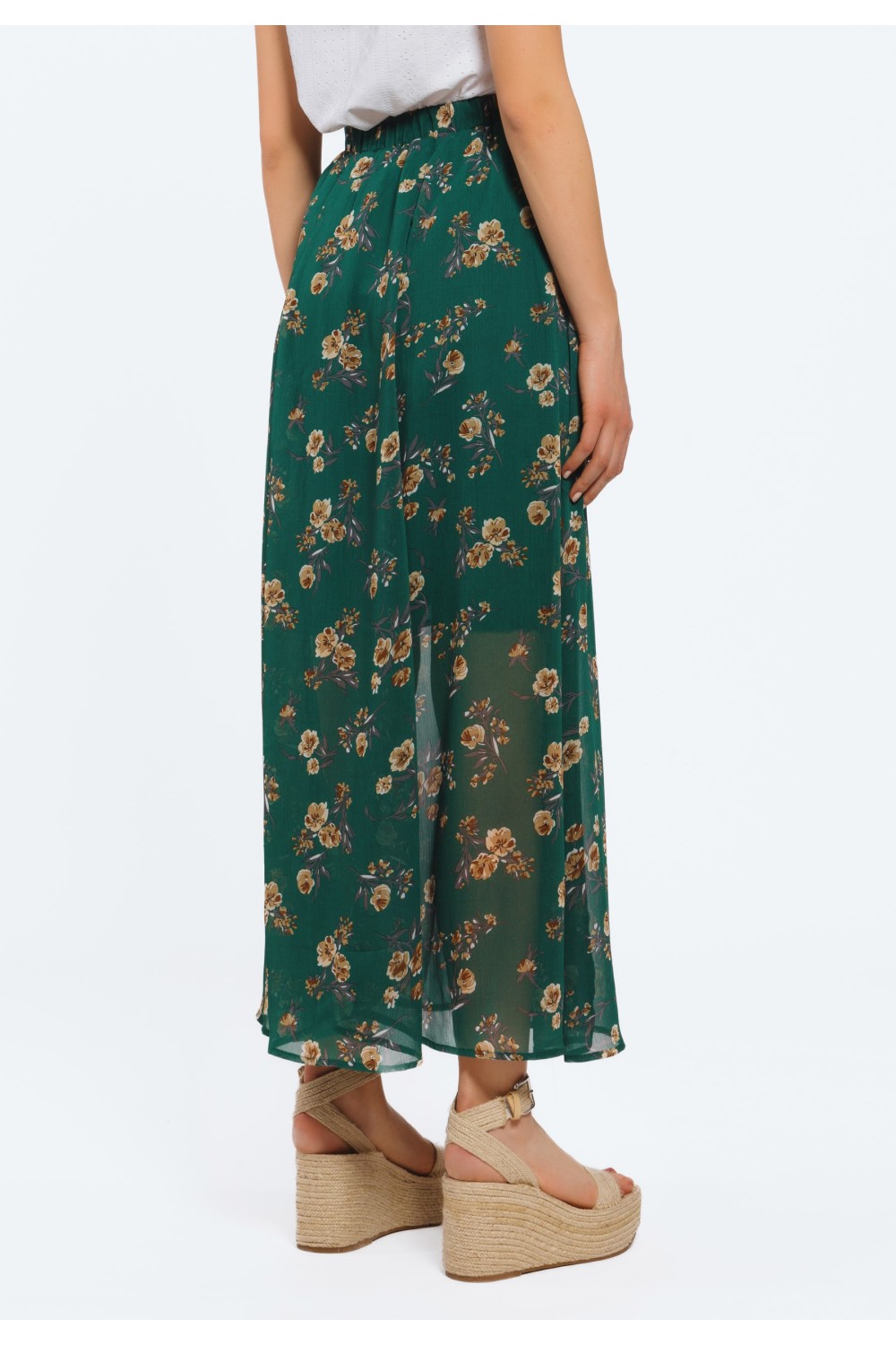 Cvjetna suknja maxi dužine. Kopčanje sprijeda utoniranim dugmadima. Sprijeda prorez. Suknja je elastičnoga struka. -100% VISKOZAModel je visok 180 cm i nosi veličinu S/V36-100% PAMUKModel je..