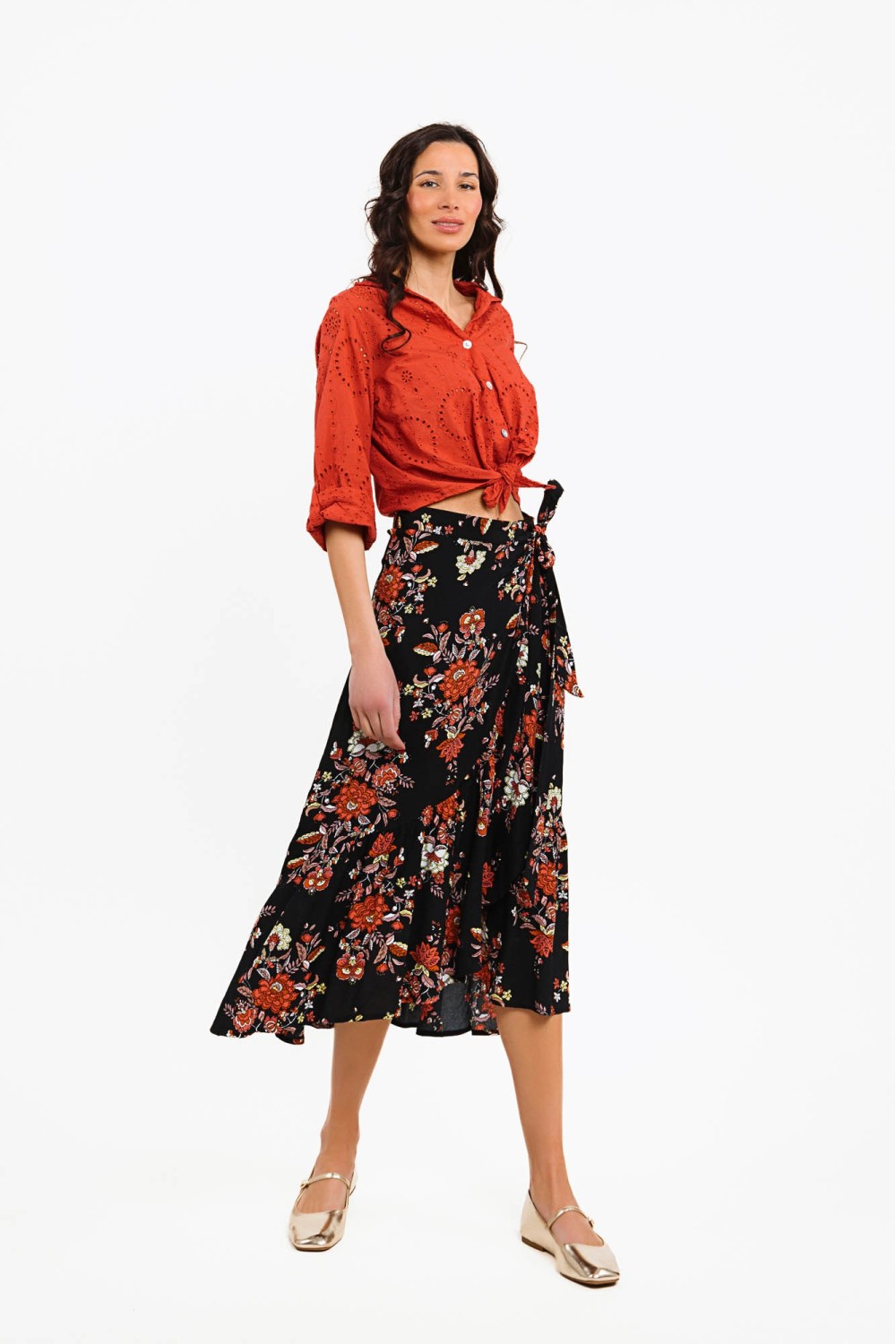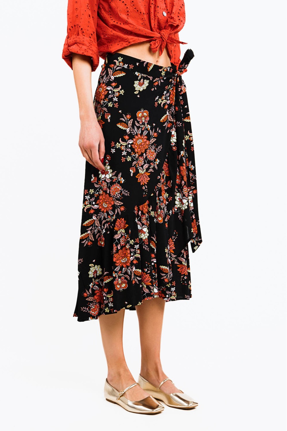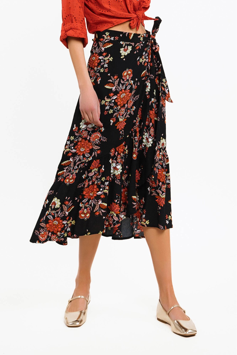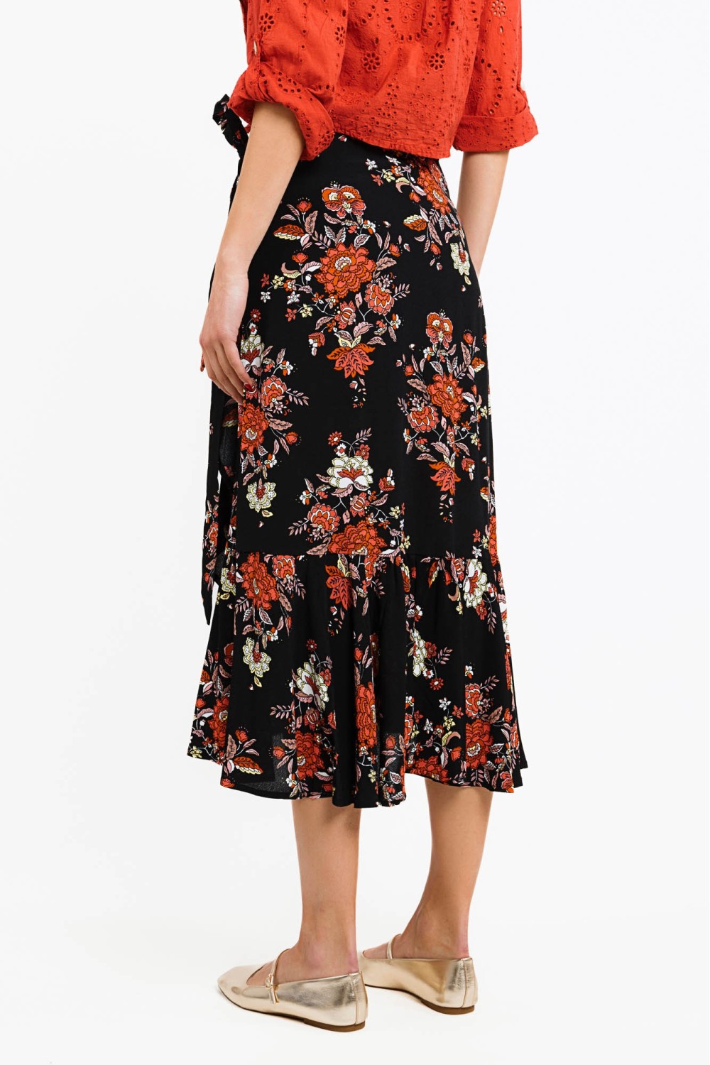 Traper suknja sa sangalom u bež boji. Ušiveni detlaji cvijeća. Elastičan struk. -100% TENCELModel je visok 180 cm i nosi veličinu S..