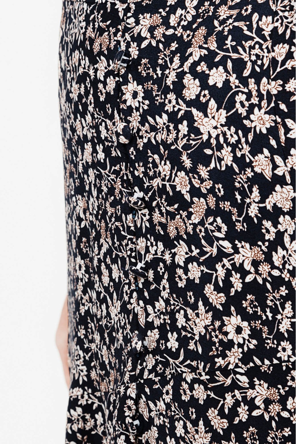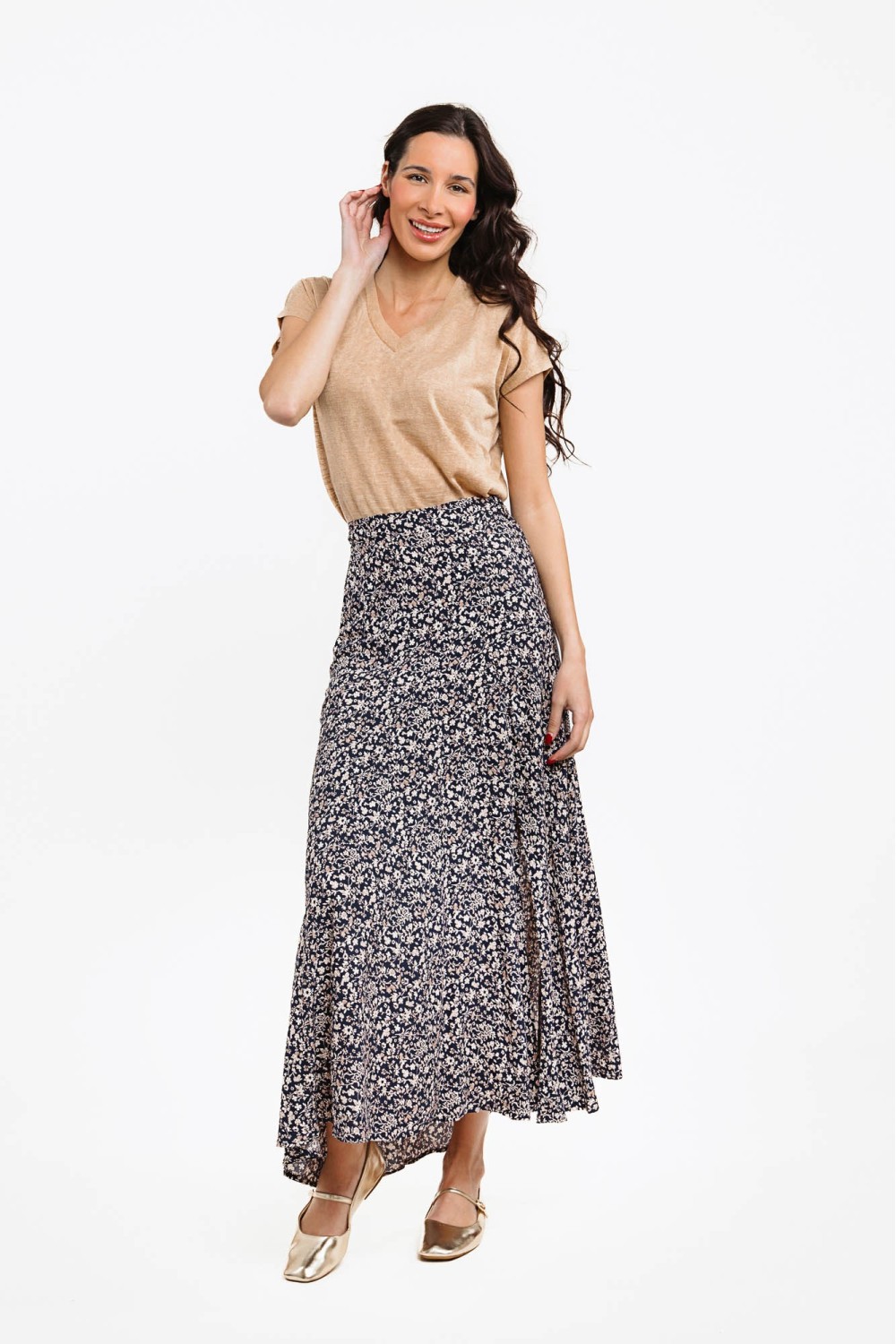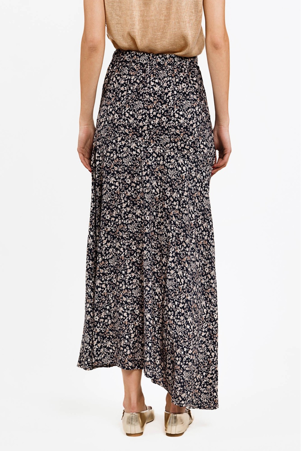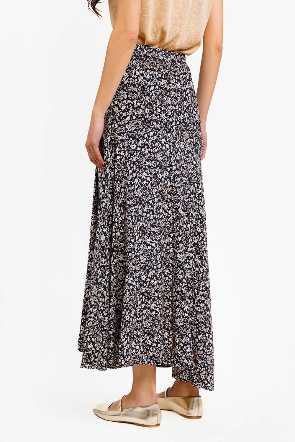 Lepršava cvijetna suknja, asimetričnoga kroja. Kopčanje na preklop sa unutarnjim gumbom, te drugim bočnim gumbom. U struku ušiveni pojas u istome paternu. Donji dio suknje prišiven sa efekto..