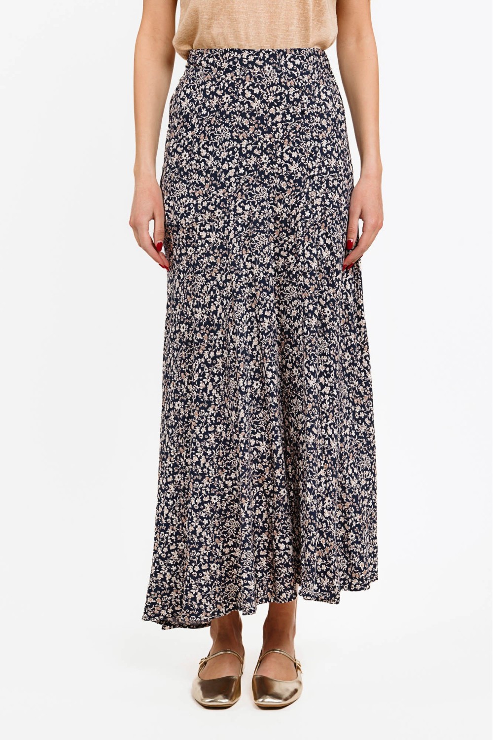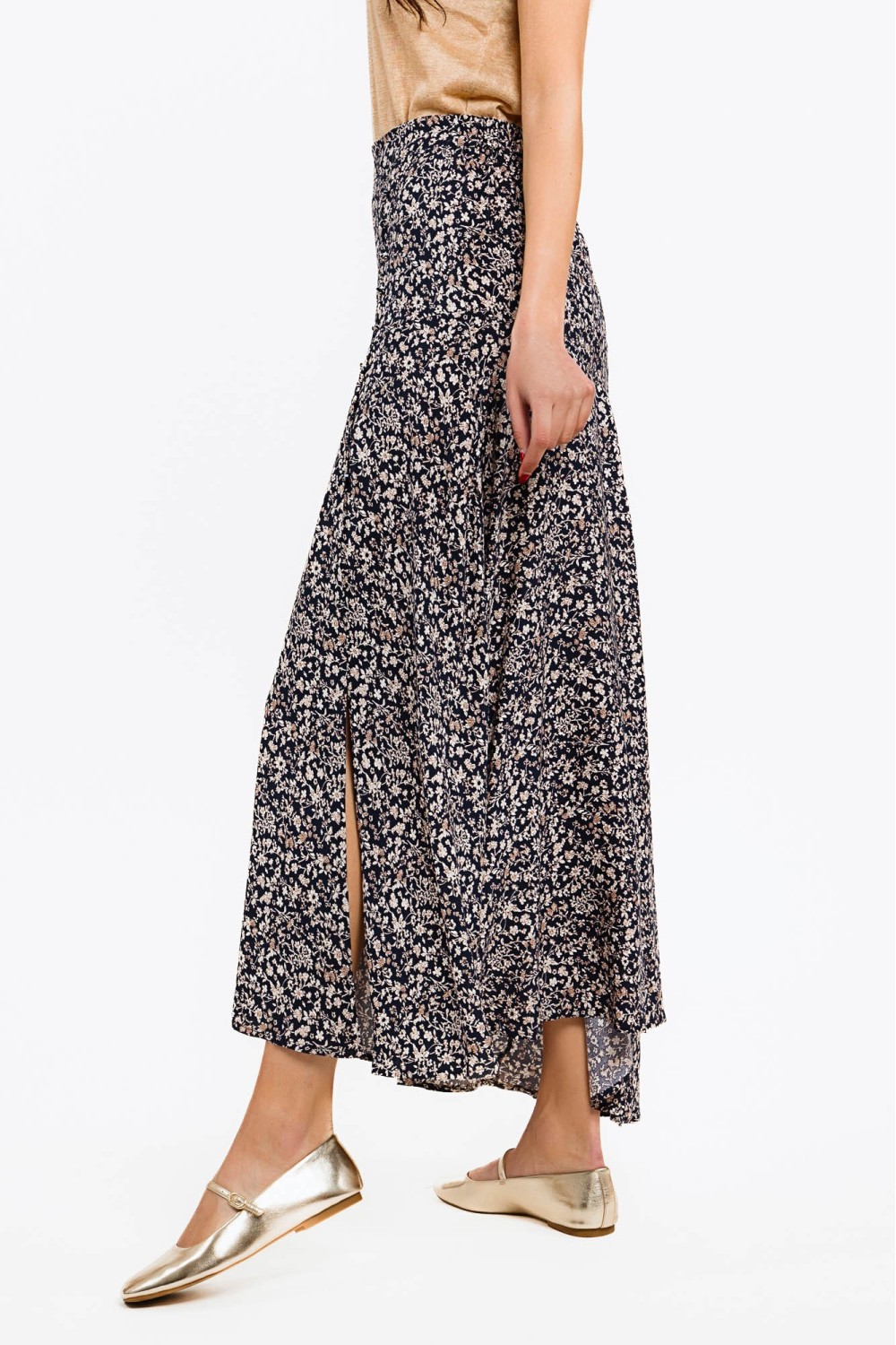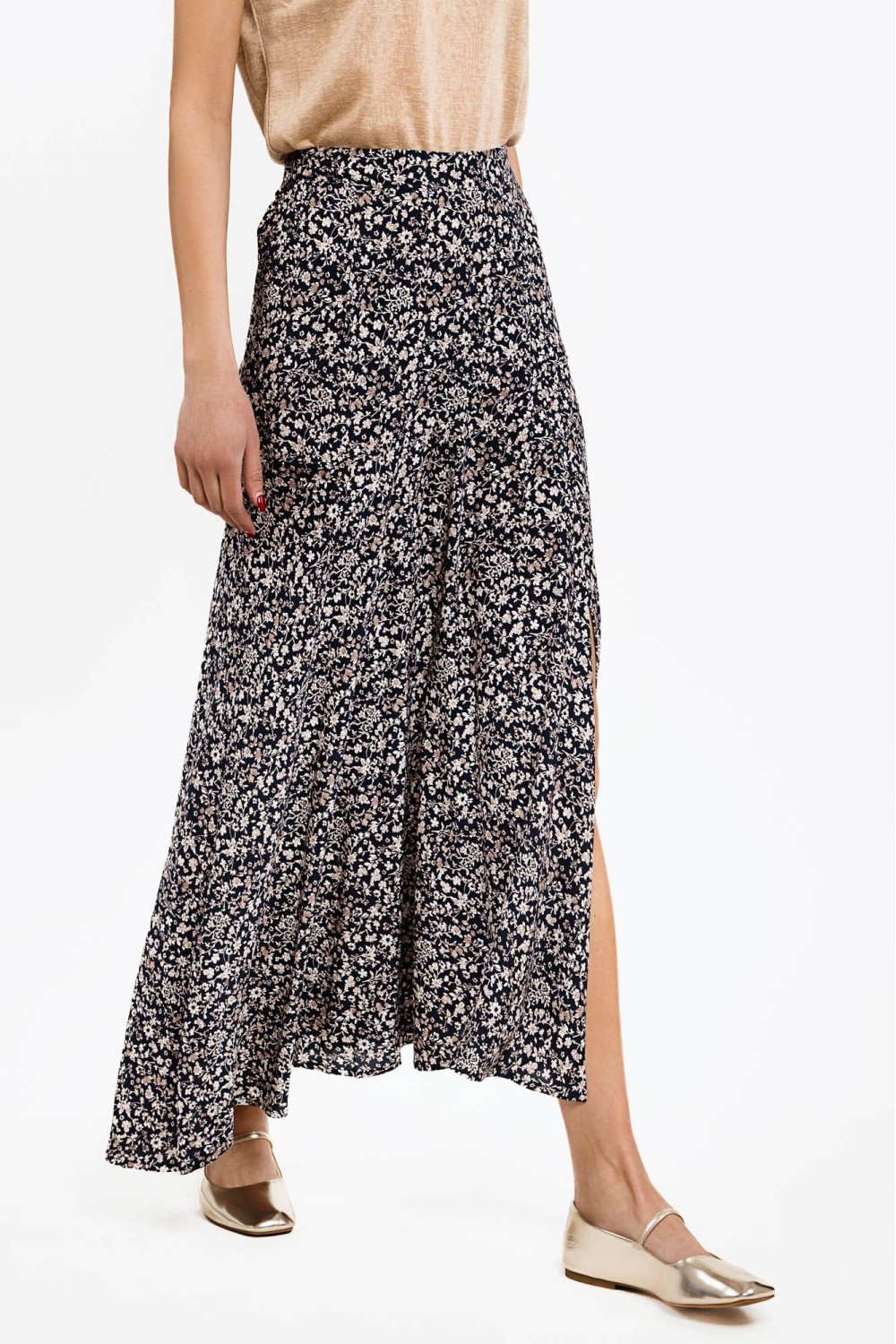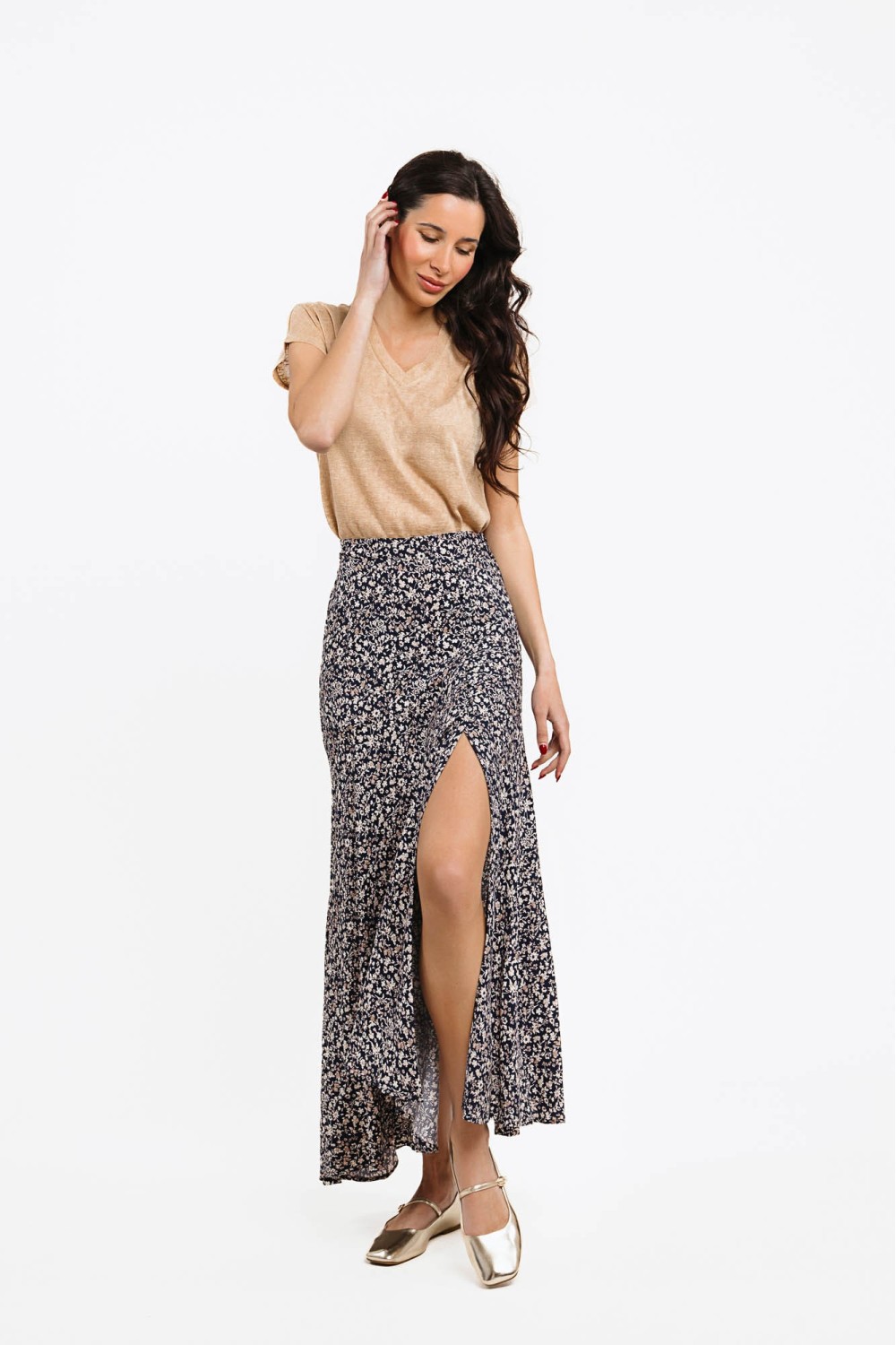 Lepršava cvijetna suknja, asimetričnoga kroja. Kopčanje na preklop sa unutarnjim gumbom, te drugim bočnim gumbom. U struku ušiveni pojas u istome paternu. Donji dio suknje prišiven sa efekto..