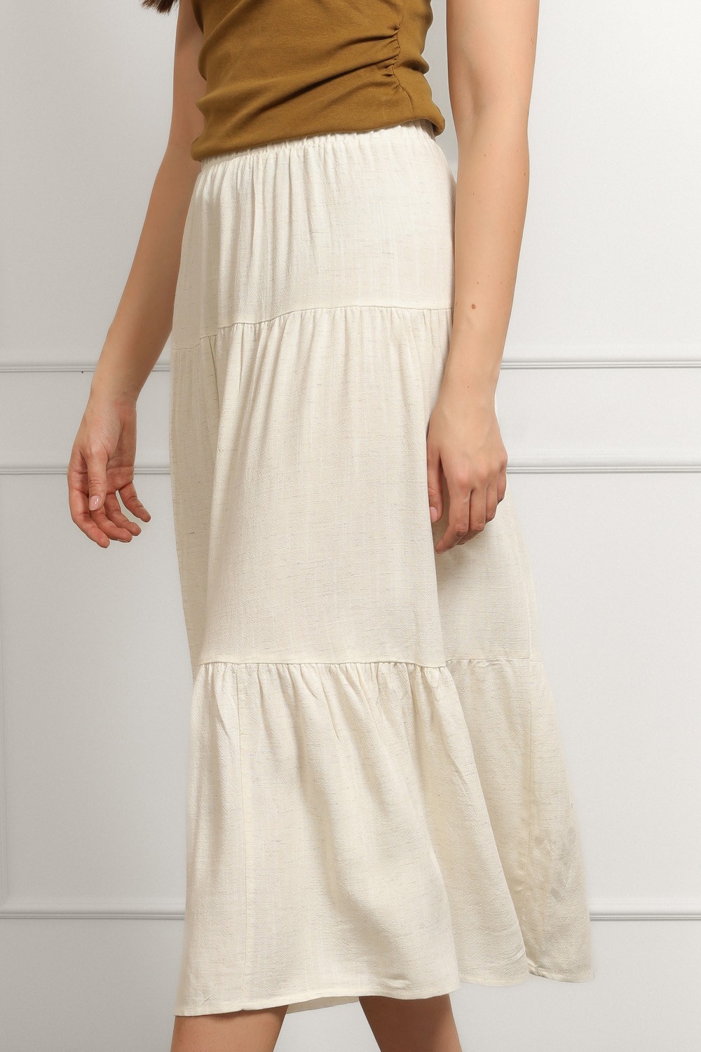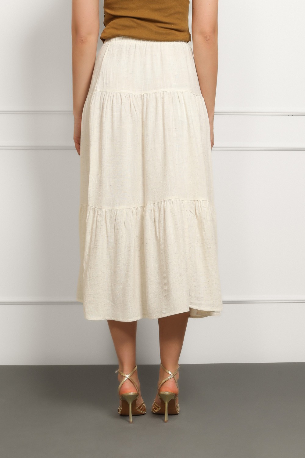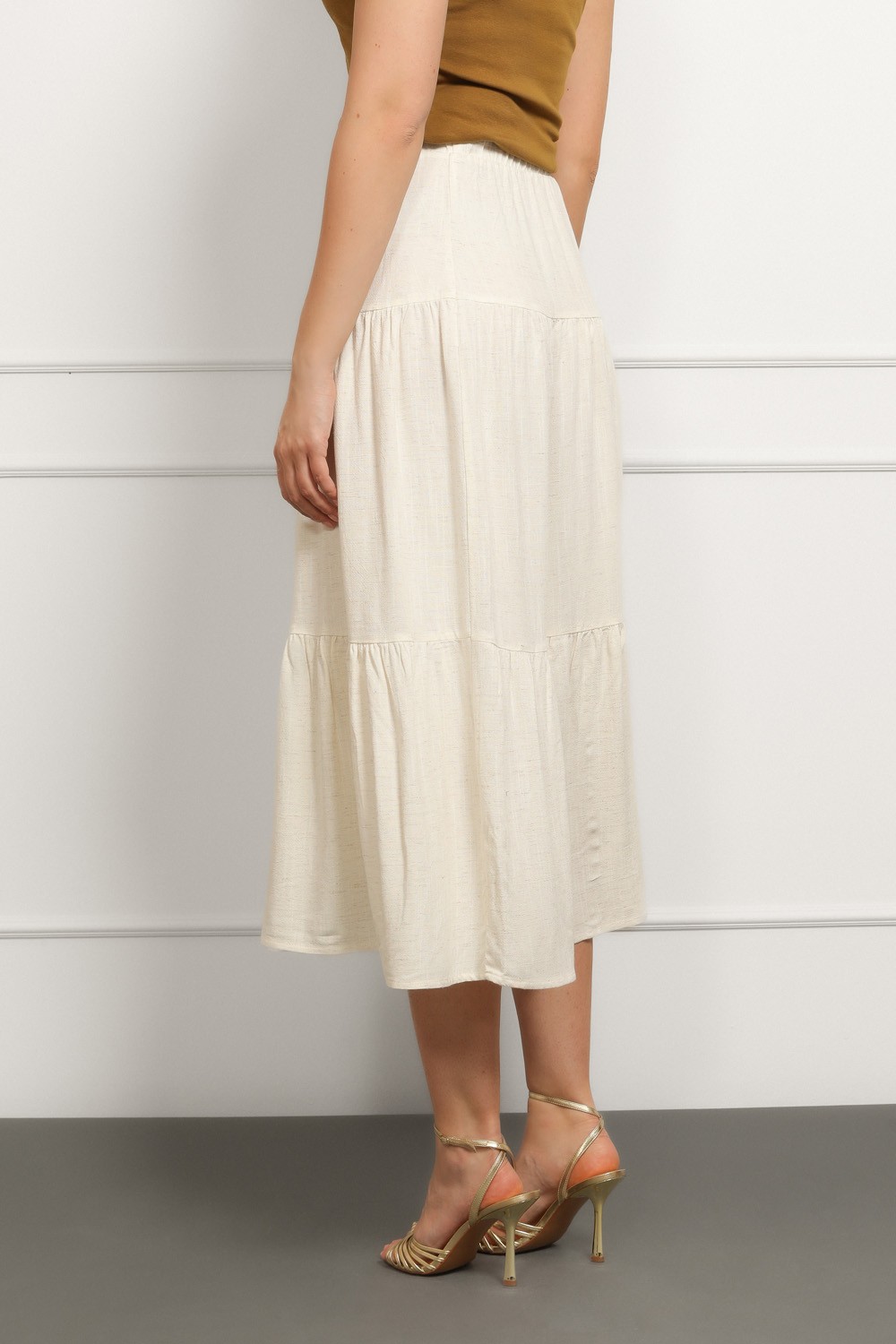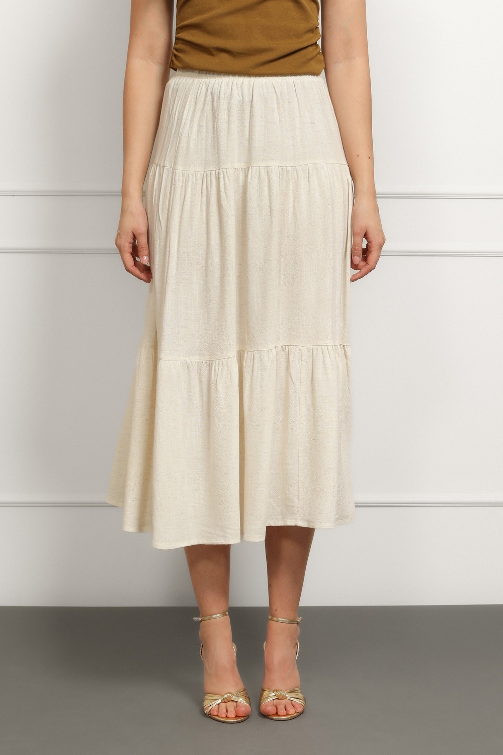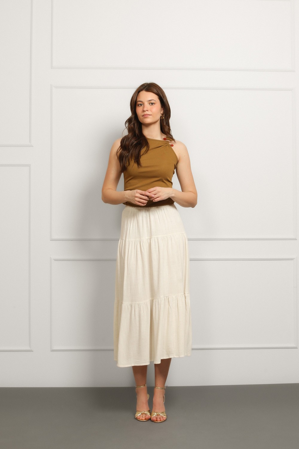 Elegantna midi bež suknja visokog struka savršen je izbor za profinjen i ženstven izgled. Ovaj model ravnog kroja nježno prati liniju tijela te vizualno izdužuje siluetu, dok dekorativni gum..
