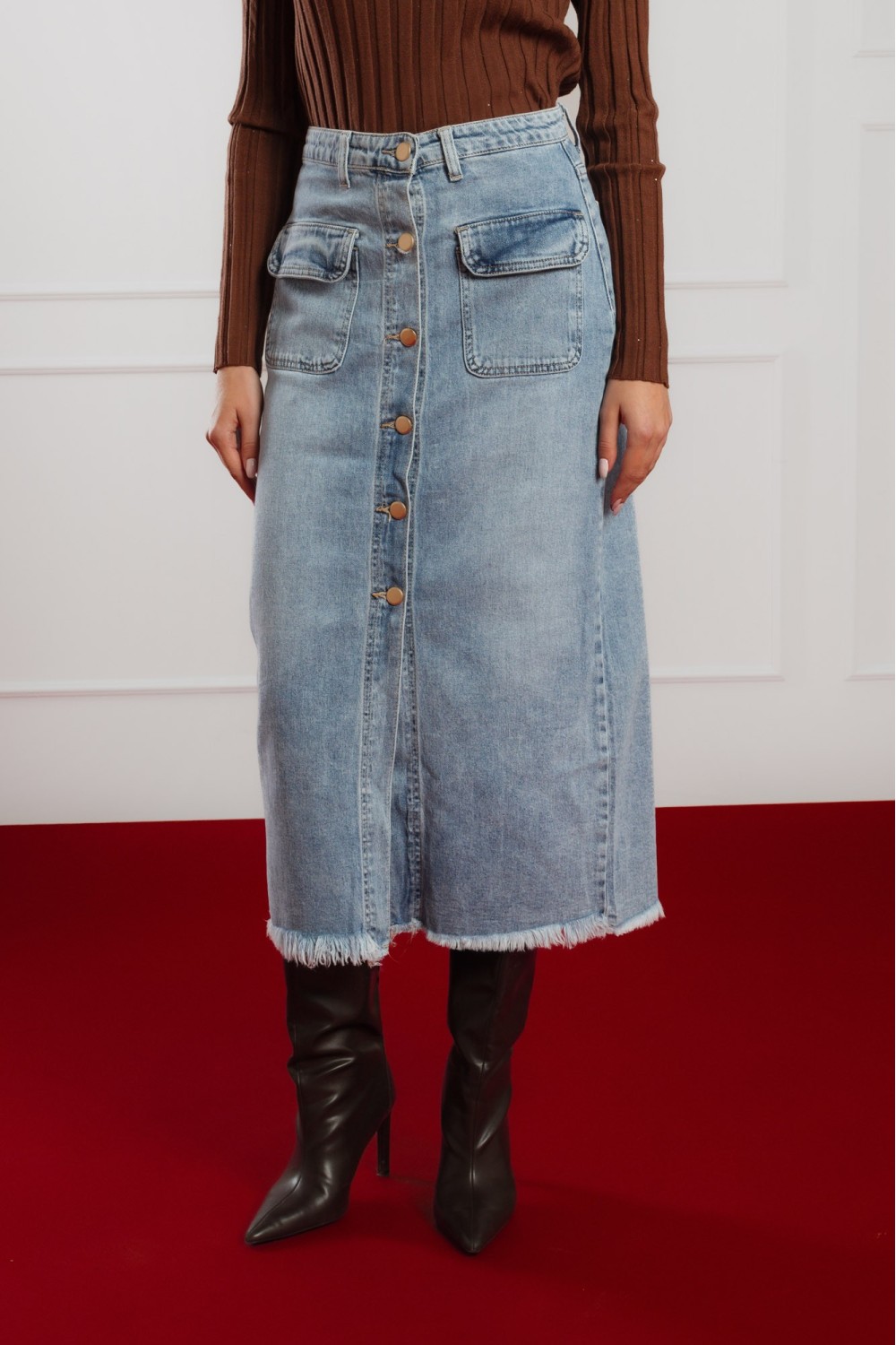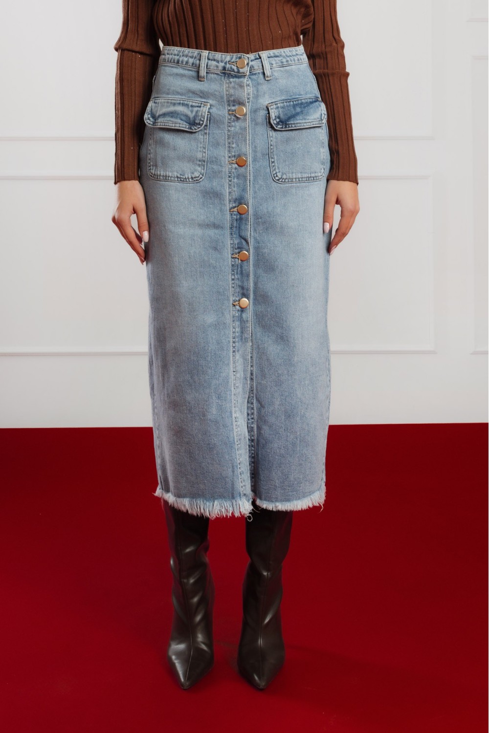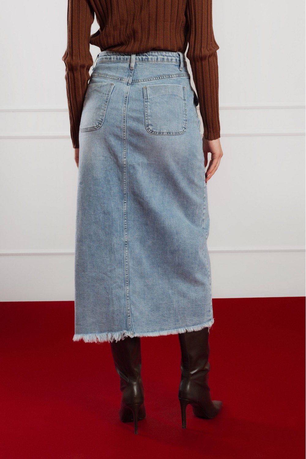 Crna maxi traper suknja s prorezom sprijeda donosi savršenu ravnotežu između klasičnog i modernog stila. High-waist kroj ističe struk, dok dužina i prorez daju eleganciju i slobodu pokreta. ..