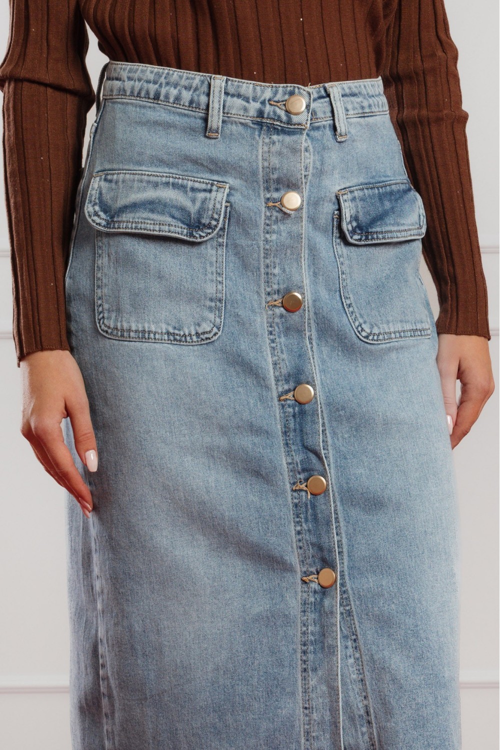 Duga suknja sa atraktivnim animal printom u kombinaciji smeđe, zlatne i bijele boje. Ova suknja pruža lagan i ugodan osjećaj tijekom nošenja, dok trendi uzorak unosi dozu hrabrosti i moderno..
