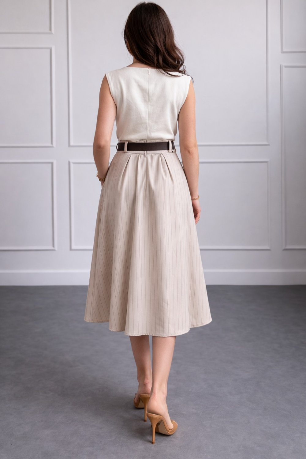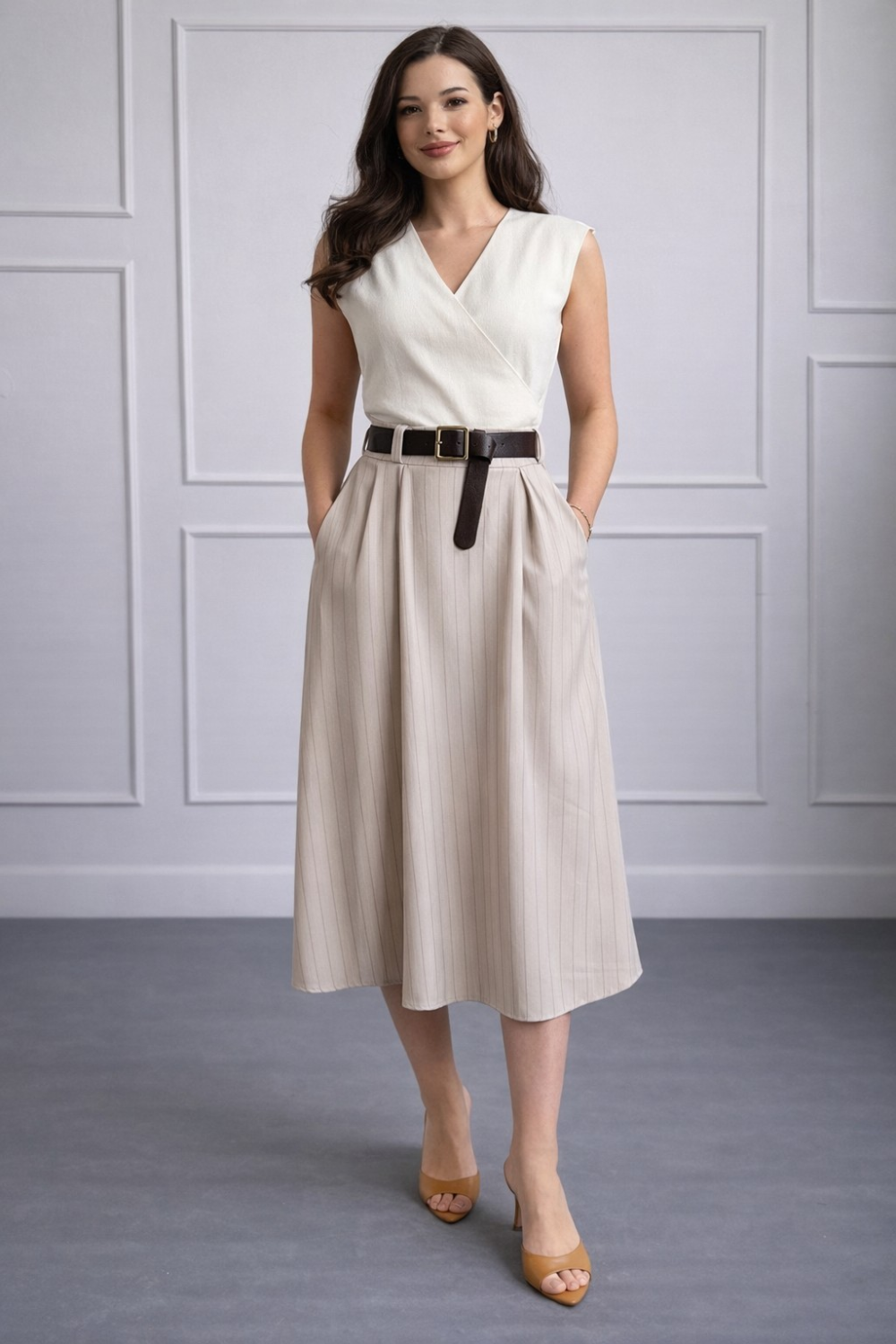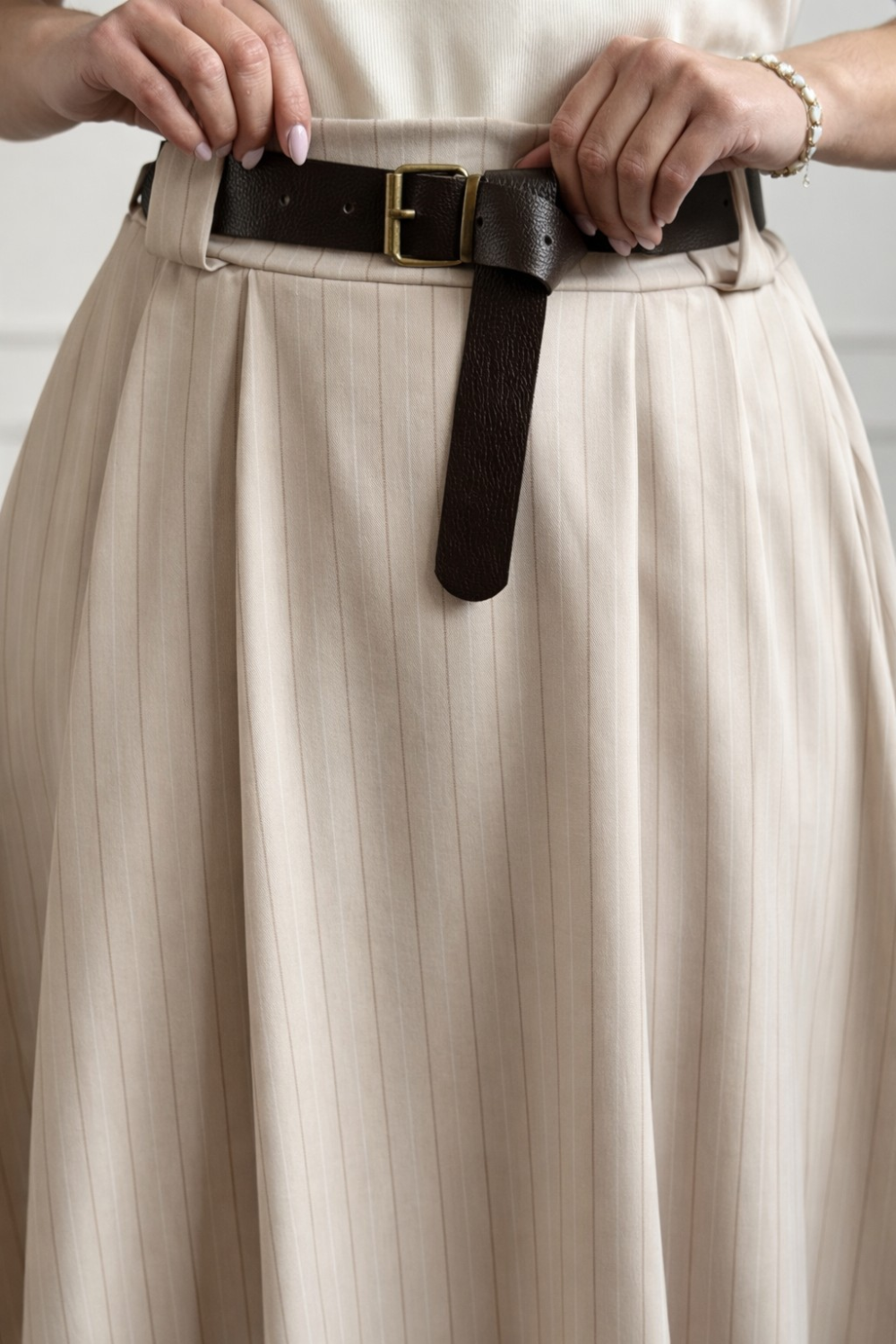 Elegantna midi bež suknja visokog struka savršen je izbor za profinjen i ženstven izgled. Ovaj model ravnog kroja nježno prati liniju tijela te vizualno izdužuje siluetu, dok dekorativni gum..