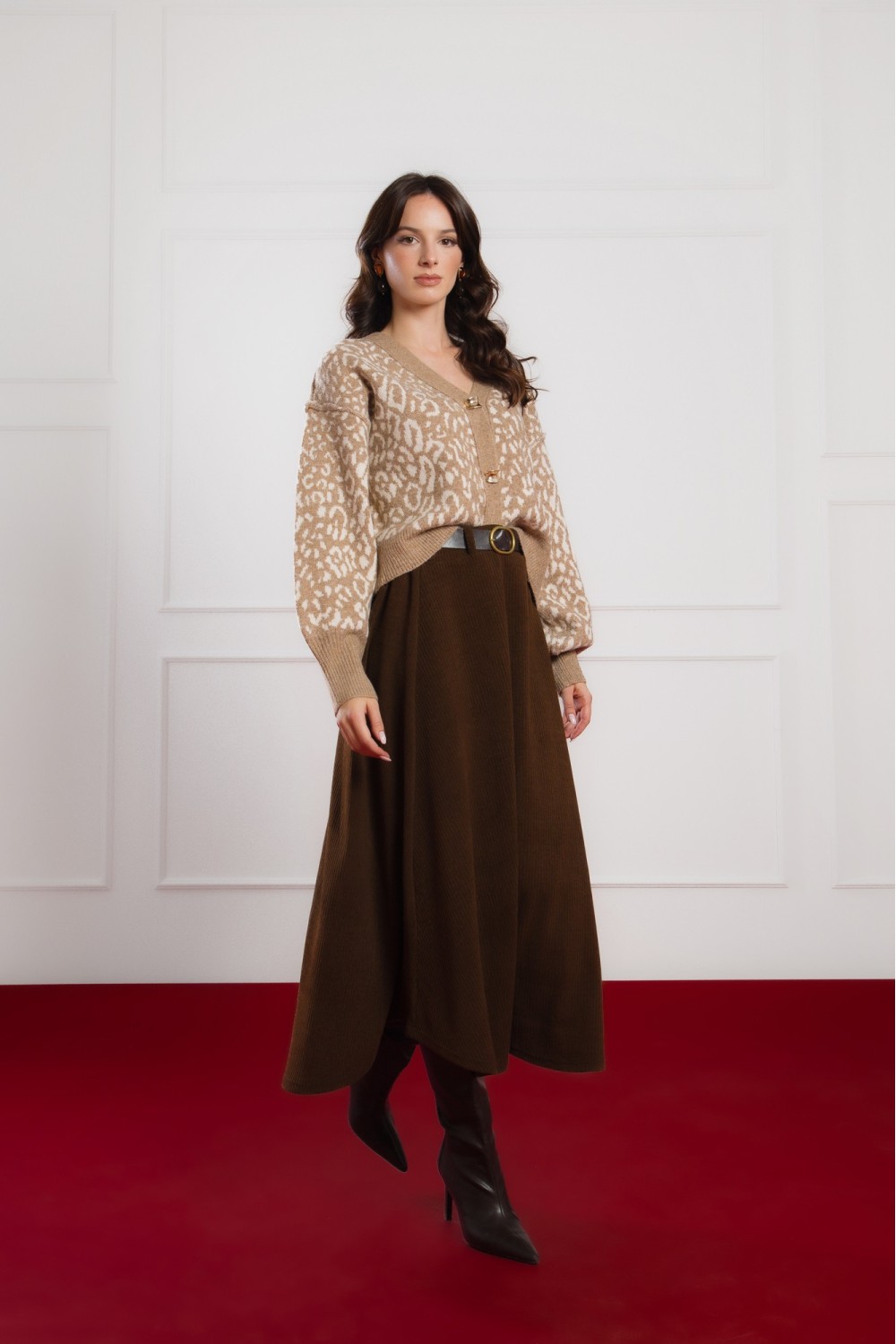 Duga suknja sa atraktivnim animal printom u kombinaciji smeđe, zlatne i bijele boje. Ova suknja pruža lagan i ugodan osjećaj tijekom nošenja, dok trendi uzorak unosi dozu hrabrosti i moderno..