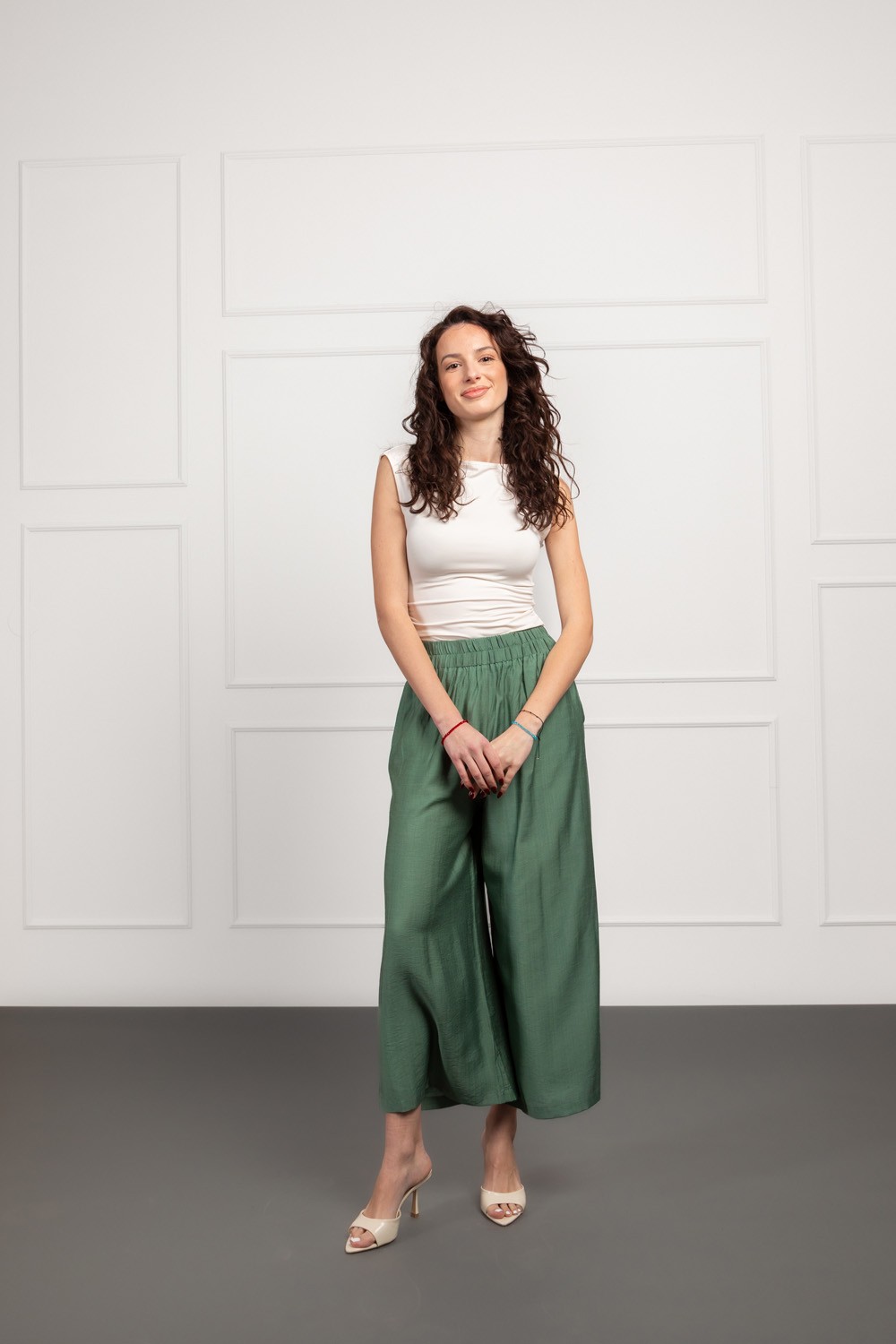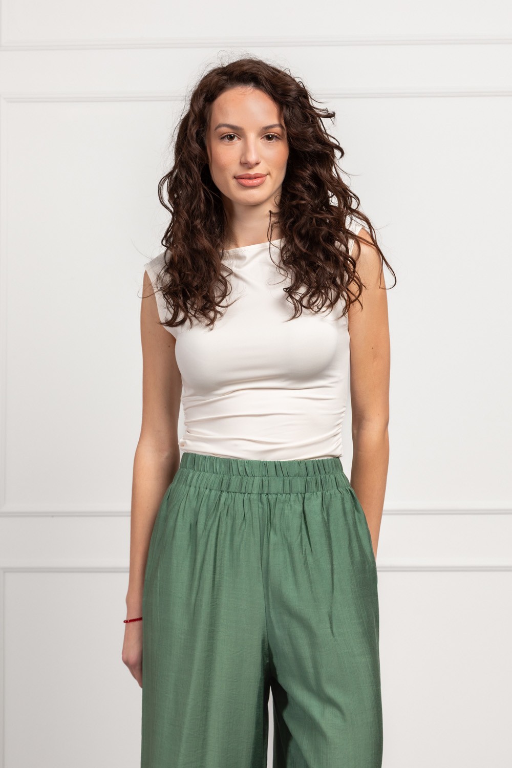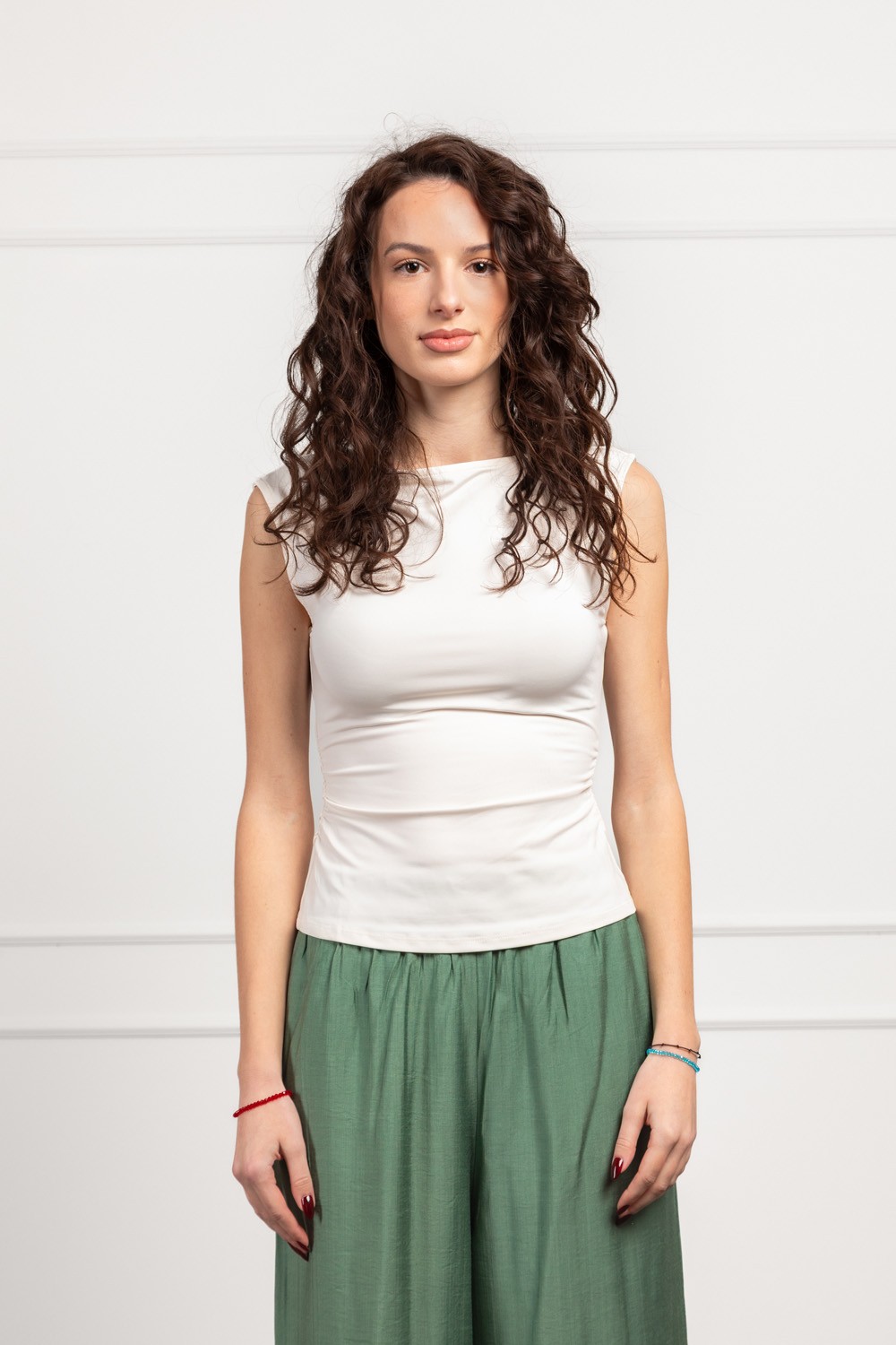 Jednostavan, ali izuzetno efektan top bez rukava u neutralnoj bež nijansi koji pristaje na doslovno sve. Materijal je gladak, mekan i elastičan pa lijepo prati liniju tijela bez stezanja. Blagi drapirani detalji uz bokove daju diskretnu ženstvenost i vizualno lijepo oblikuju struk.