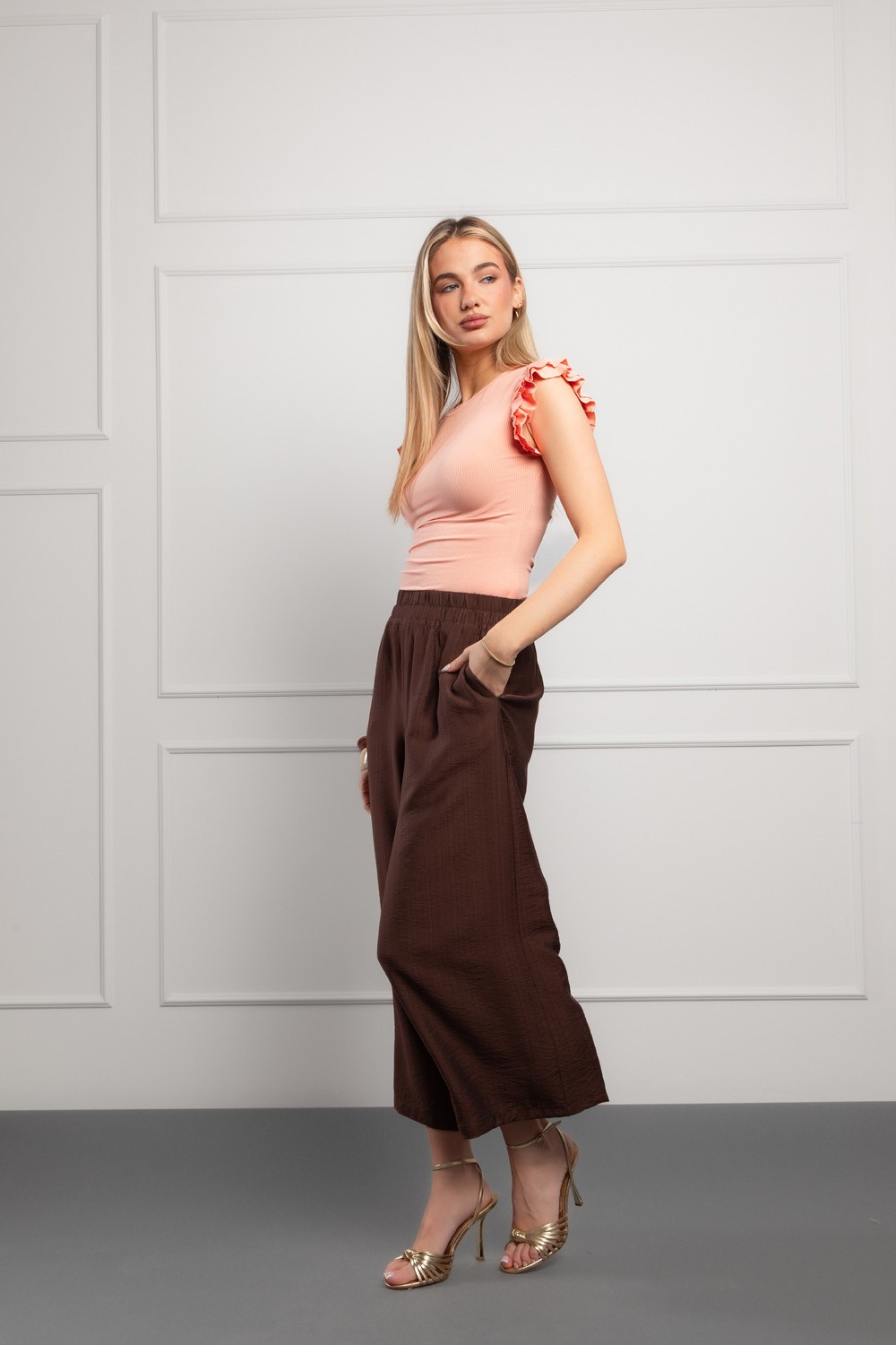 Ženski rebrasti top u nježnoj losos nijansi donosi savršenu kombinaciju udobnosti i ženstvenog stila. Izrađen od elastičnog i mekanog materijala, ugodno prianja uz tijelo i prilagođava se pokretima, što ga čini idealnim izborom za svakodnevno nošenje.