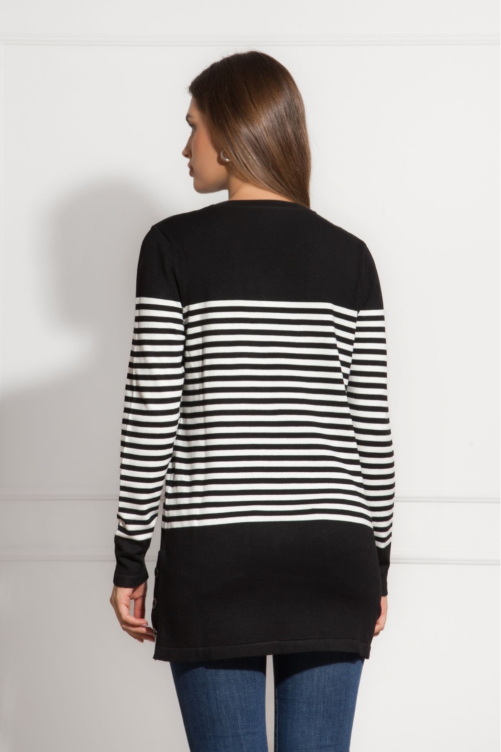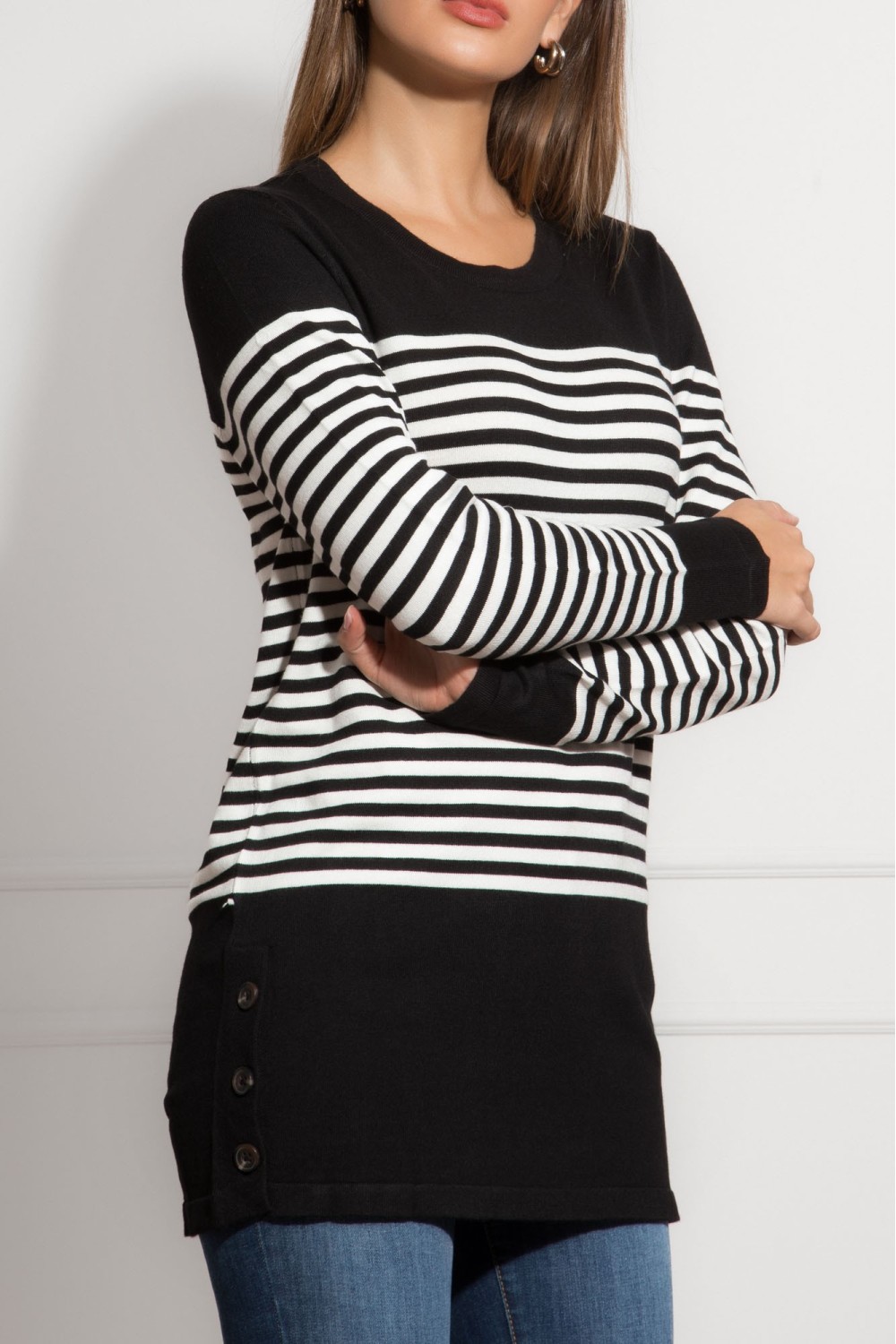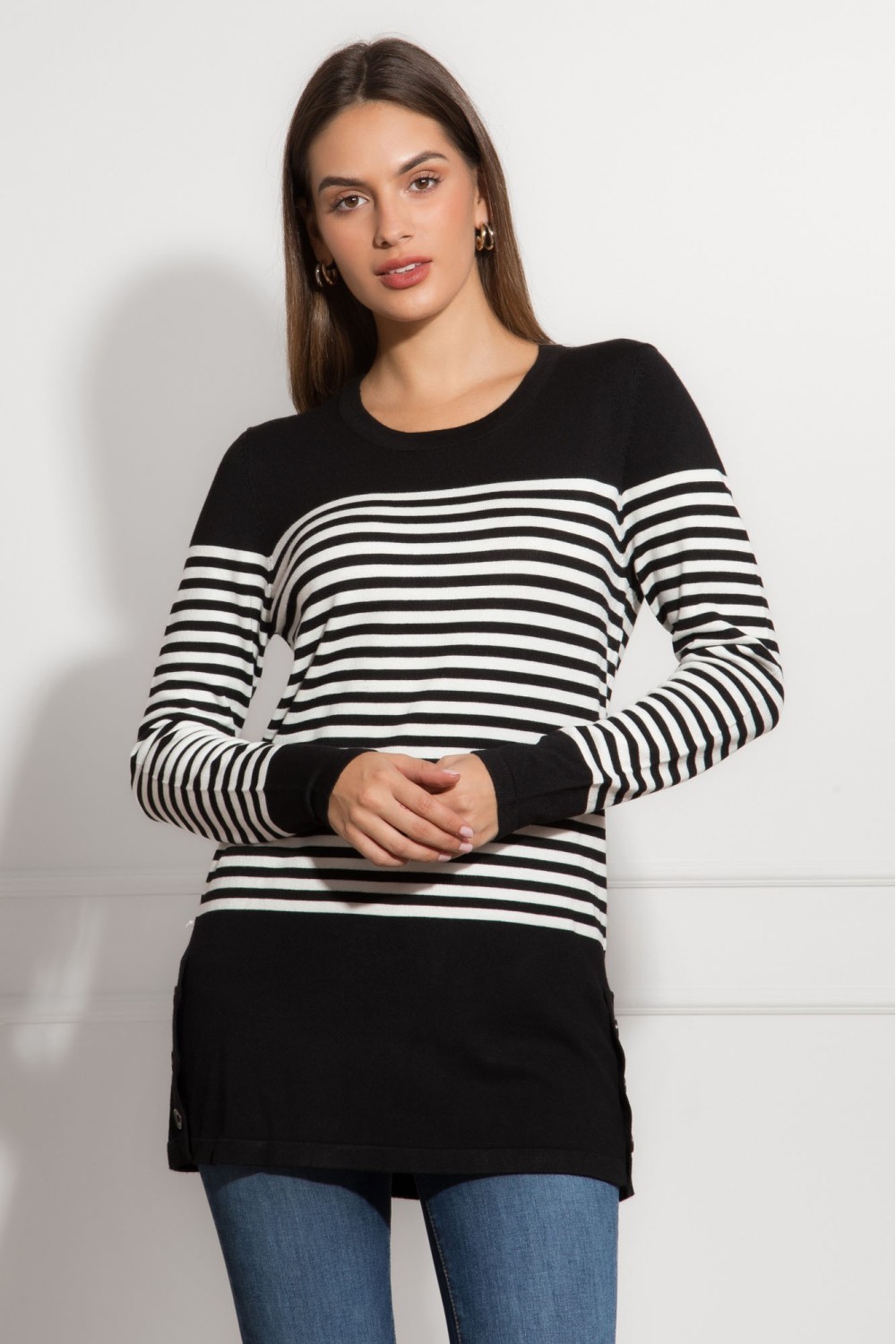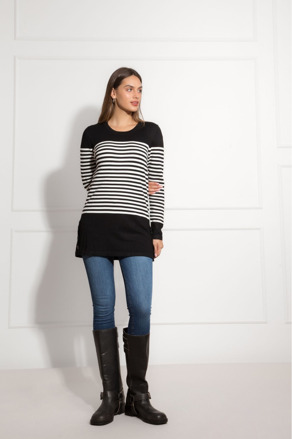 Crna majica dugih rukava izrađena od mekane viskoze s dodatkom elastina pruža udobnost i savršeno pristajanje. Posebno je ukrašena suptilnim sitnim cirkonima uz izrez, koji dodaju dašak eleg..