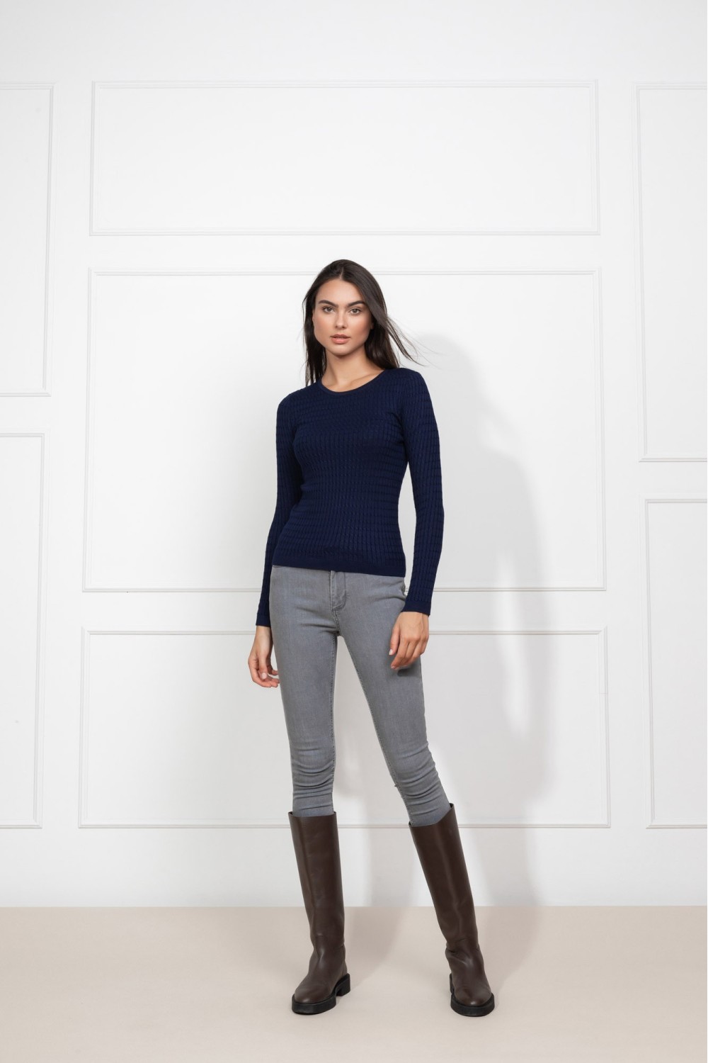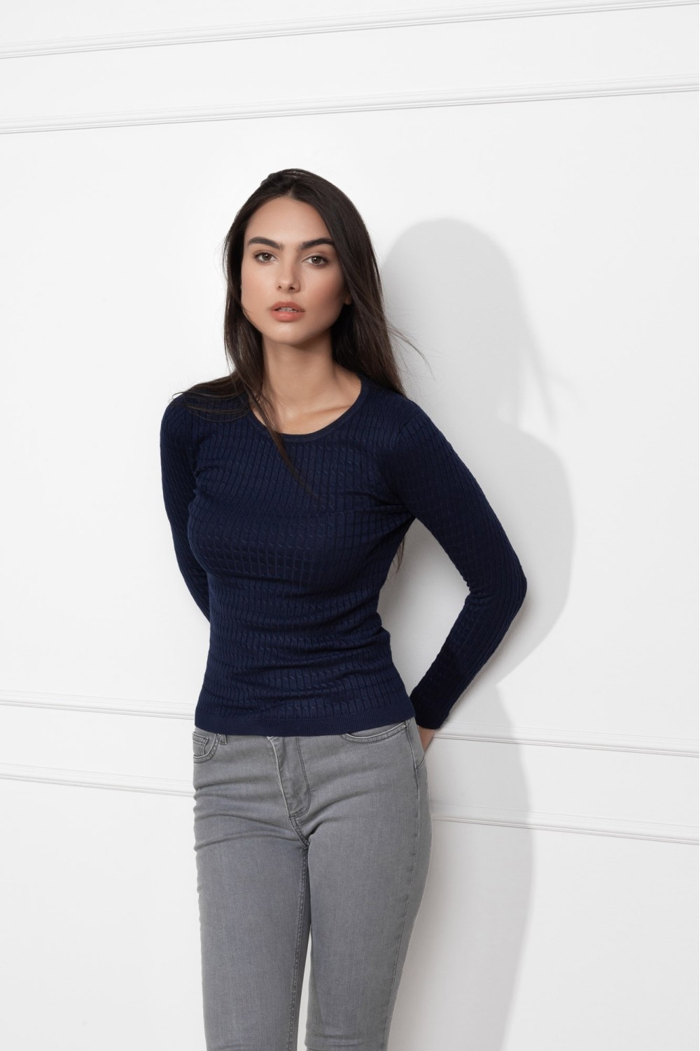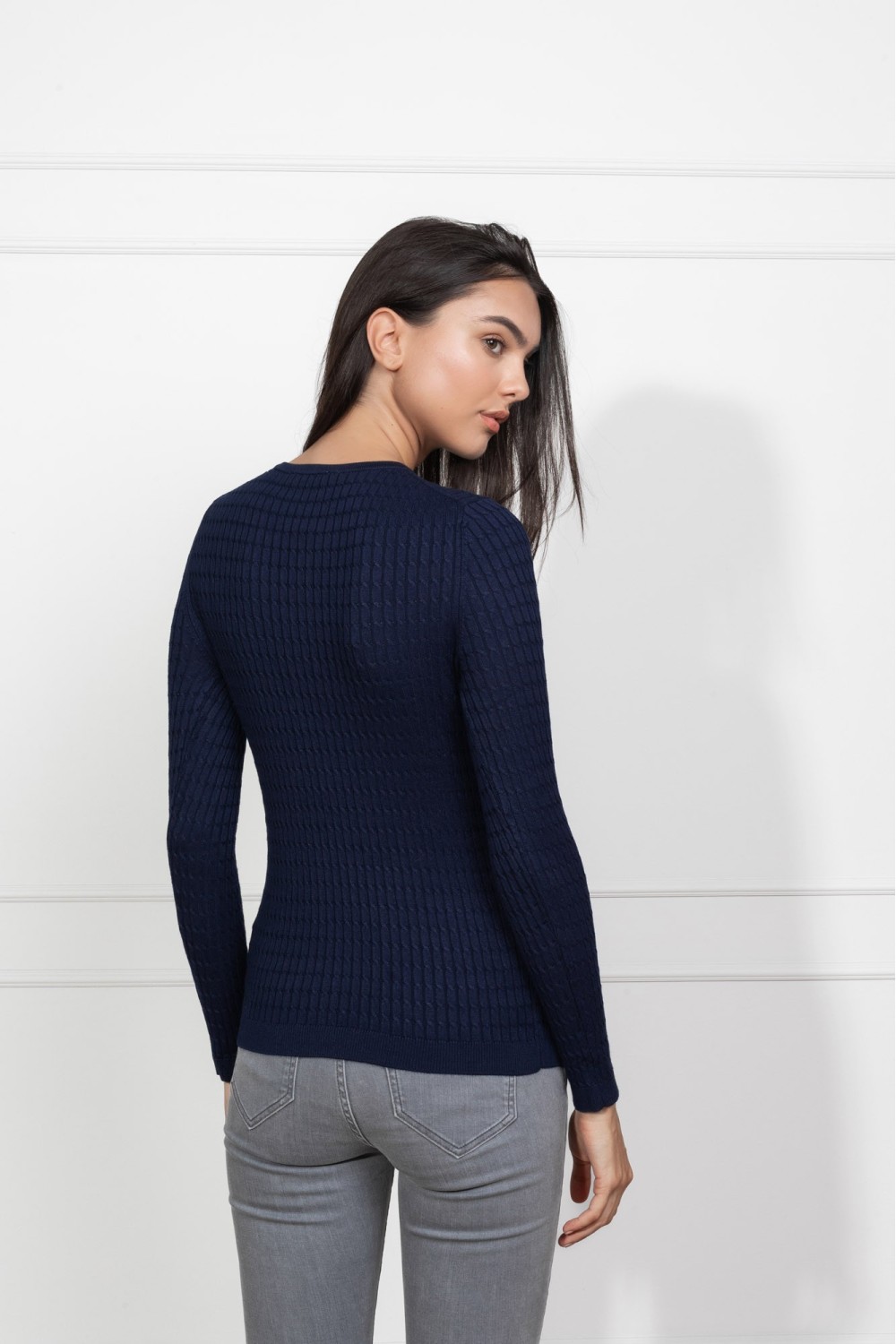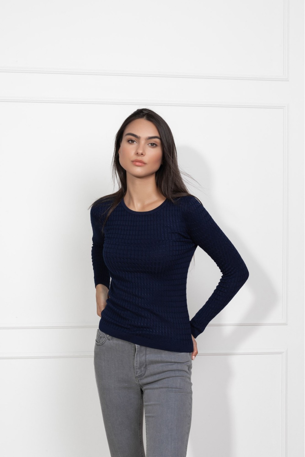 Pletena midi haljina uz tijelo, dugog rukava i povišenog ovratnika sa detaljima pletiva sprijeda.-50% VISKOZA, 30% POLIESTER, 20% NAJLON Model je visok 180 cm i nosi veličinu S/V36..