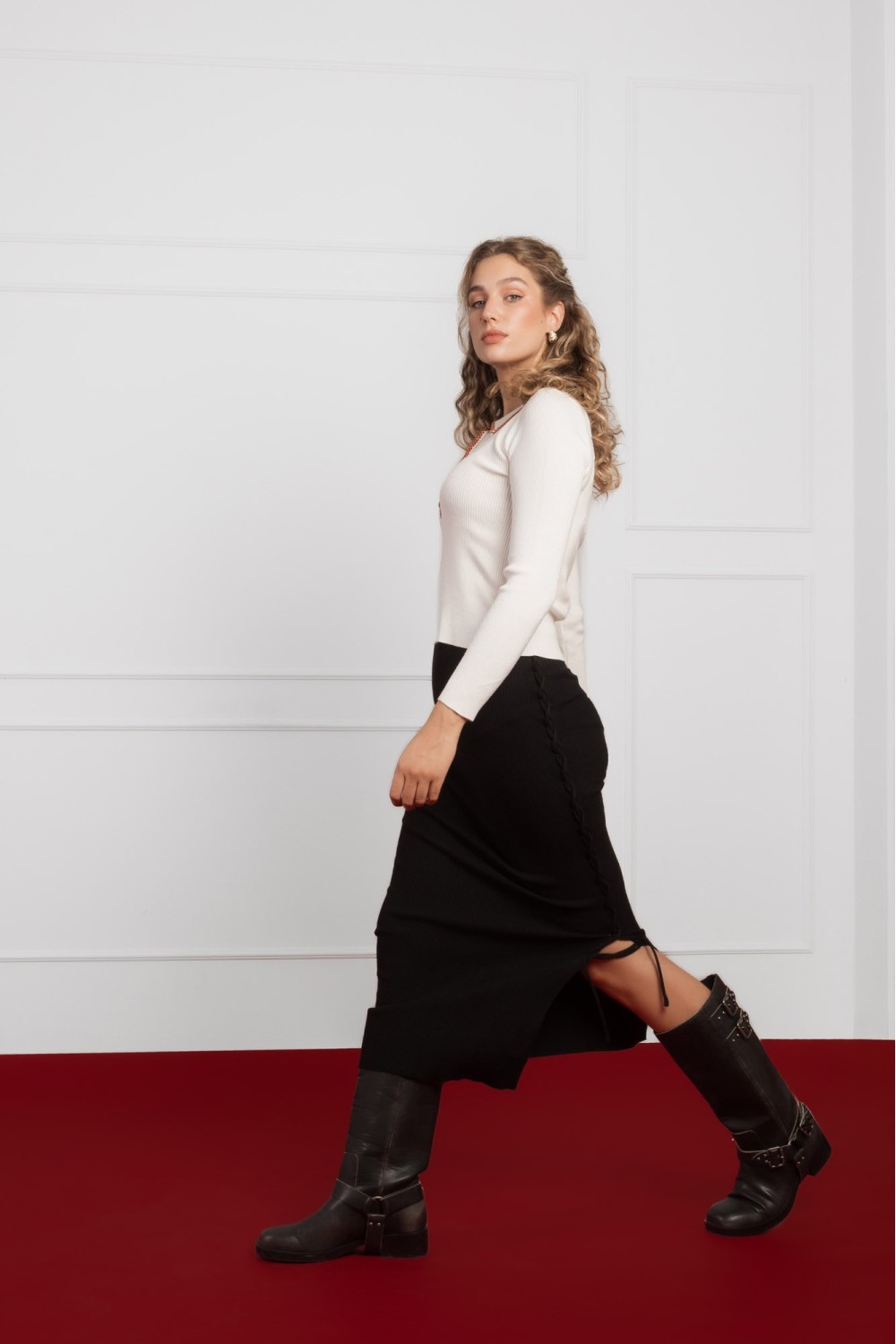 Crna midi suknja od umjetne kože koja istovremeno izgleda elegantno i moderno. Zahvaljujući rastezljivom i udobnom materijalu, lako se prilagođava figuri i idealna je za dnevne i večernje ko..