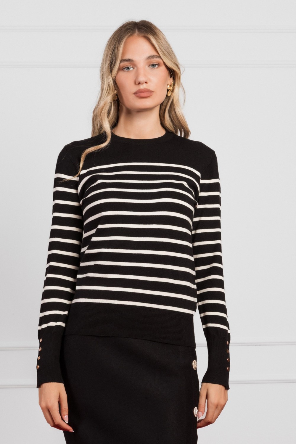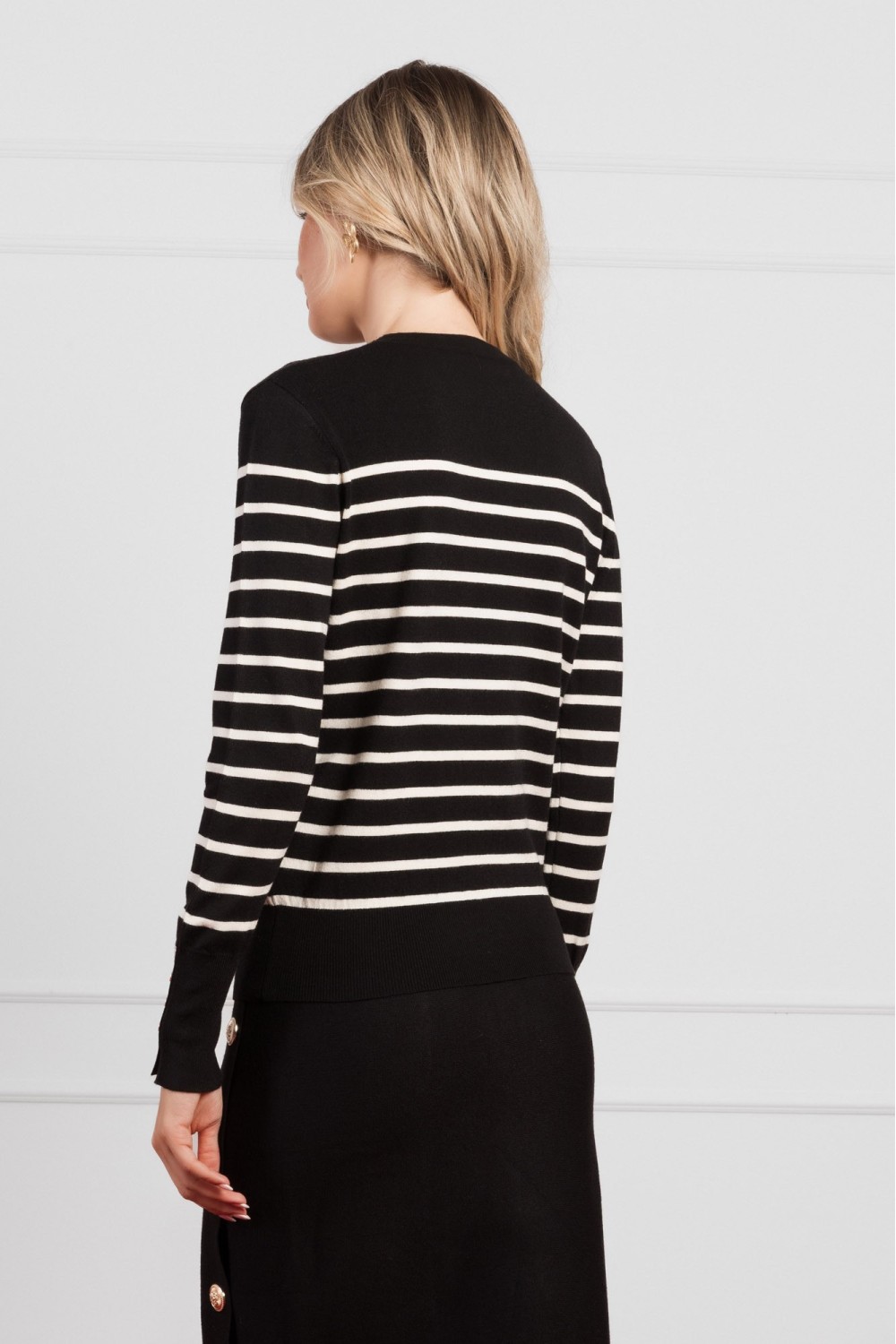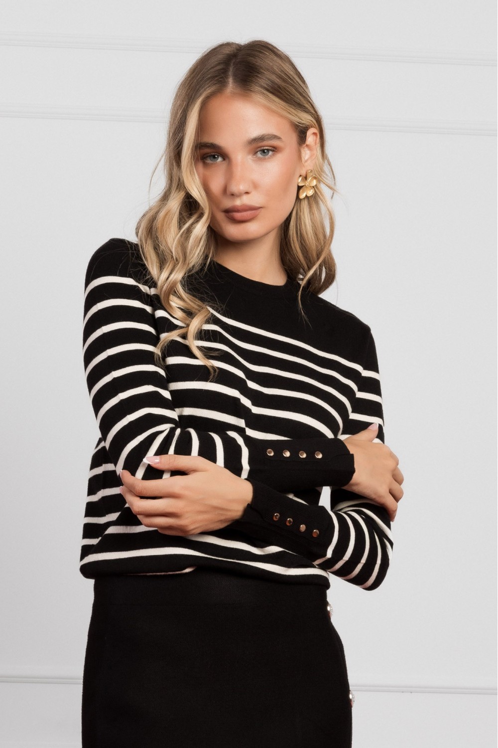 Crna košulja dugih rukava izrađena od laganog materijala s prozirnim efektom i decentnim sjajem. Ukrašena je suptilnim prugama s dodacima sitnih šljokica koje stvaraju elegantan i svečan izg..