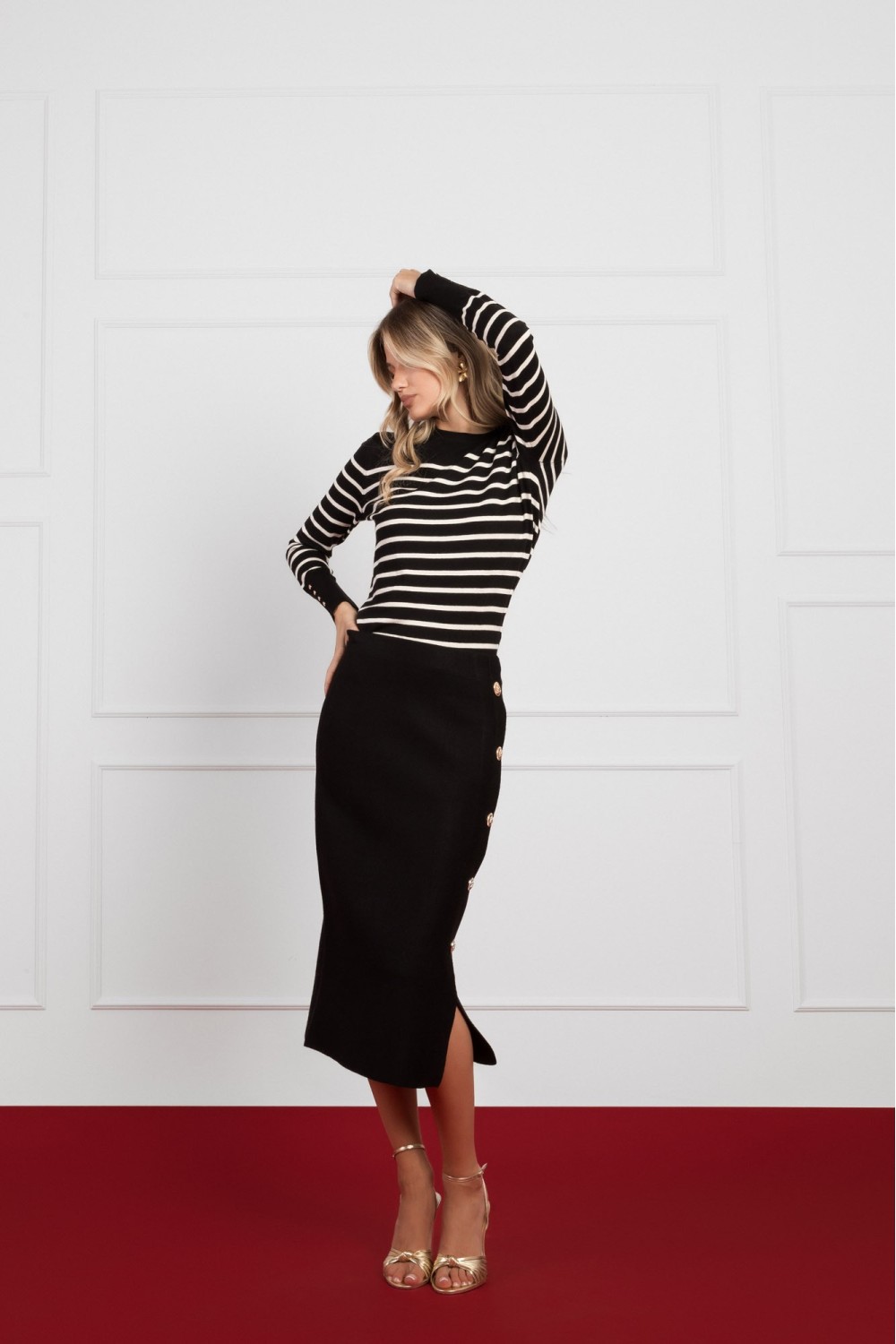 Crna plisirana suknja s bijelim točkicama donosi retro šarm u modernu garderobu. Klasičan polka dot uzorak uvijek je u trendu, a plisirani kroj lijepo prati liniju tijela i daje dozu ženstve..