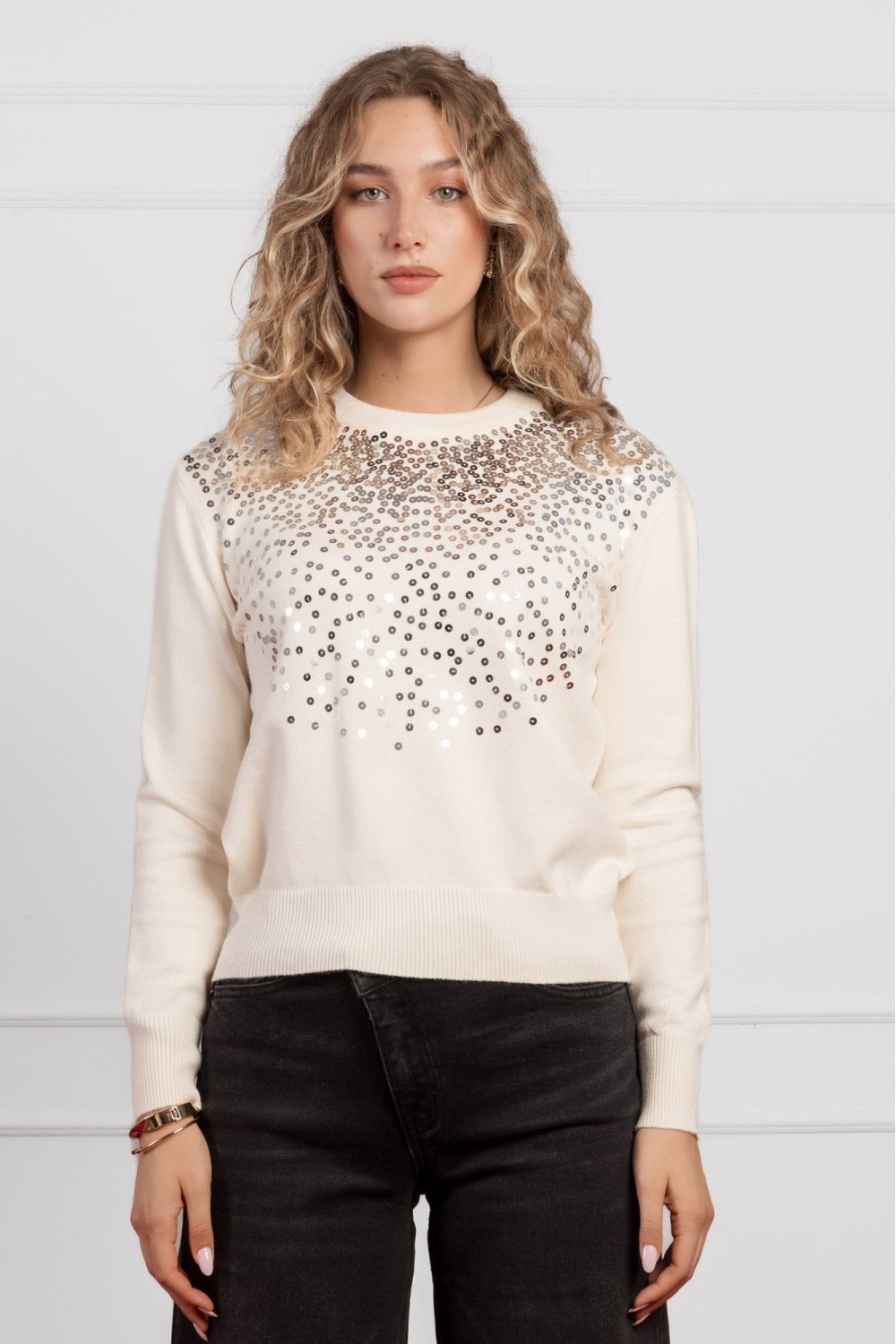 Ženski pleteni set u sivoj nijansi sastoji se od udobnih hlača s elastičnim pojasom i vezicom te klasičnog pulovera s decentnim zlatnim detaljem na rubu. Mekana i prozračna tkanina pruža udo..