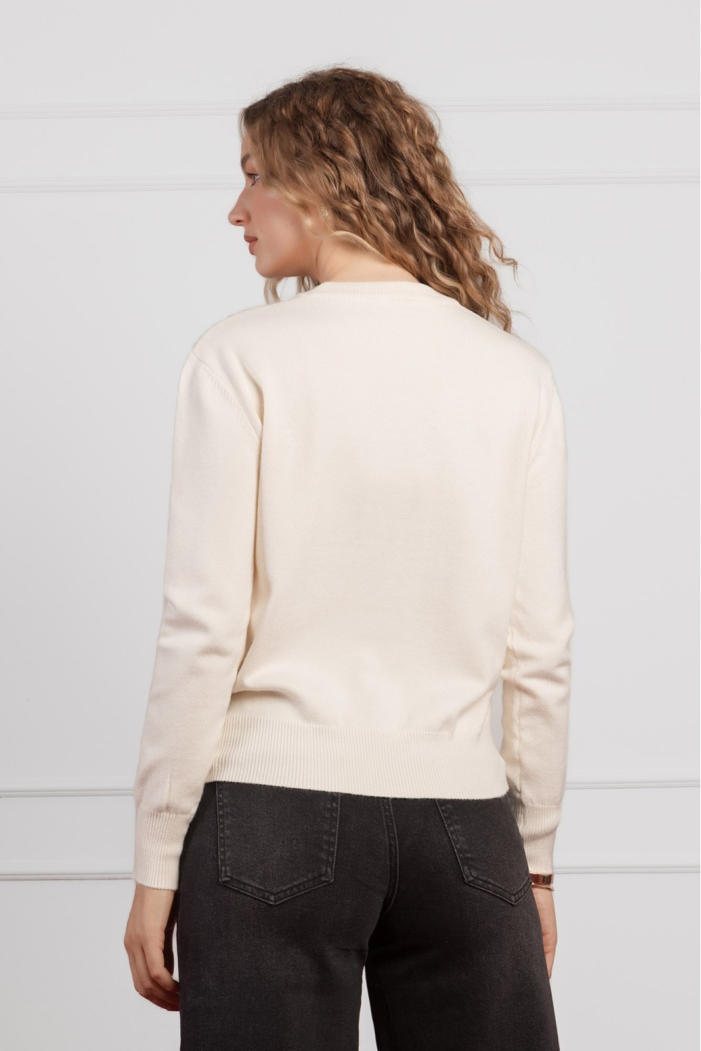 Crvena ženska vesta dugih rukava s modernim detaljem – ukrasnim zlatnim gumbima na ramenu. Rebrasti uzorak pruža dodatnu elastičnost i udobnost, dok je boja idealna za jesensko-zimske kombin..