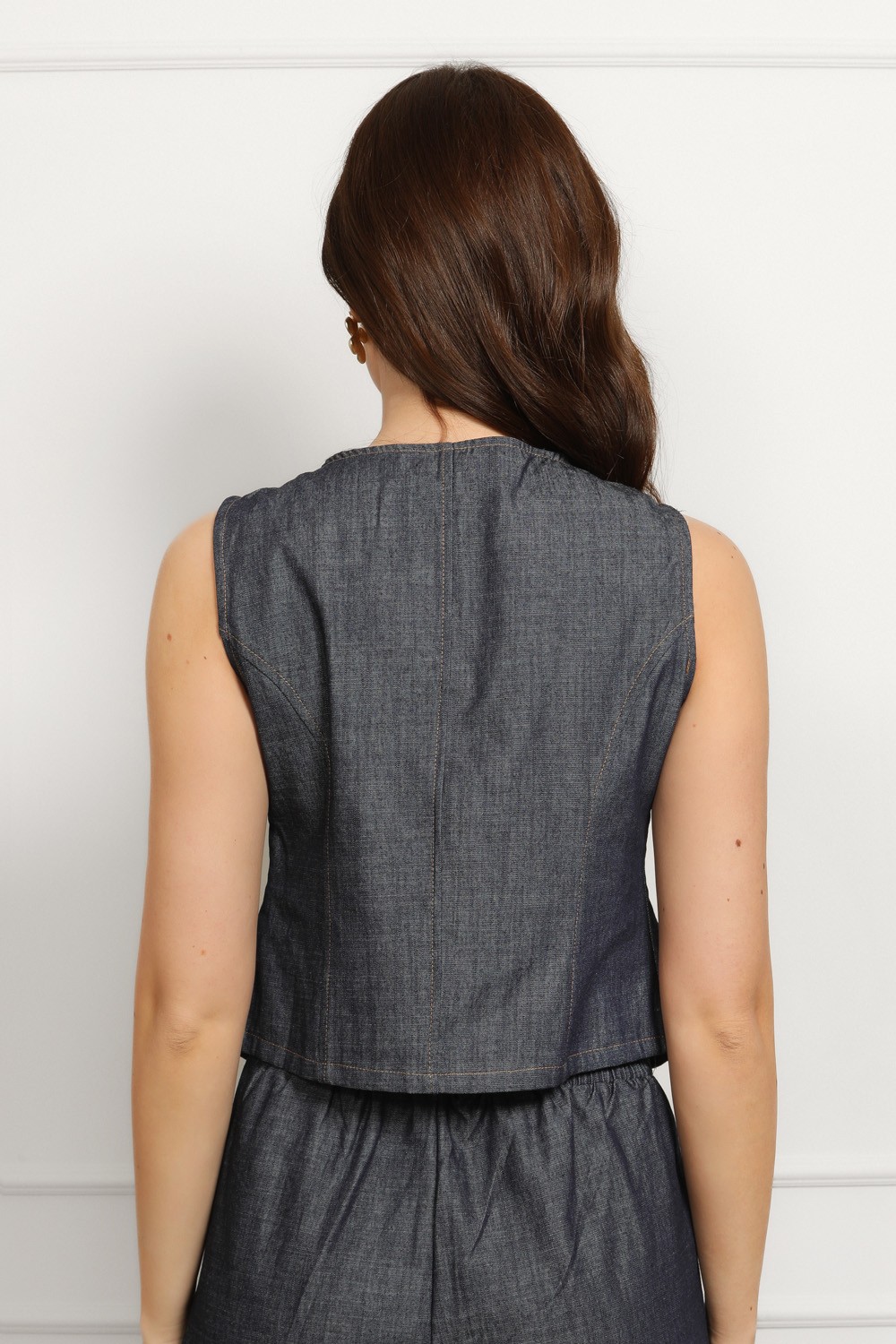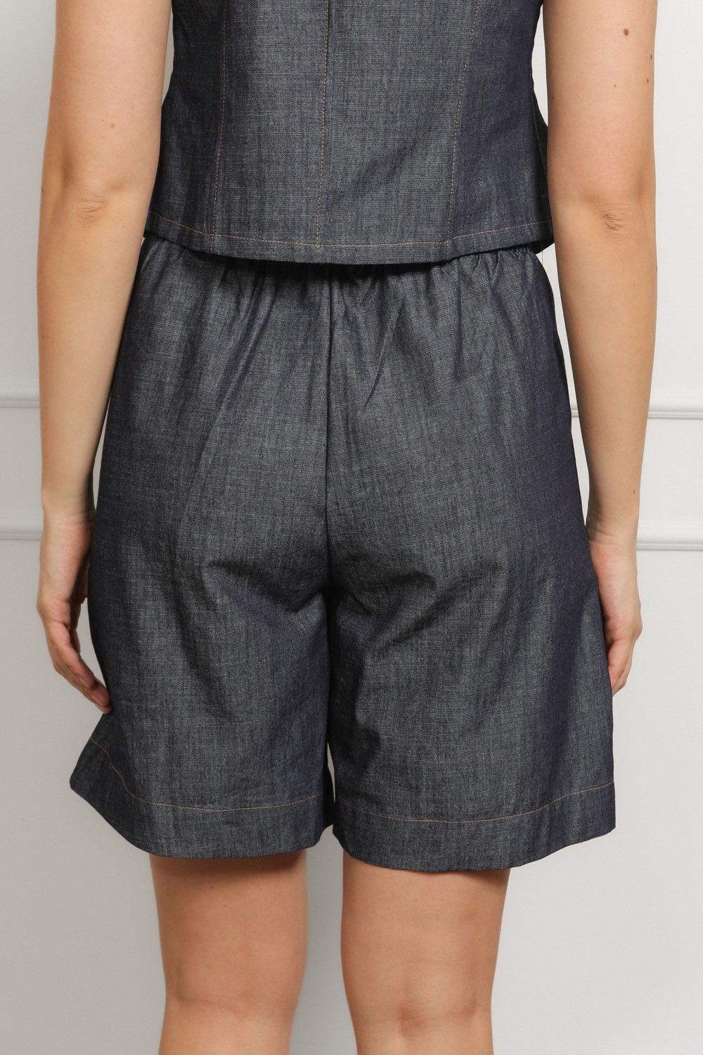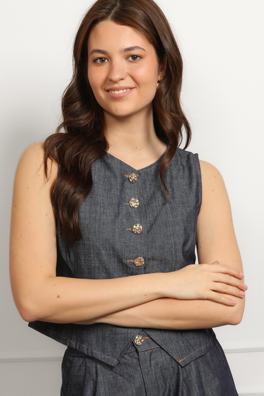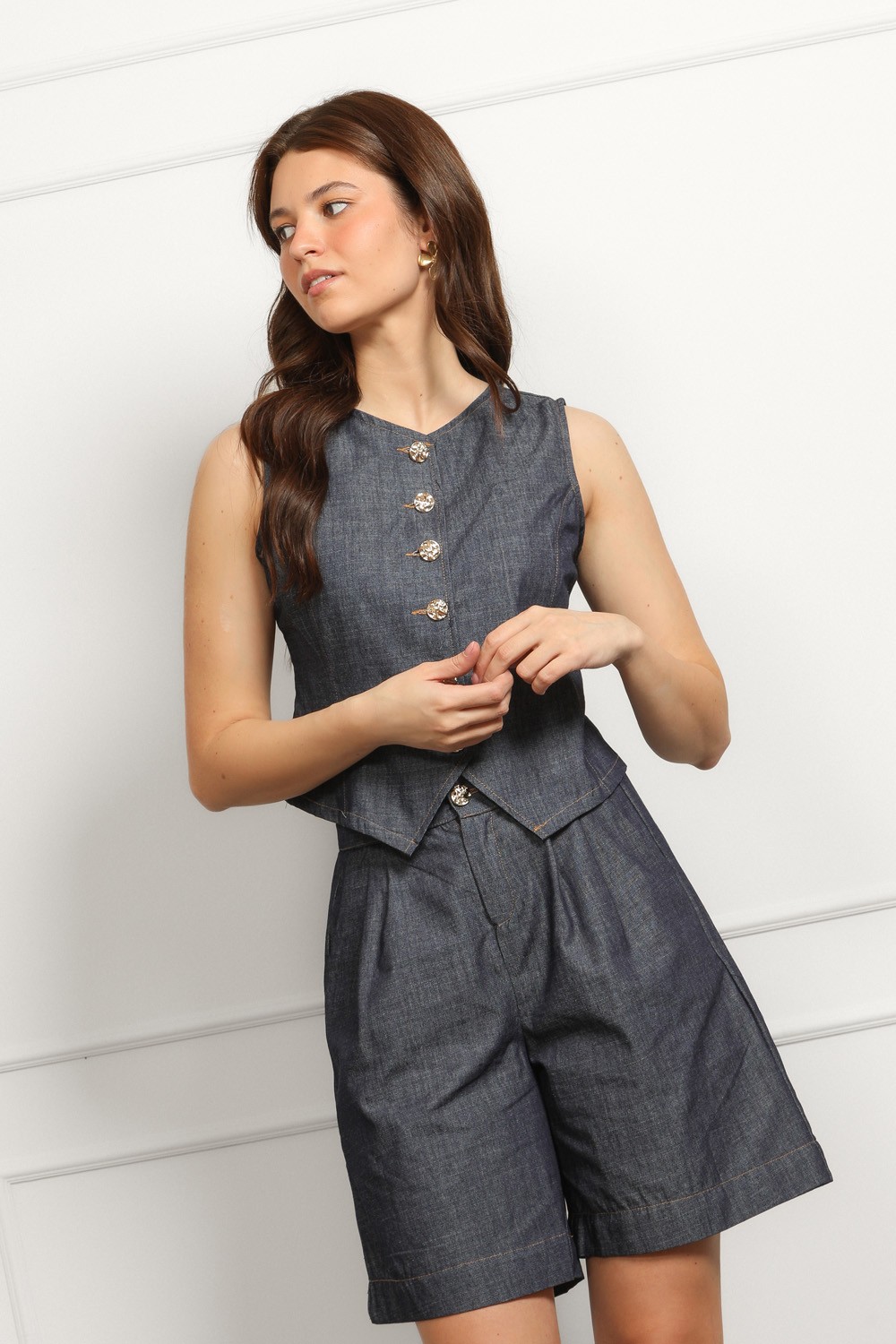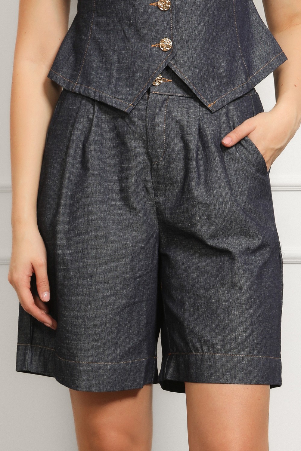 Efektan ženski komplet od laganog tamnog denima koji spaja eleganciju i trend detalje u jednom outfitu. Prsluk asimetričnog kroja s naglašenim zlatnim gumbima daje dozu statement izgleda, dok kratke hlače visokog struka s naborima sprijeda lijepo oblikuju siluetu i osiguravaju udobnost.