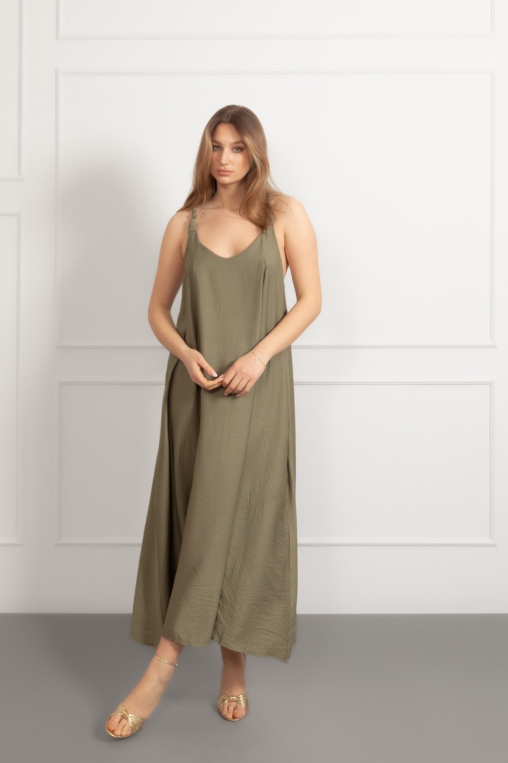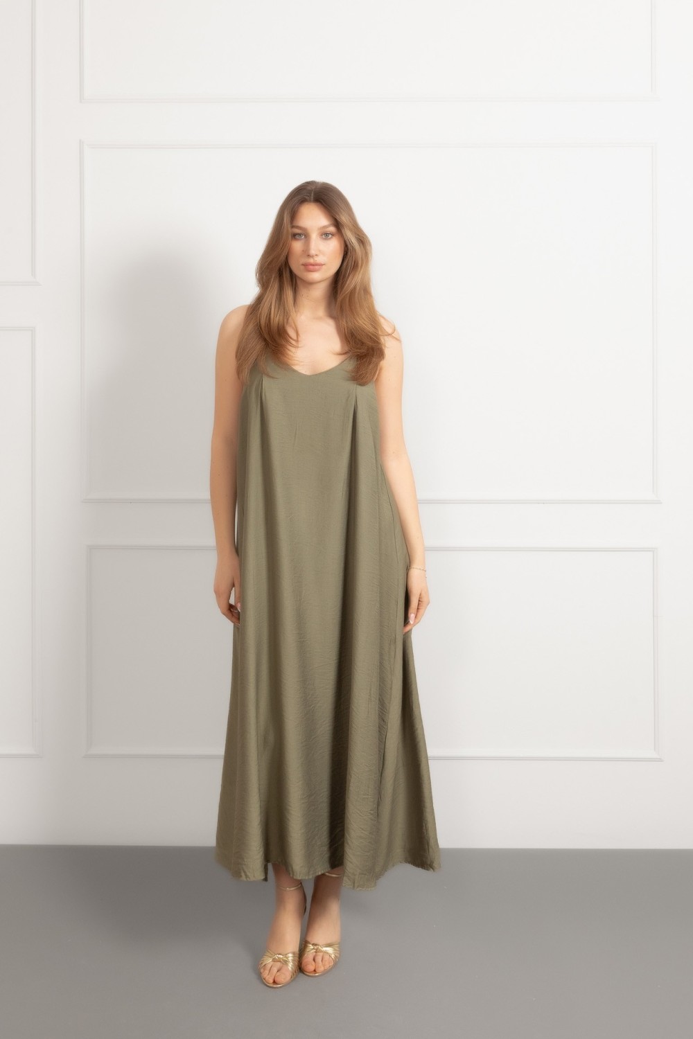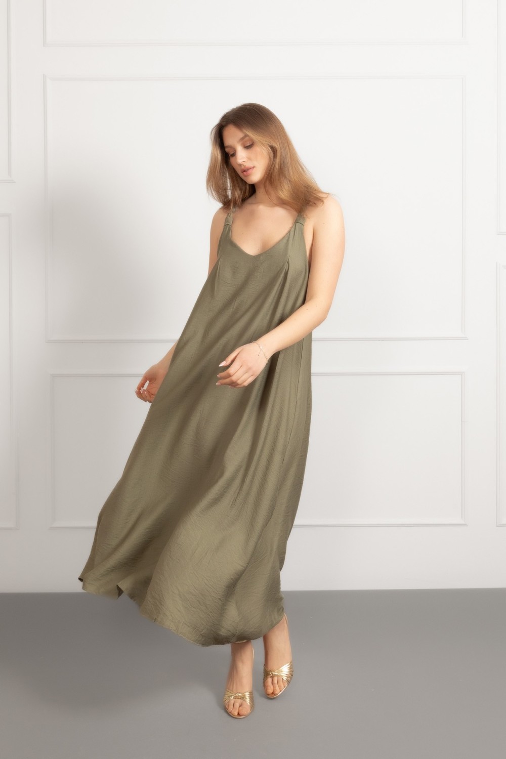Elegantna midi haljina u prirodnoj maslinastoj nijansi savršen je spoj ležernog i sofisticiranog stila. Kopčanje sprijeda i decentna kragna daju joj košulja karakter, dok pojas u struku nagl..
