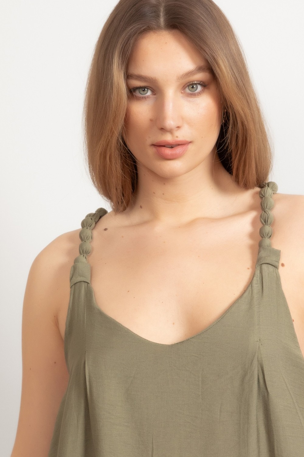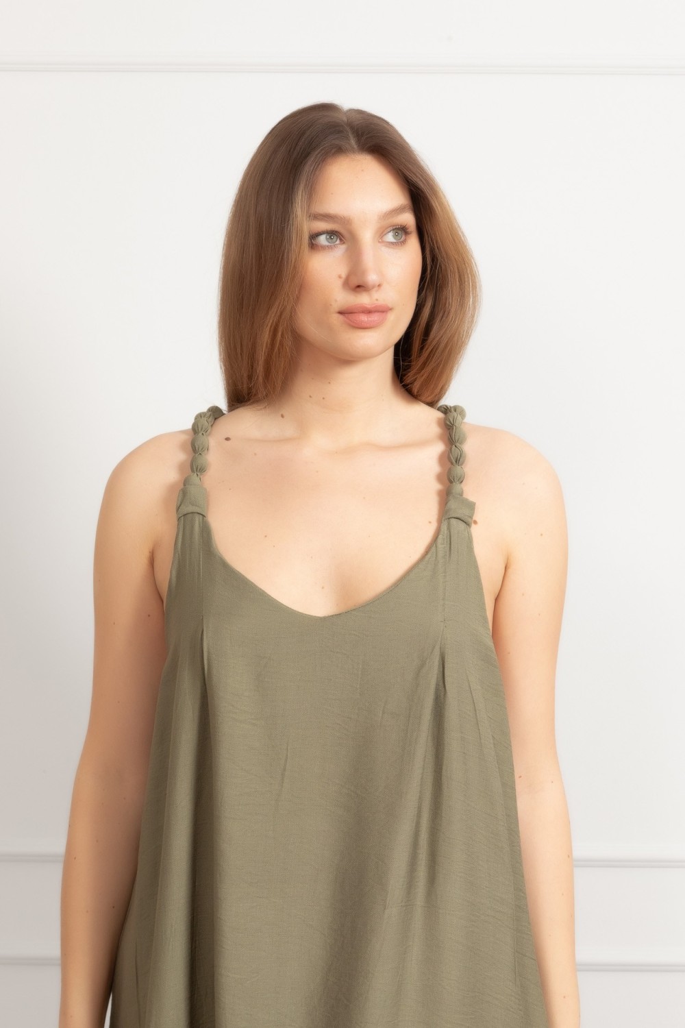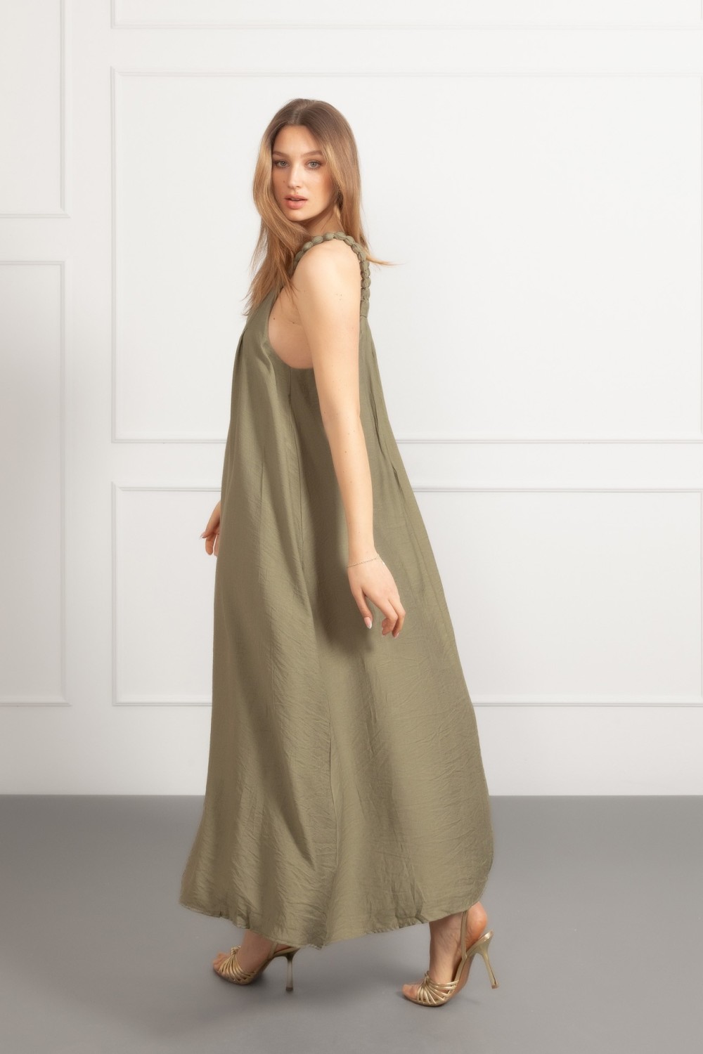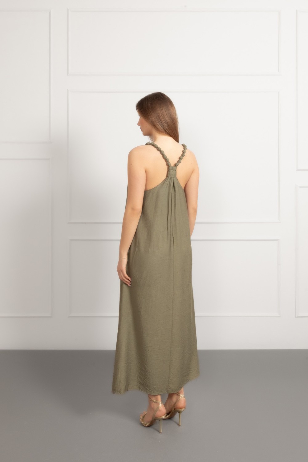 Elegantna midi haljina u prirodnoj maslinastoj nijansi savršen je spoj ležernog i sofisticiranog stila. Kopčanje sprijeda i decentna kragna daju joj košulja karakter, dok pojas u struku nagl..