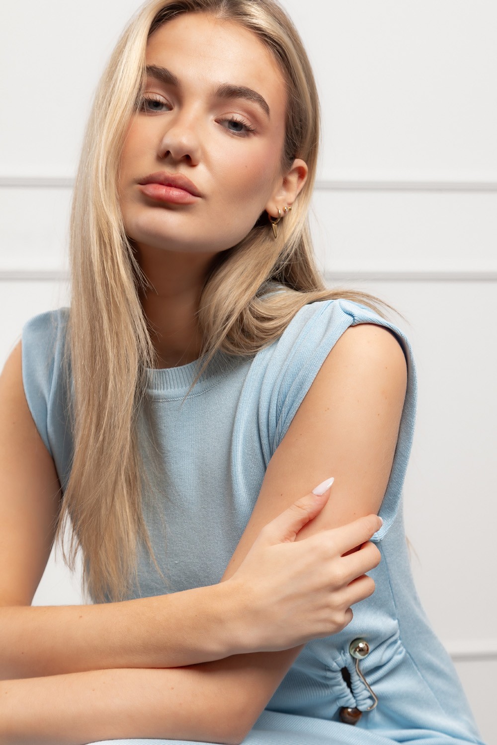 Haljina je bez rukava, ravnog i elegantnog kroja, što je čini idealnim izborom za toplije dane ili kao baza za slojevite kombinacije. Neutralna, ali osvježavajuća boja lako se uklapa u različite stilove, od ležernih dnevnih outfita do ženstvenijih večernjih kombinacija. Mekani materijal s dodatkom najlona osigurava dugotrajnost, elastičnost i lijepo pristajanje uz figuru.
