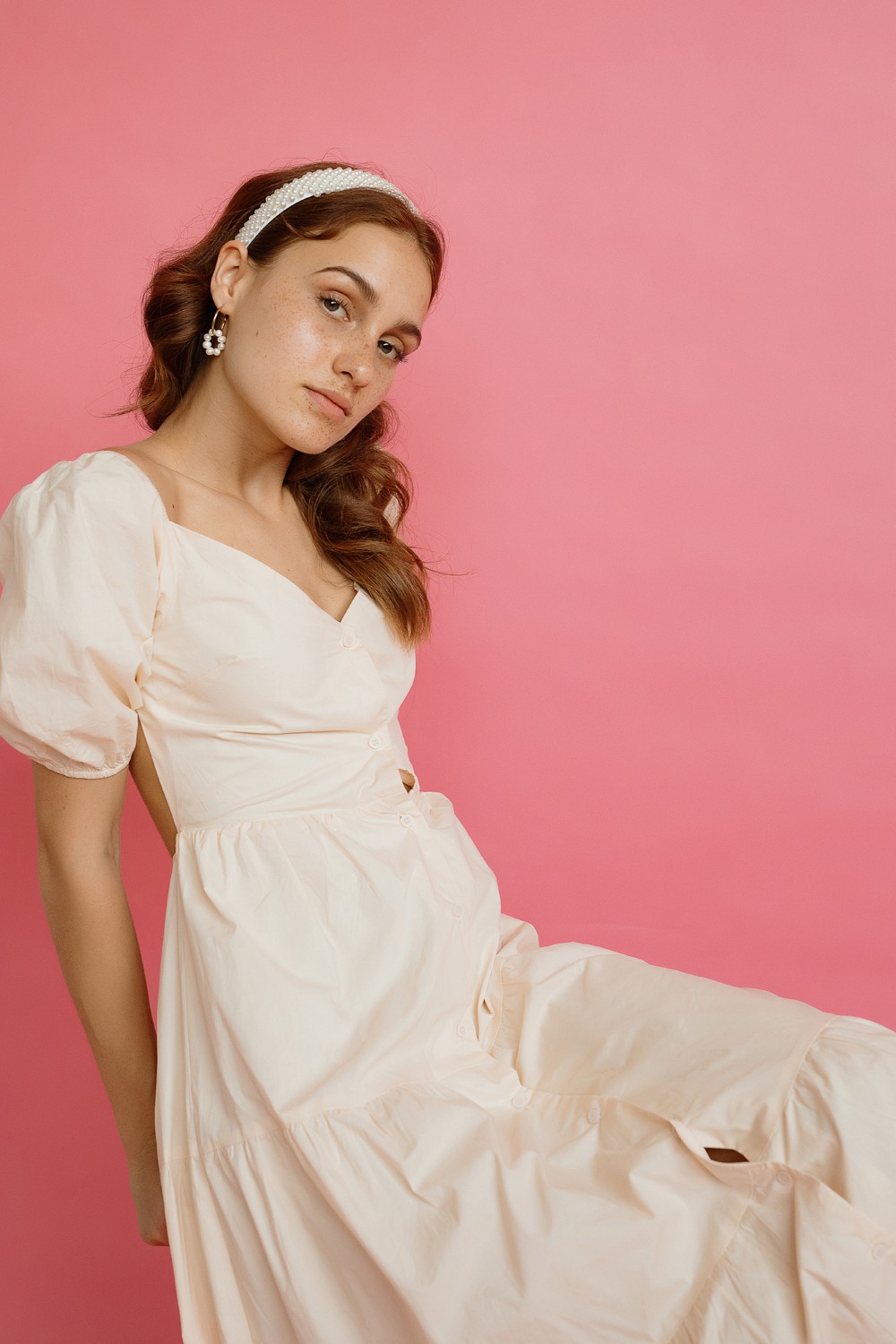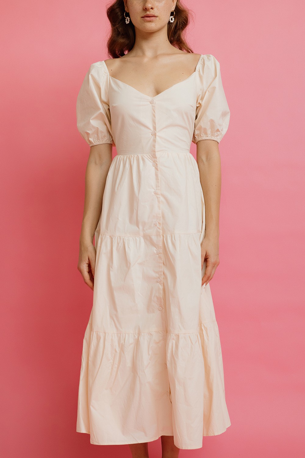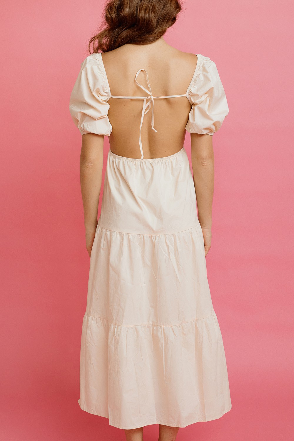 Midi haljina, u crveno-narančastoj boji. Kratkog rukava sa volanima. V-izreza i elastičnoga struka sa vezicom u istoj boji. Donji prošiveni dio sa efektom volana.-100% VISKOZAModel je visok ..