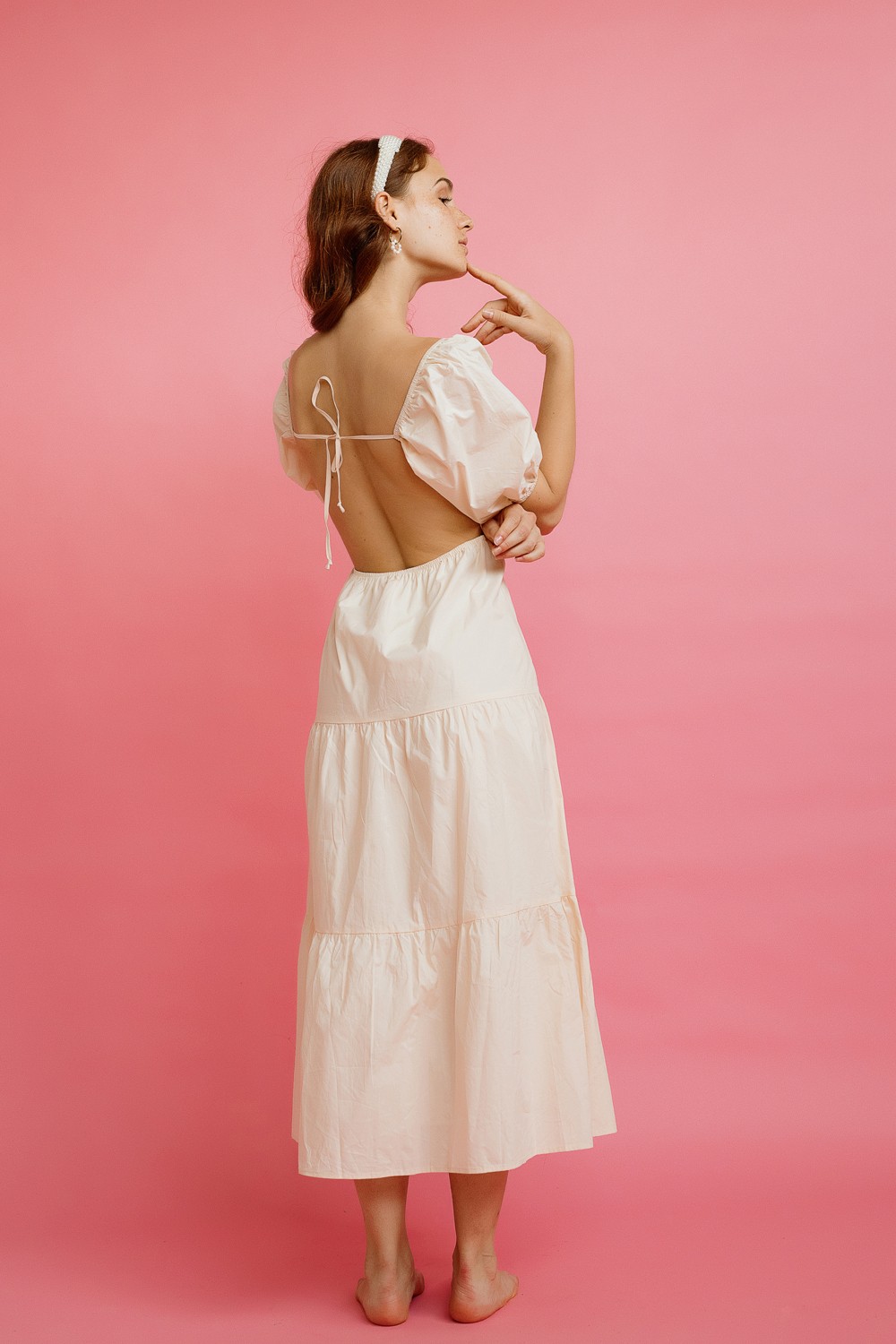 Laneni kaftan, midi dužine. Niska kragna, vezanje sprijeda utoniranim vezicama. Proizvod je univerzalne veličine. -100% LANModel je visok 180 cm i nosi veličinu M (univerzalnu veličinu)..