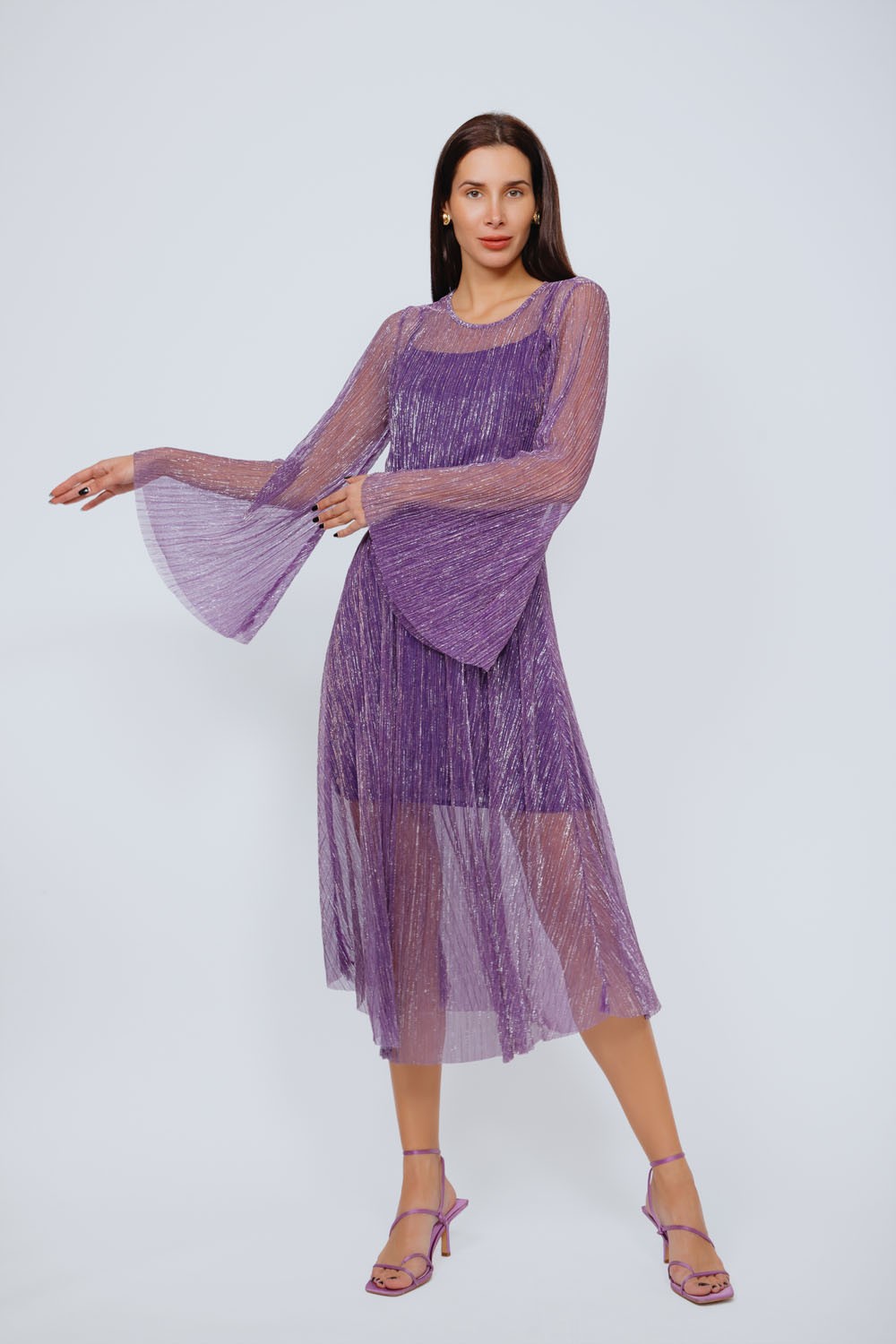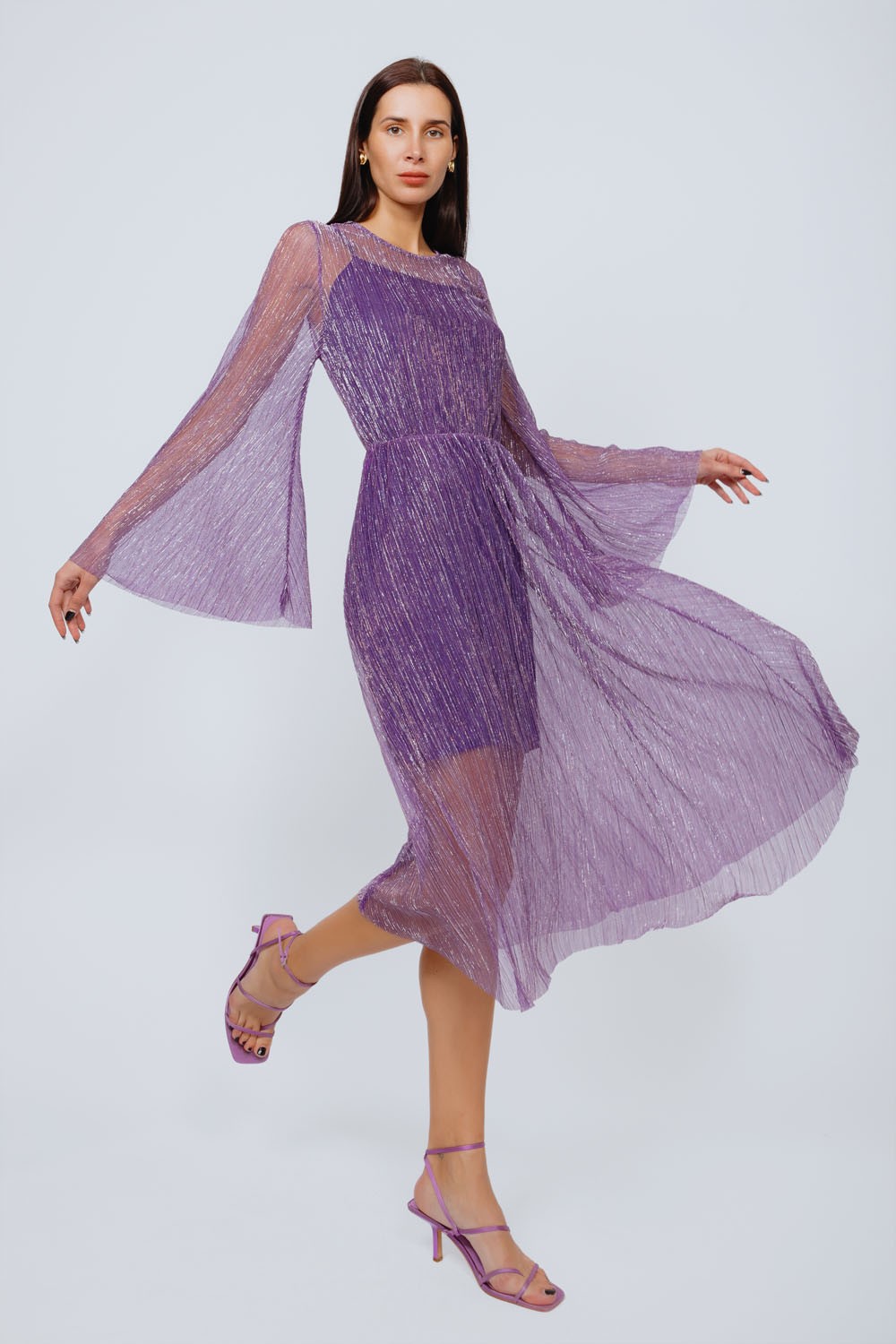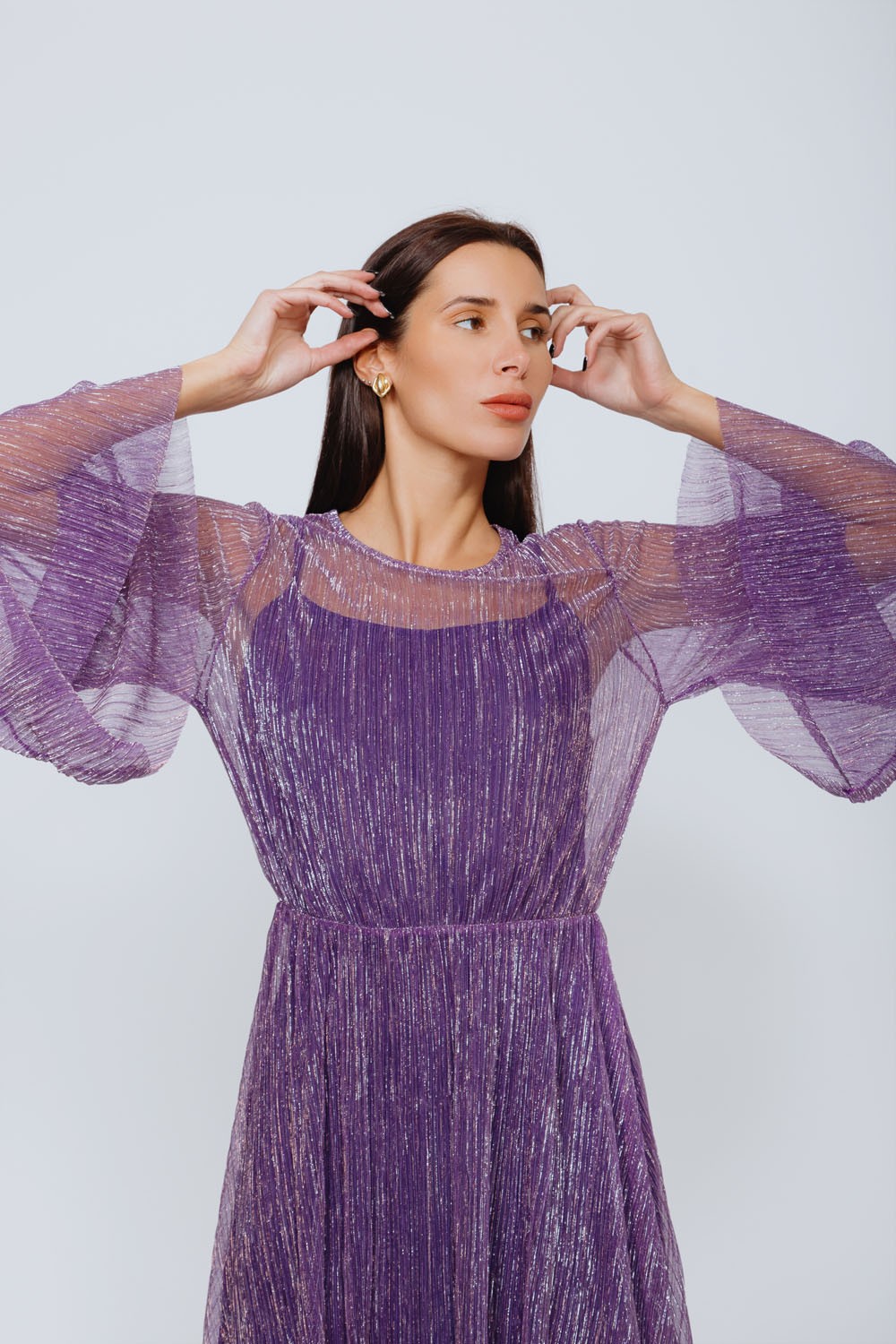 Midi haljina, 3/4 dužine rukava sa gumom oko ruba. Gornji dio poluproziran, s V izrezom sprijeda, na preklop. Elastičan struk s remenom u pojasu. U donjem dijelu podstava te prošivi s efekom..